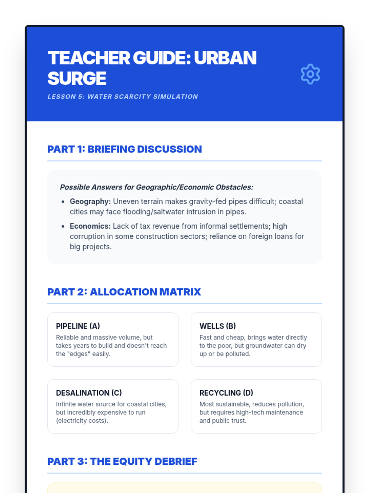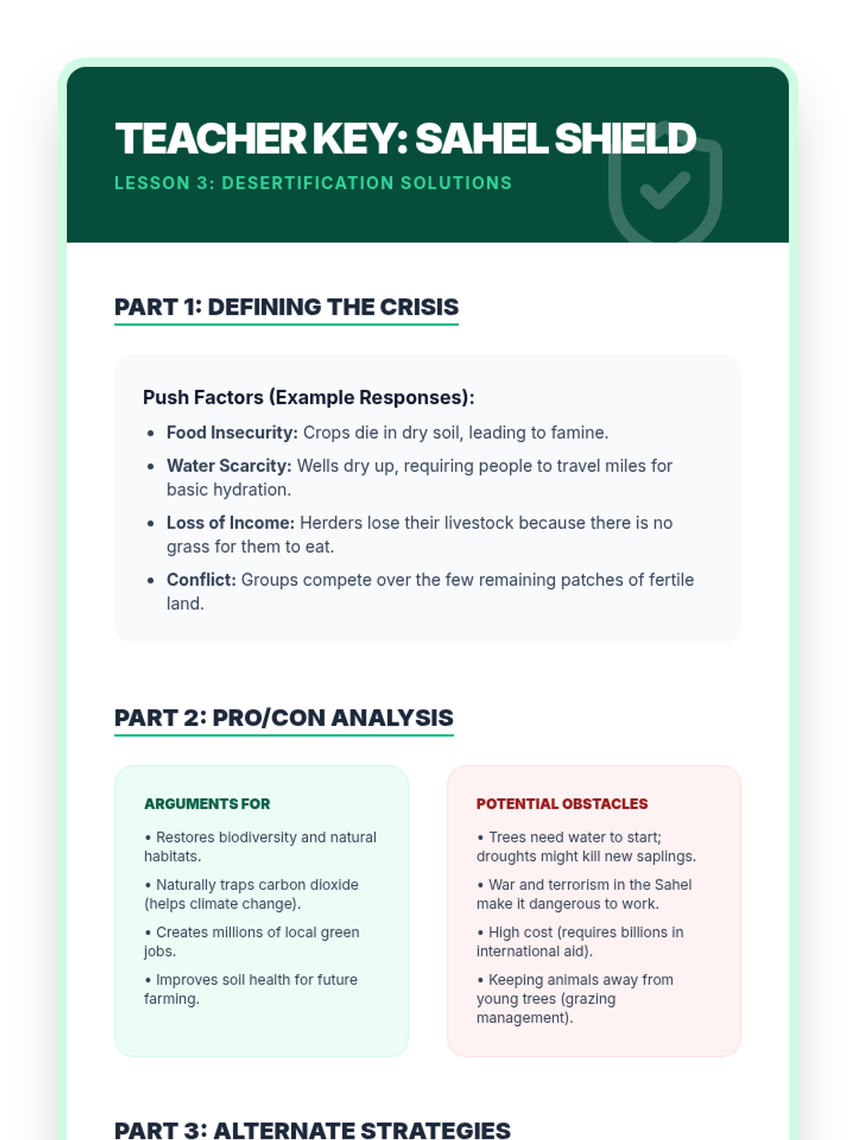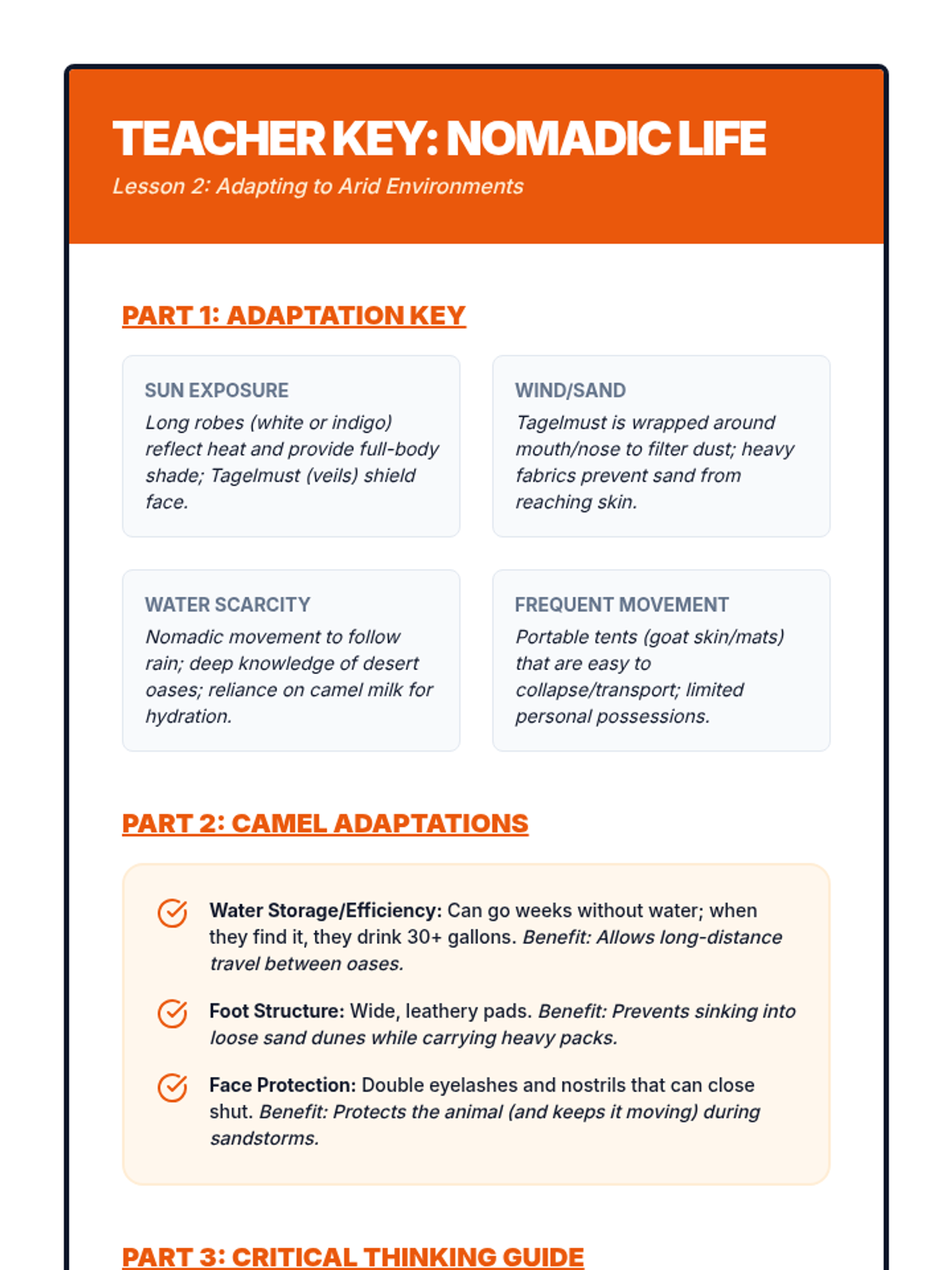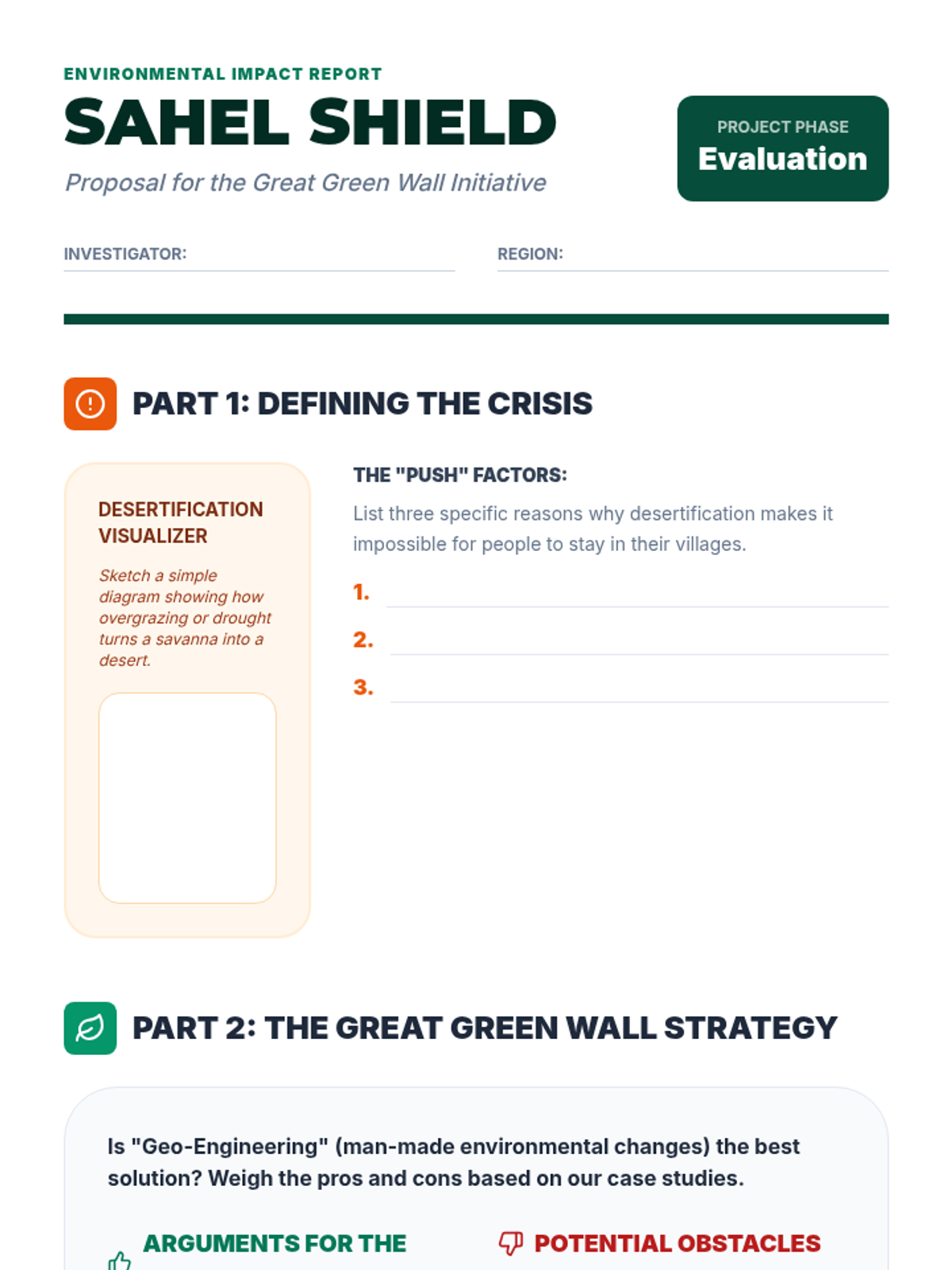 A 5-lesson 6th-grade geography sequence focusing on human-environment interaction in Africa. Students investigate how physical geography influences population density, cultural adaptations in the Sahara and Sahel, the impacts of desertification, life in the Congo Basin, and the challenges of modern urbanization.