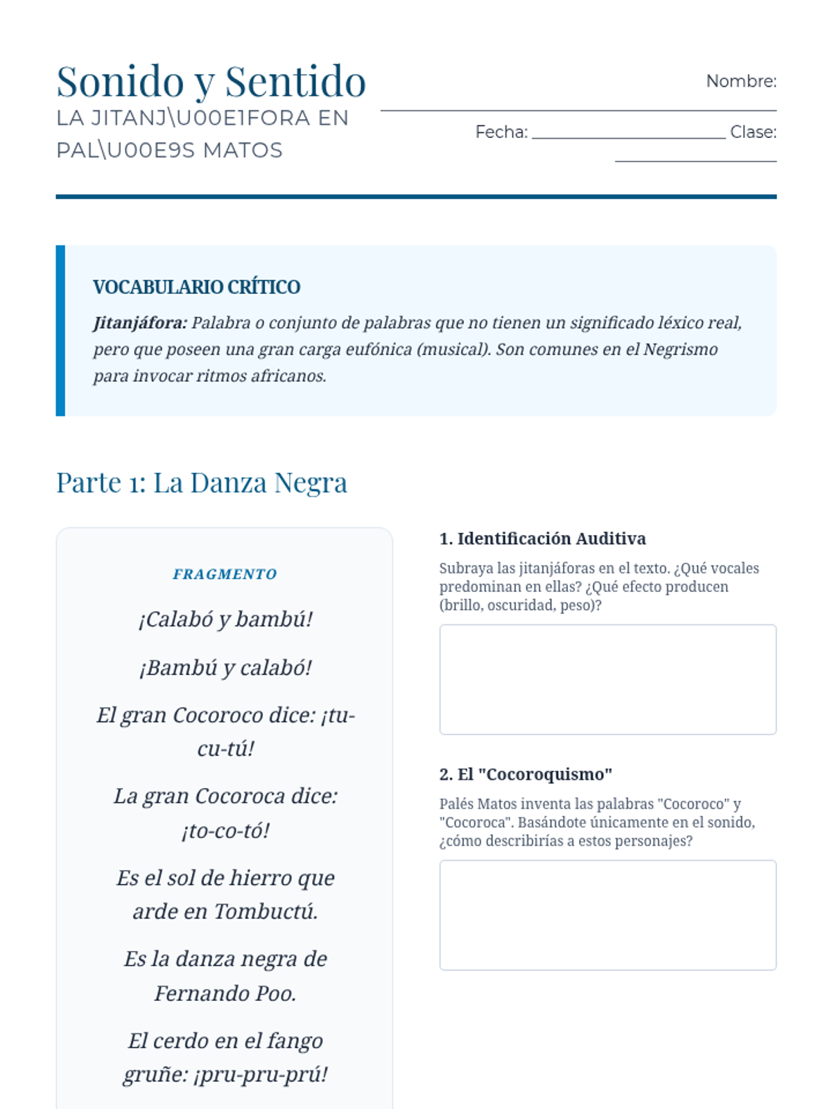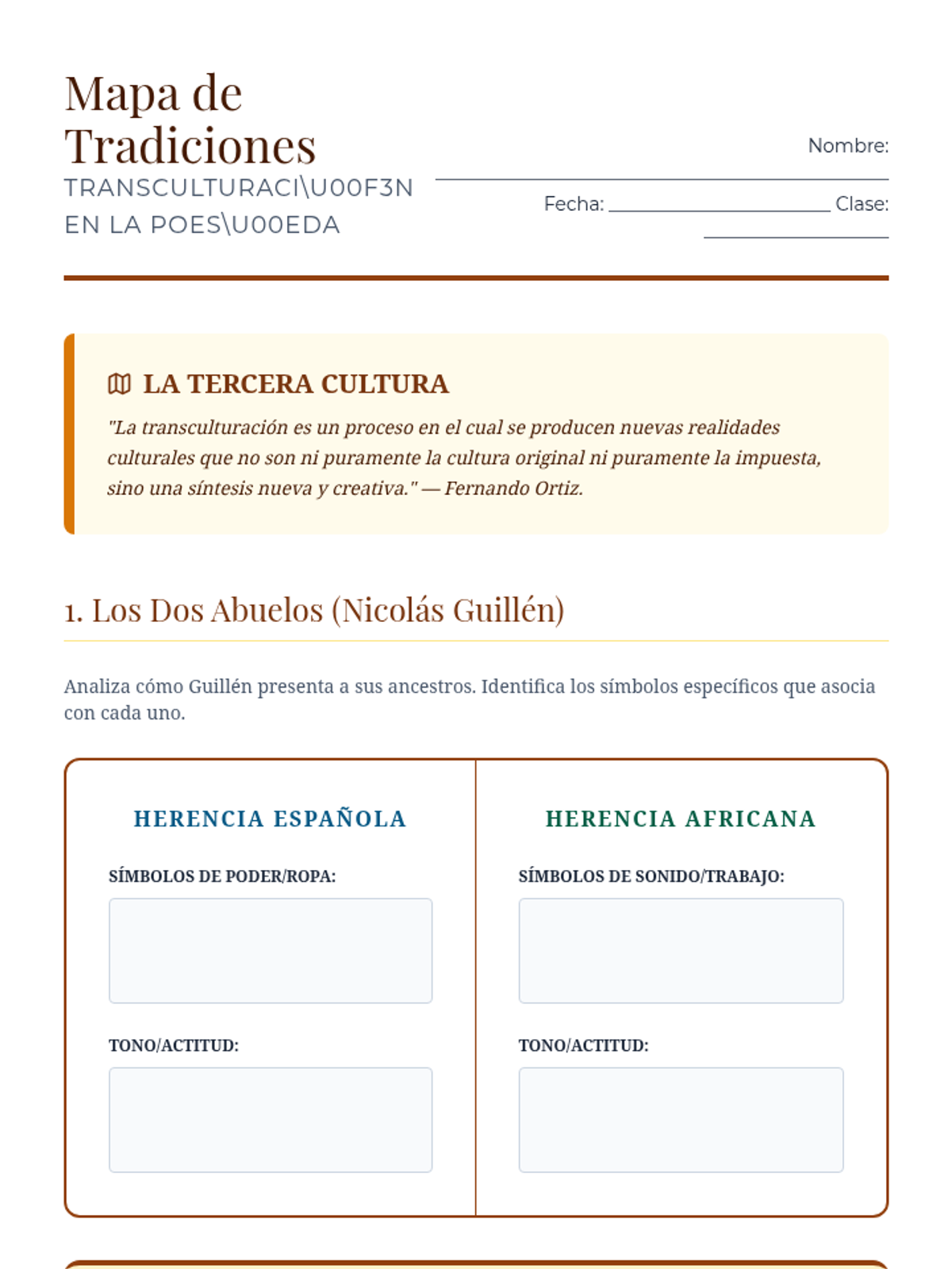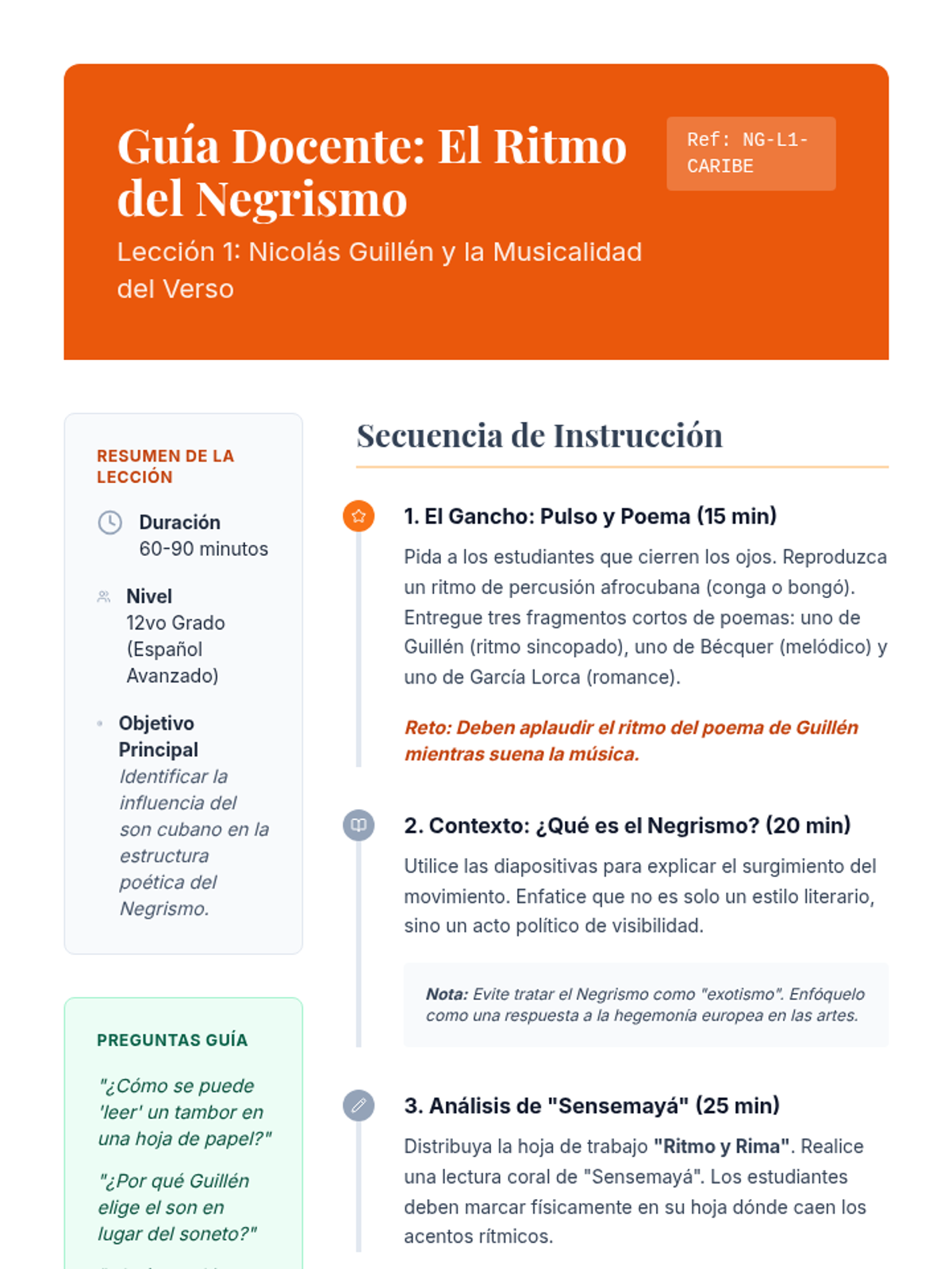 A comprehensive 12th-grade Advanced Spanish sequence exploring the Afro-Hispanic literary tradition in the Caribbean, focusing on the Negrismo movement, identity, resistance, and the concept of transculturation.