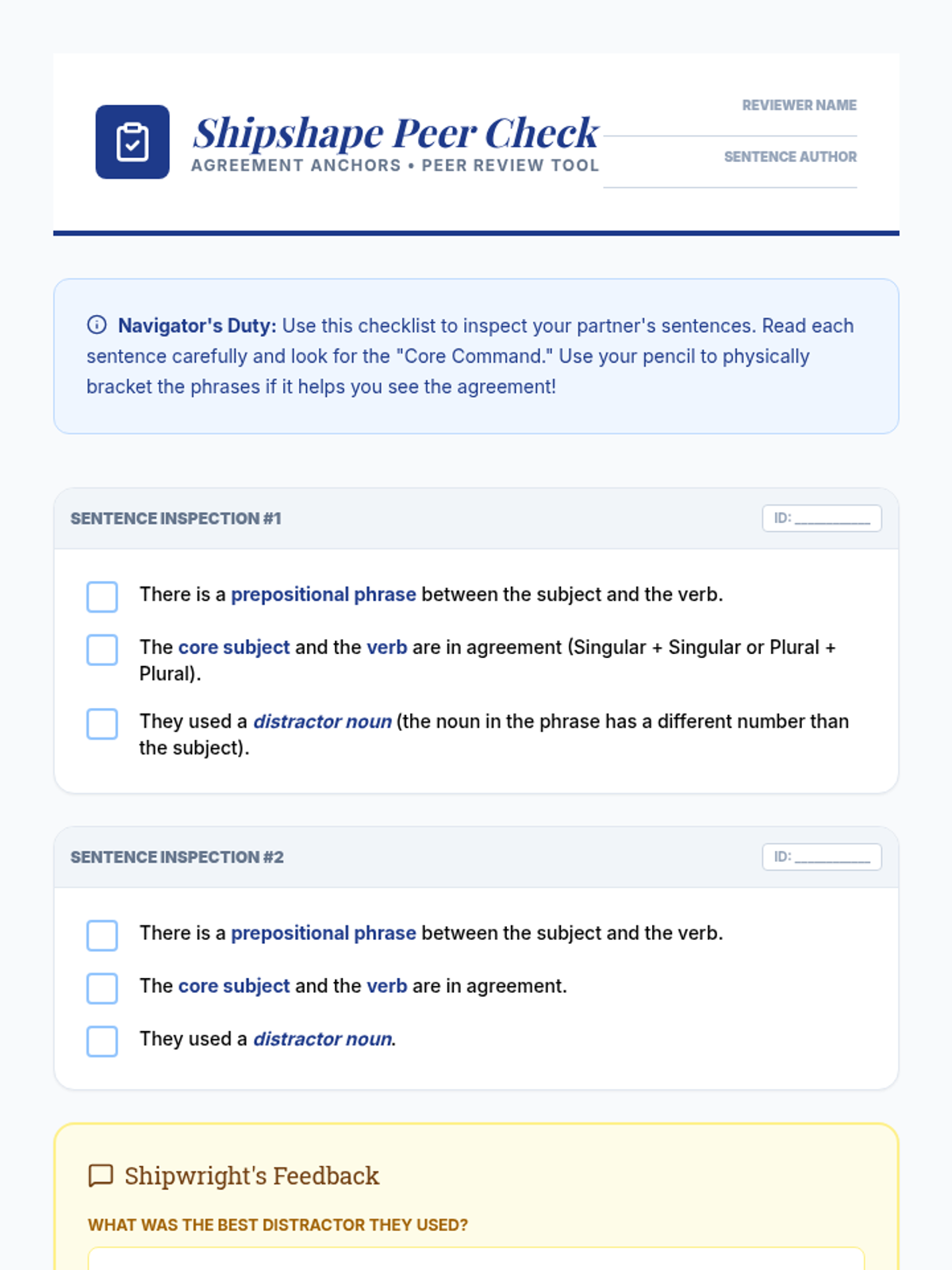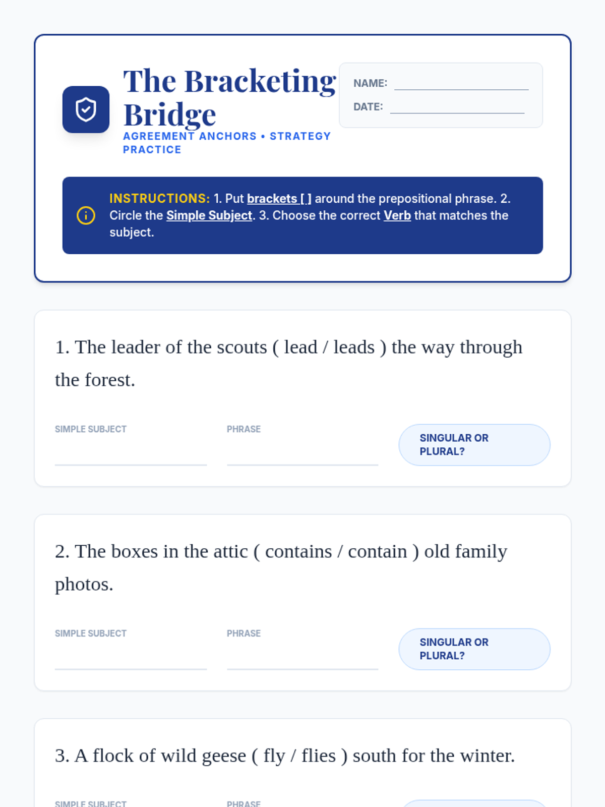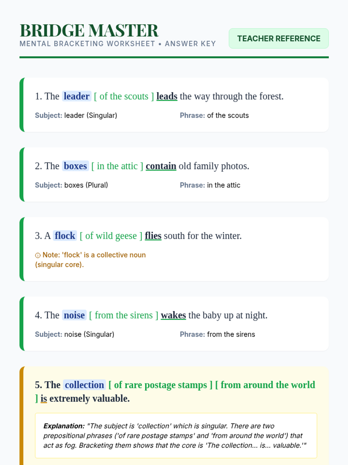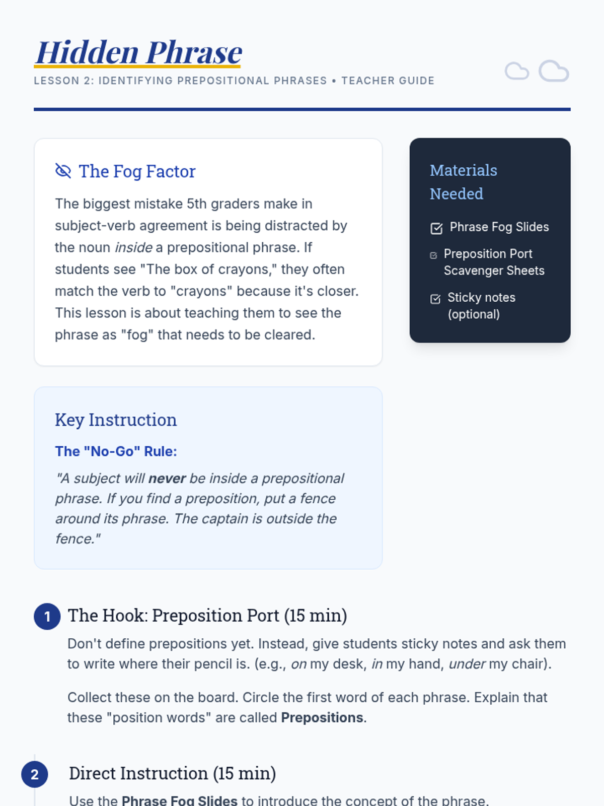 A comprehensive 5-lesson unit for 5th graders on subject-verb agreement, specifically focusing on sentences where prepositional phrases intervene between the subject and the verb. Students learn to navigate 'distractor' nouns and maintain grammatical accuracy using a 'mental bracketing' strategy.