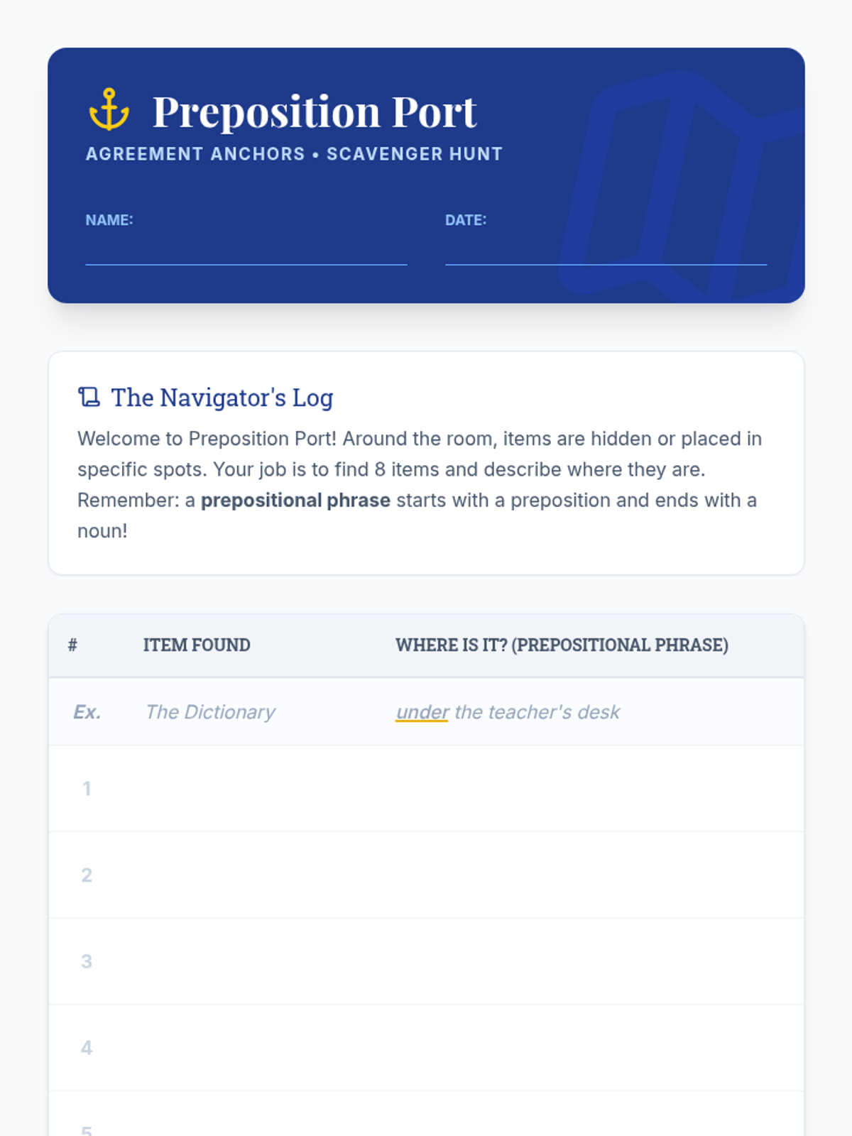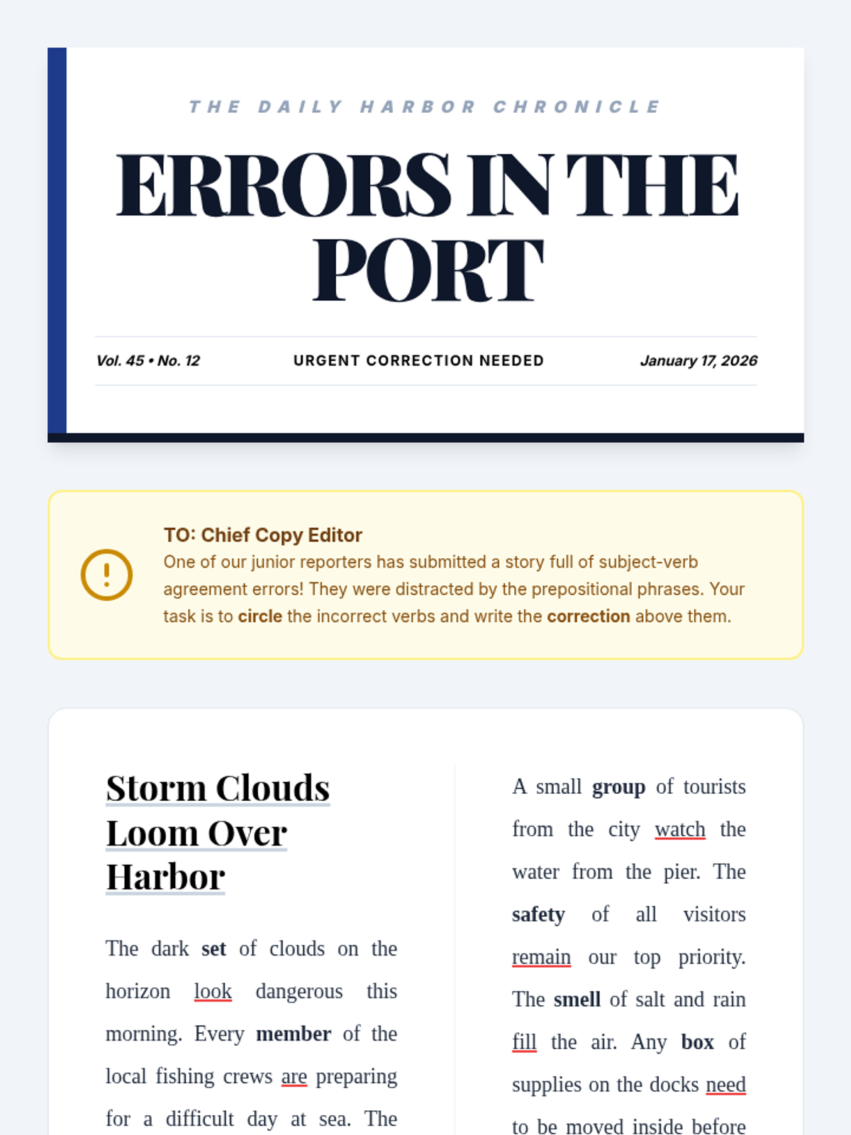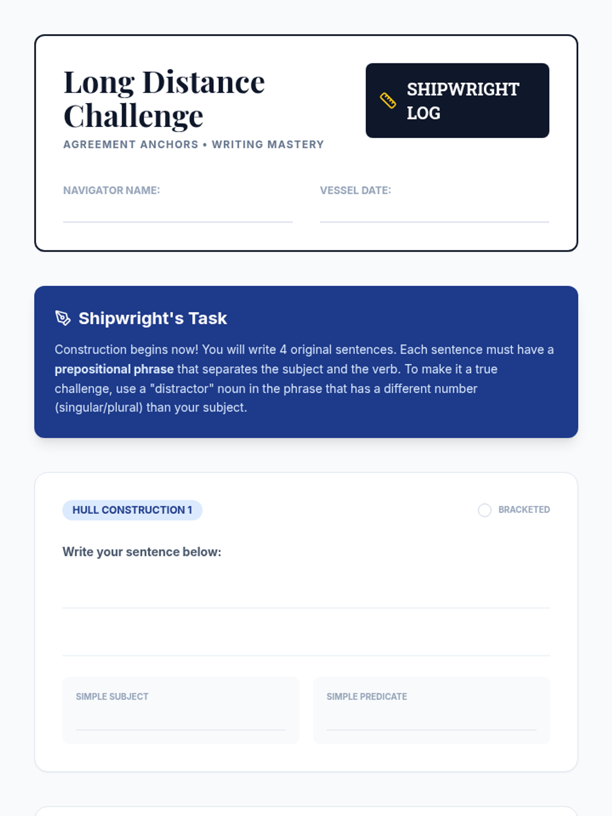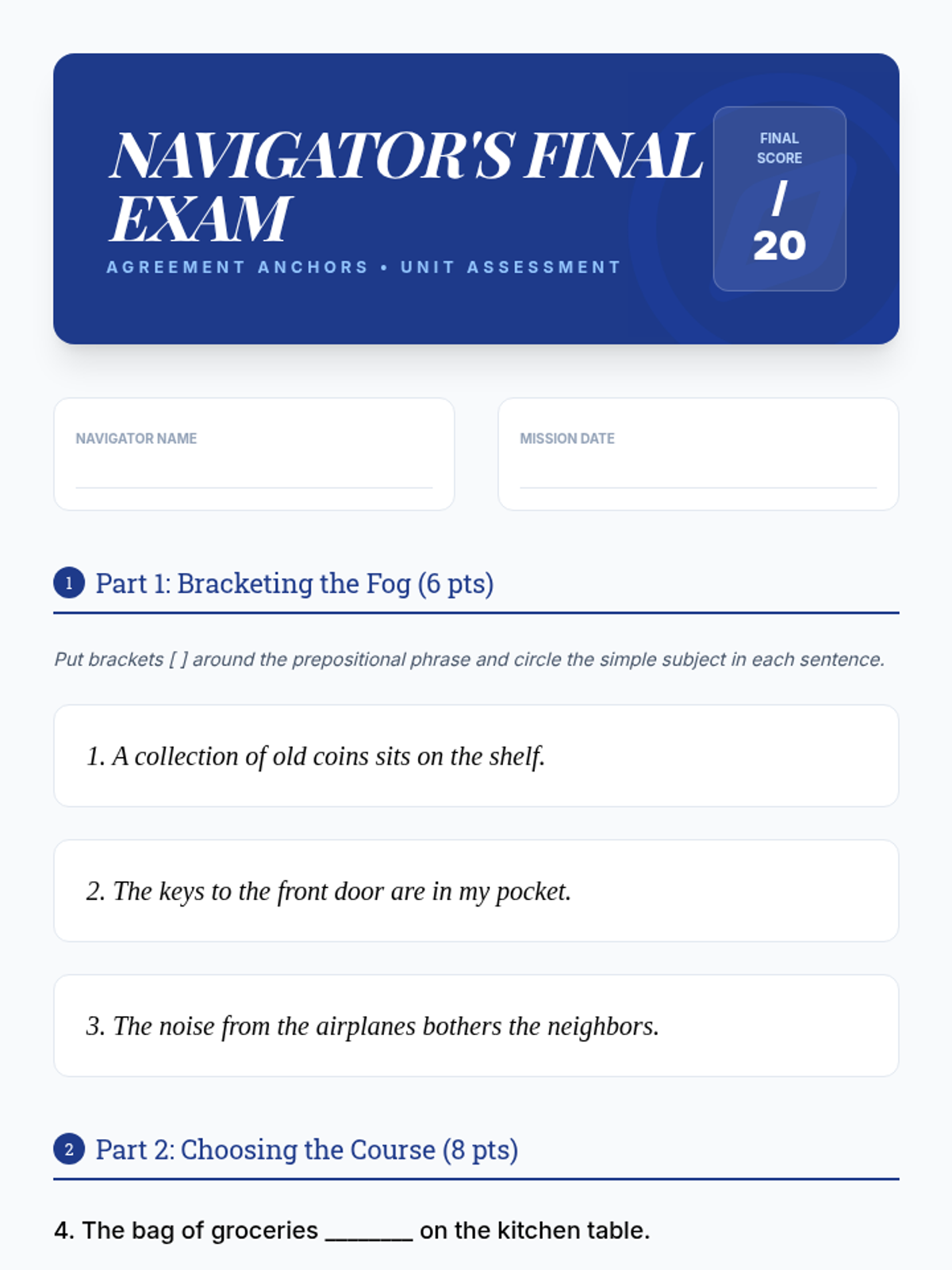 A comprehensive 5-lesson unit for 5th graders on subject-verb agreement, specifically focusing on sentences where prepositional phrases intervene between the subject and the verb. Students learn to navigate 'distractor' nouns and maintain grammatical accuracy using a 'mental bracketing' strategy.