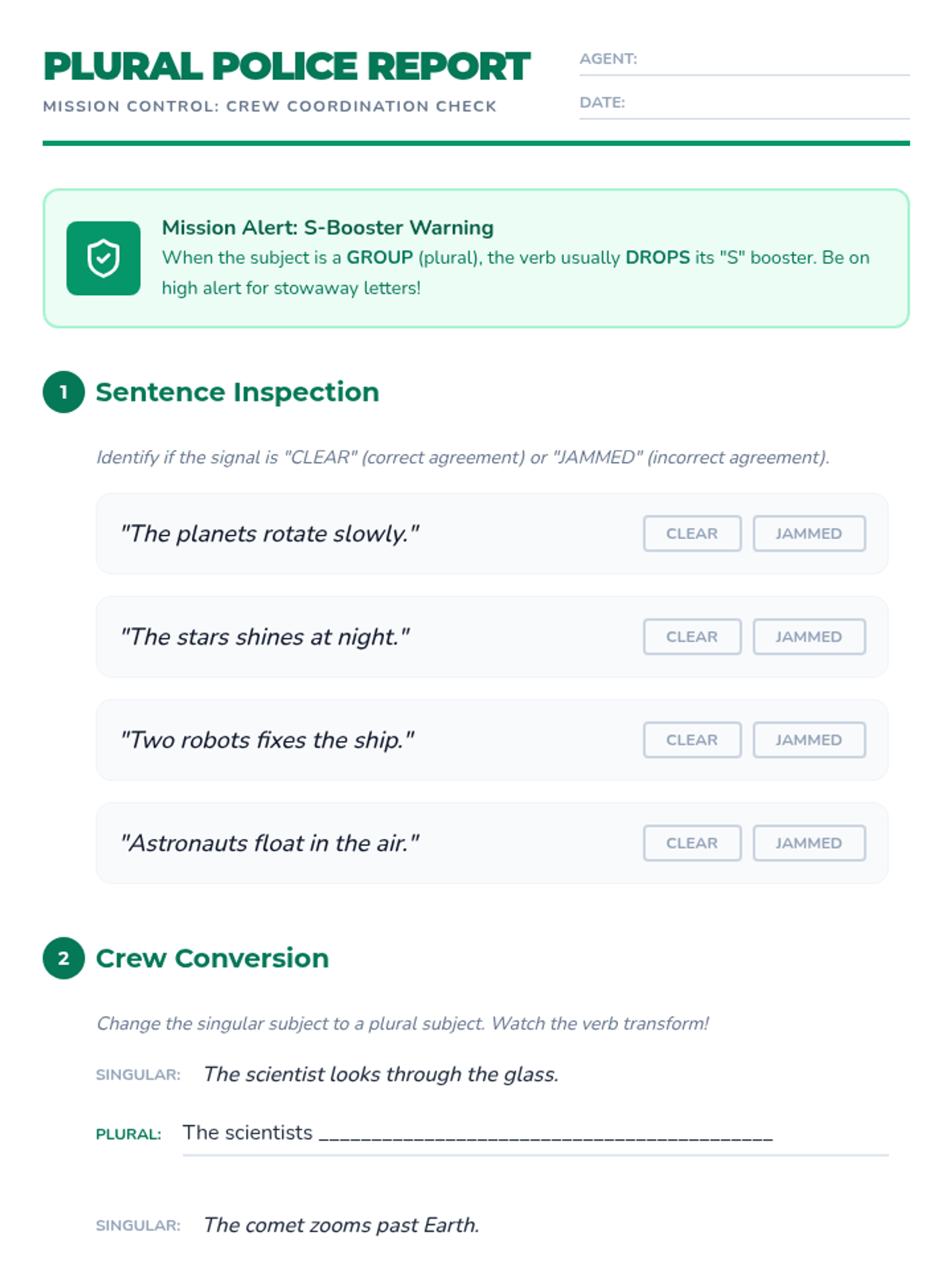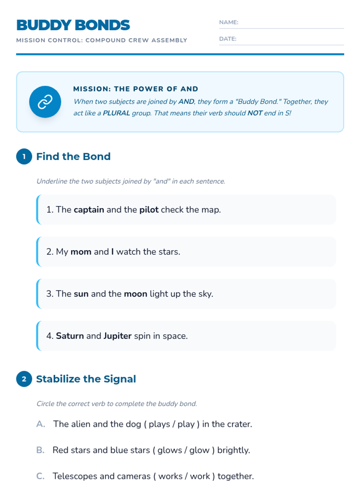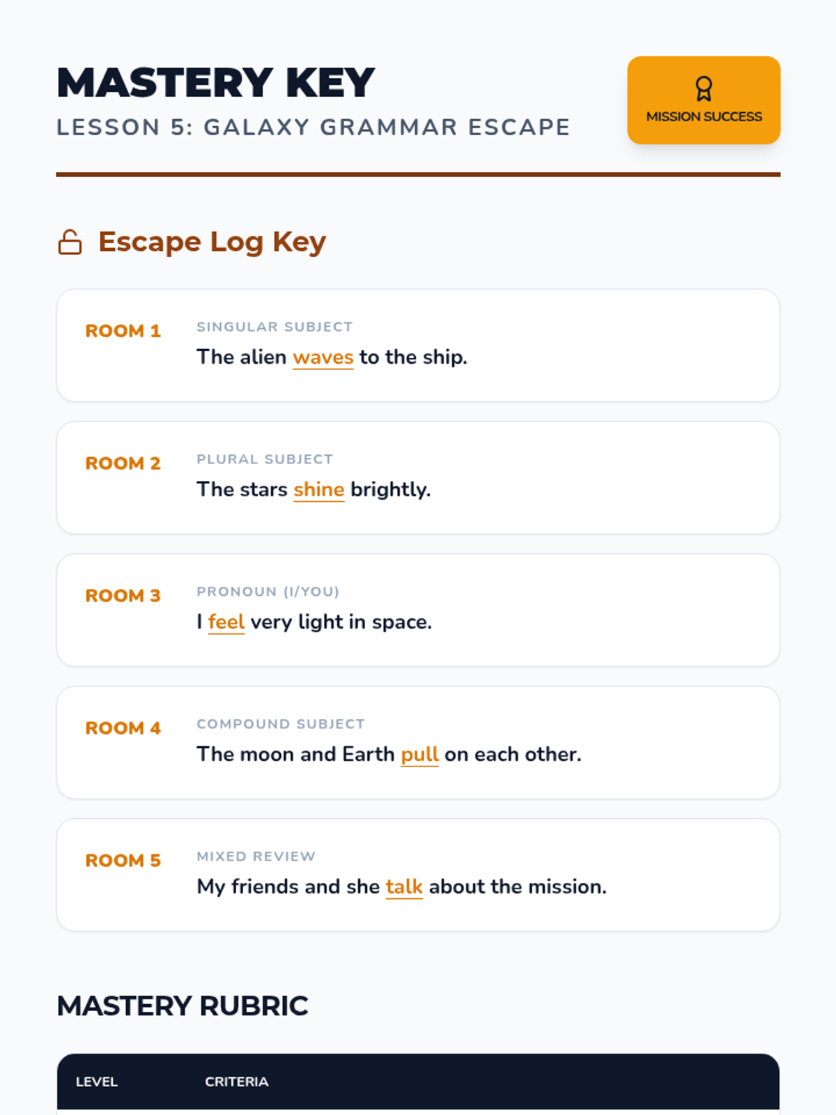 A 5-lesson sequence for 3rd graders on subject-verb agreement, using a space-themed 'Grammar Galaxy' motif to make grammar rules engaging and memorable. Students progress from singular and plural subjects to pronouns and compound subjects, ending in a mastery challenge.