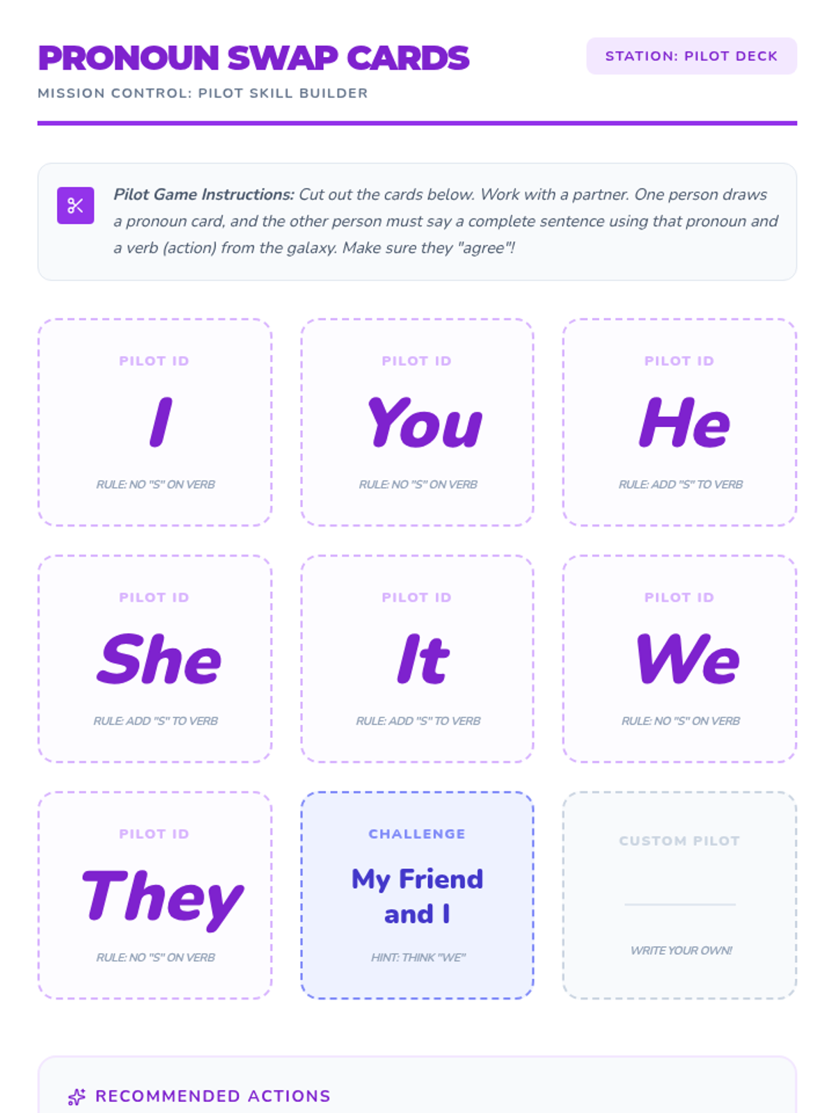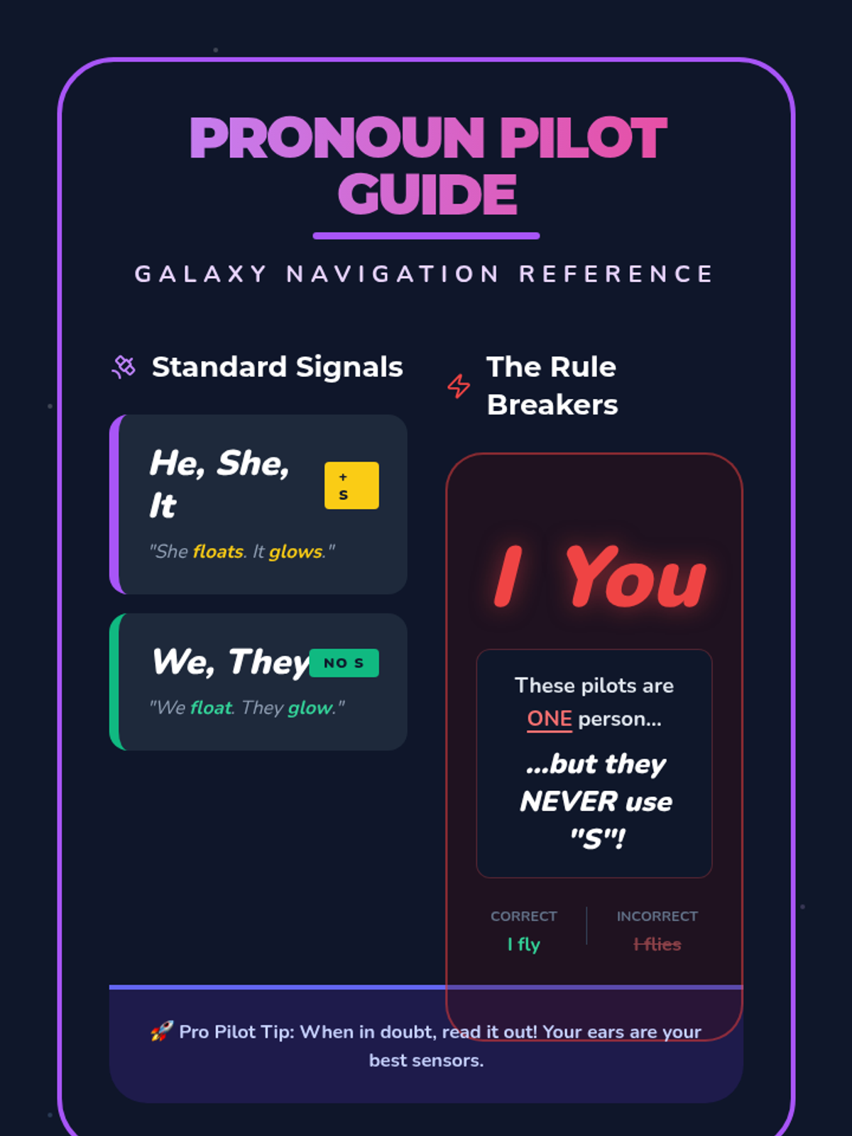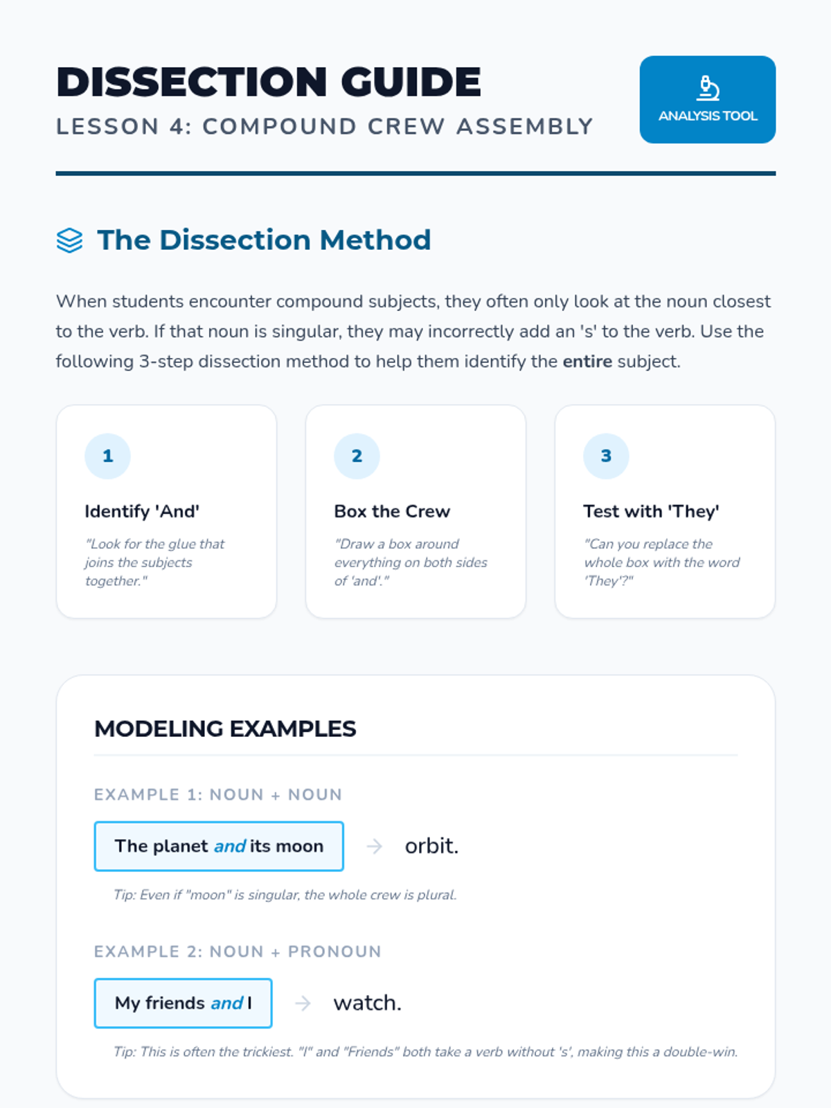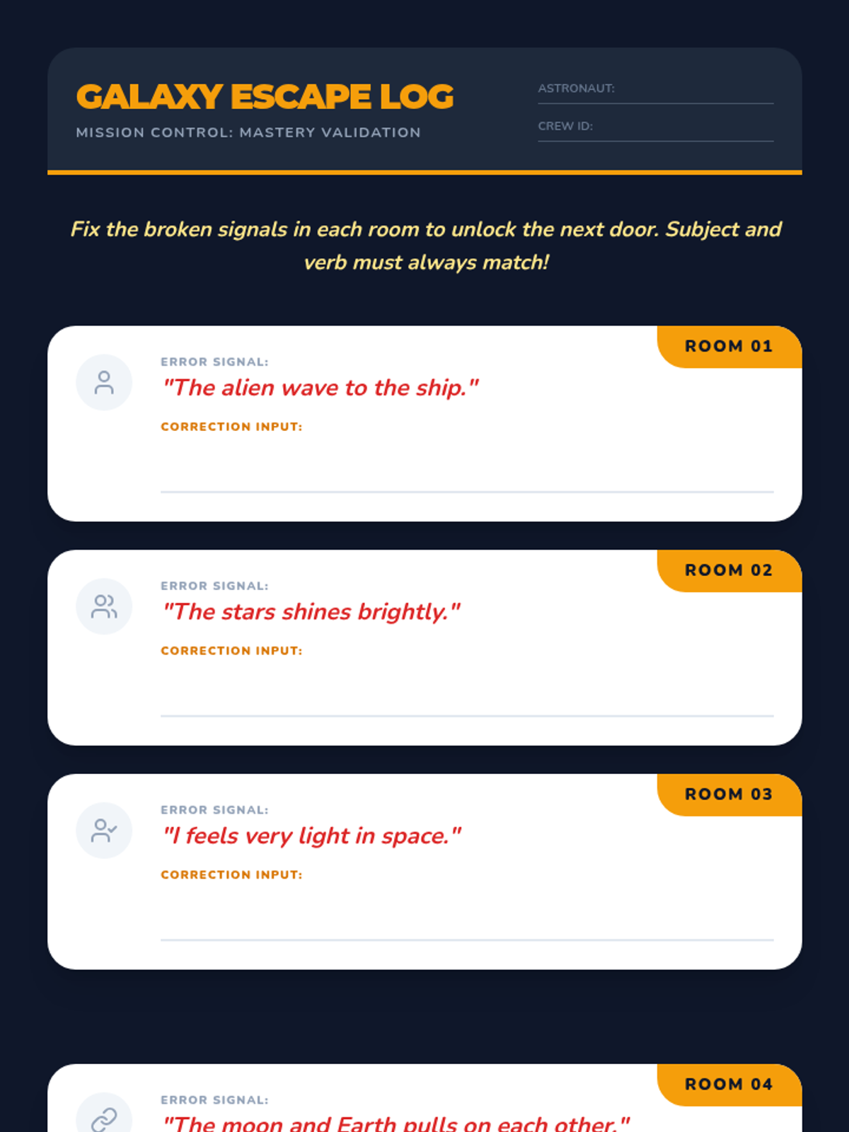 A 5-lesson sequence for 3rd graders on subject-verb agreement, using a space-themed 'Grammar Galaxy' motif to make grammar rules engaging and memorable. Students progress from singular and plural subjects to pronouns and compound subjects, ending in a mastery challenge.
