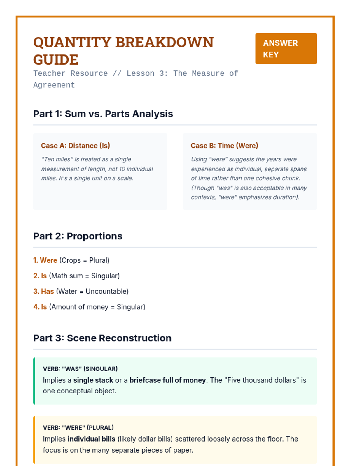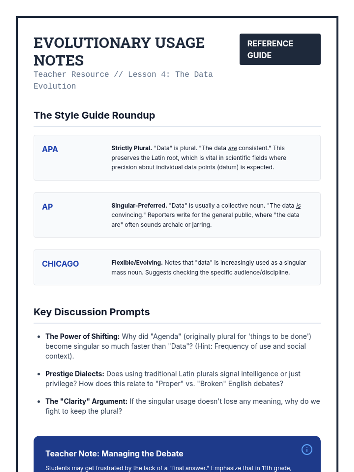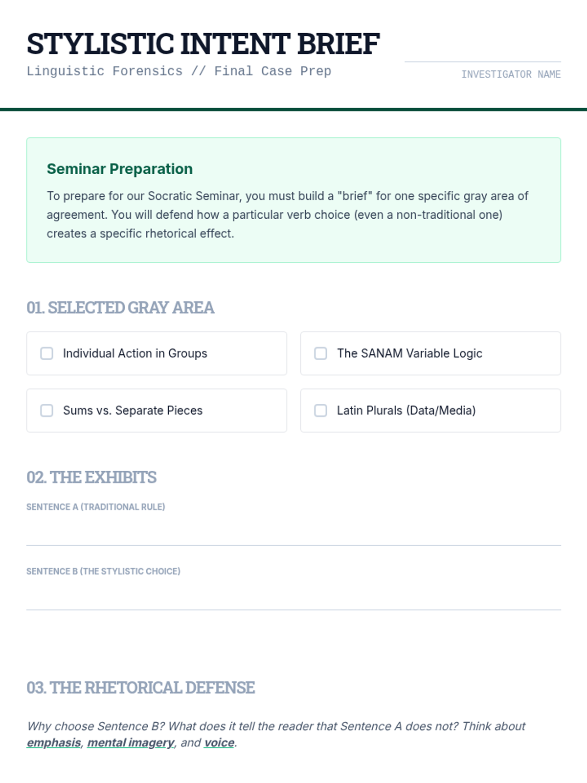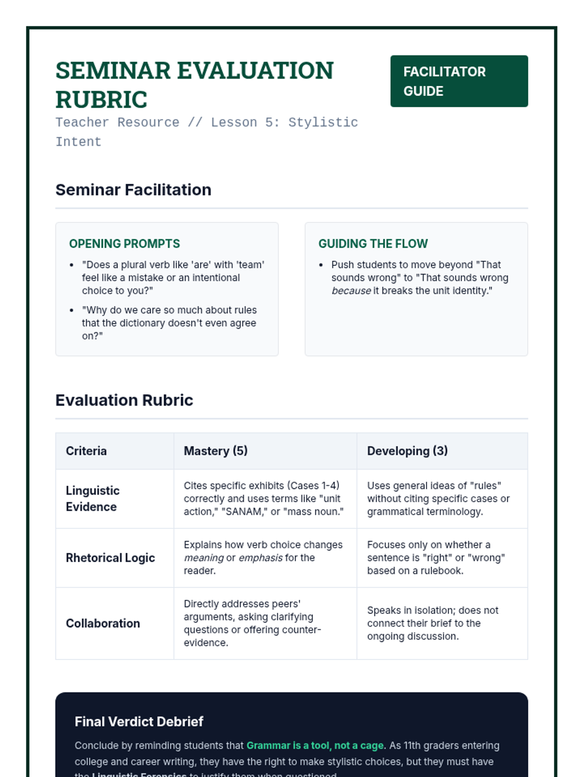 An 11th-grade inquiry-based sequence exploring the nuances of subject-verb agreement in collective nouns, indefinite pronouns, and evolving linguistic standards. Students move from rigid rules to understanding how writer intent and context dictate grammatical choices.