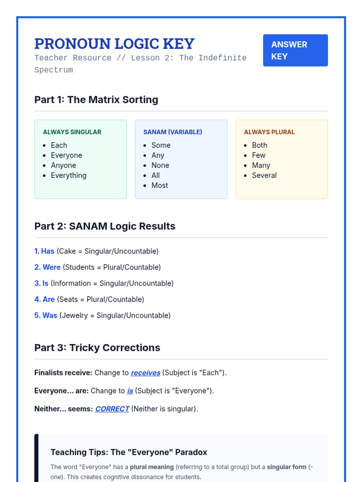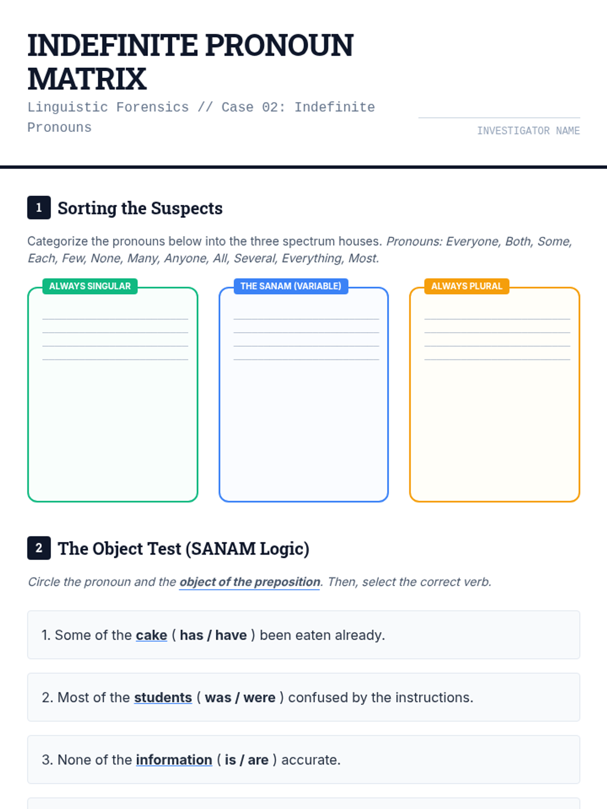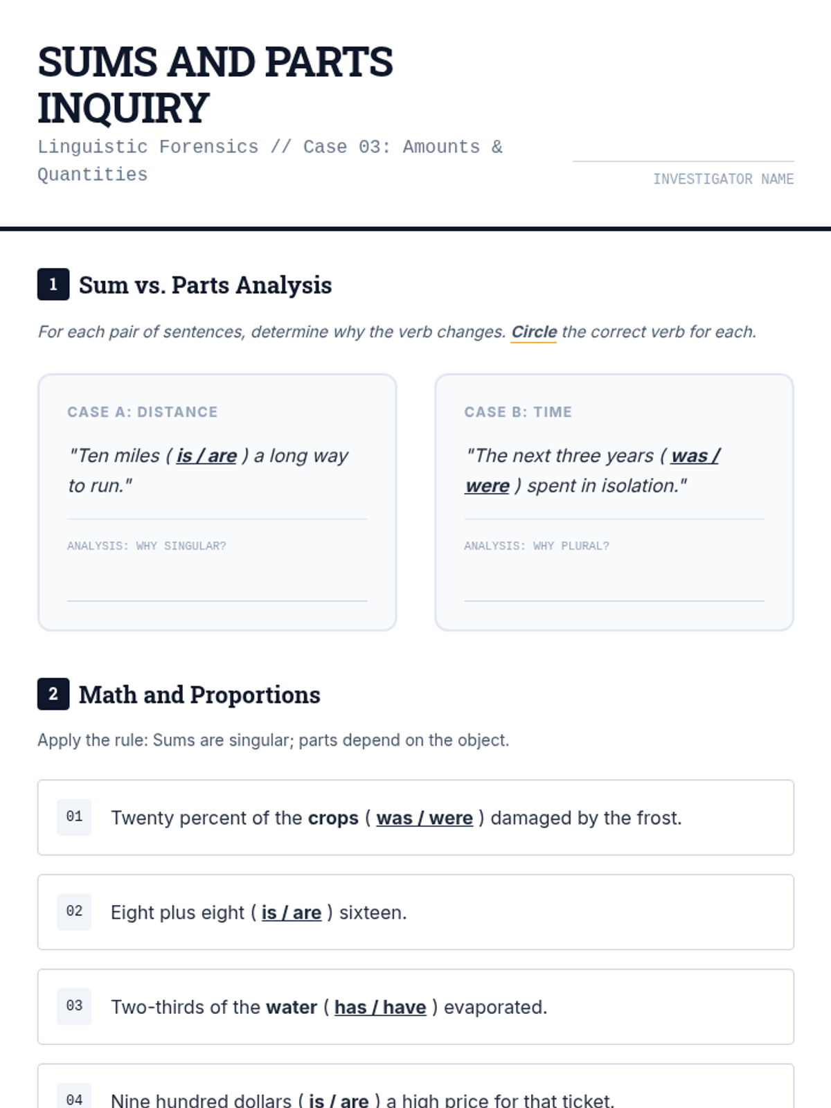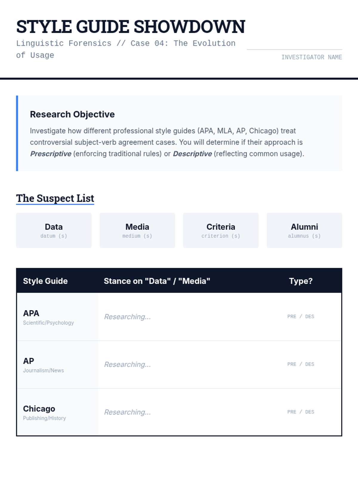 An 11th-grade inquiry-based sequence exploring the nuances of subject-verb agreement in collective nouns, indefinite pronouns, and evolving linguistic standards. Students move from rigid rules to understanding how writer intent and context dictate grammatical choices.