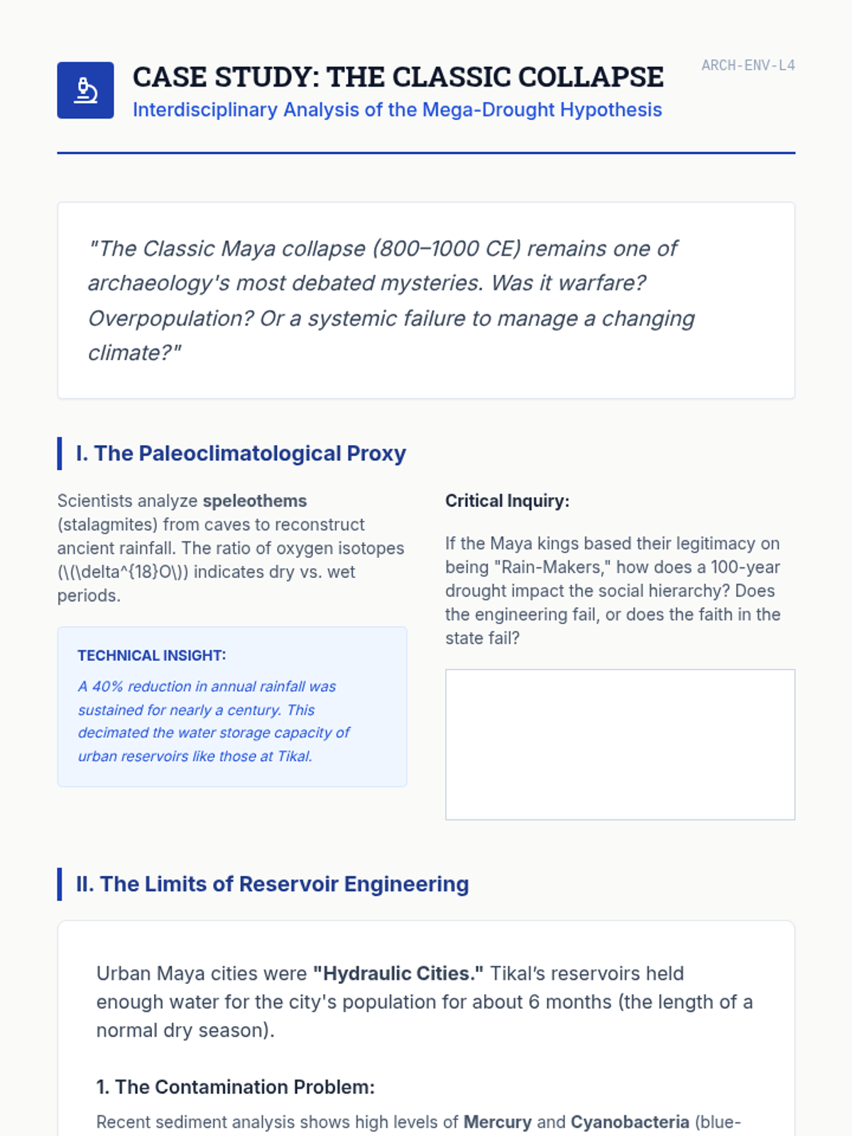 This sequence explores the sophisticated environmental engineering and agricultural technologies of the Inca, Aztec, and Maya. Students analyze the 'vertical archipelago', chinampas, and Maya water management to evaluate the role of the state in resource management and the sustainability of these ancient systems in a modern context.