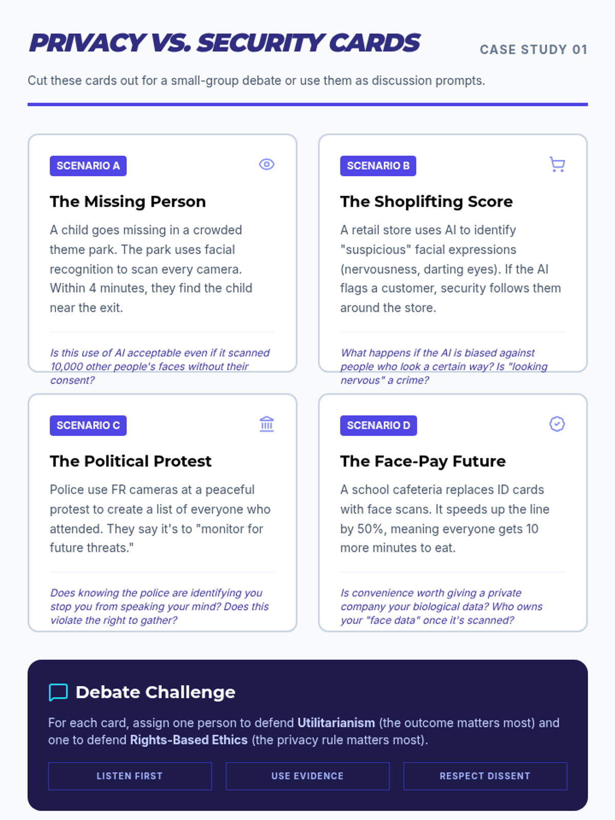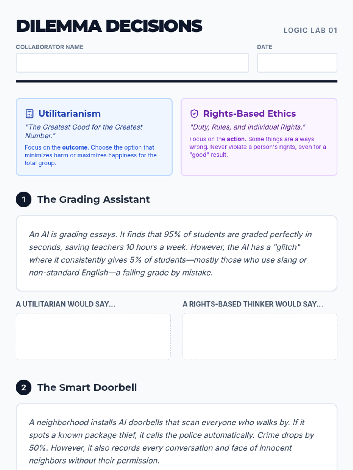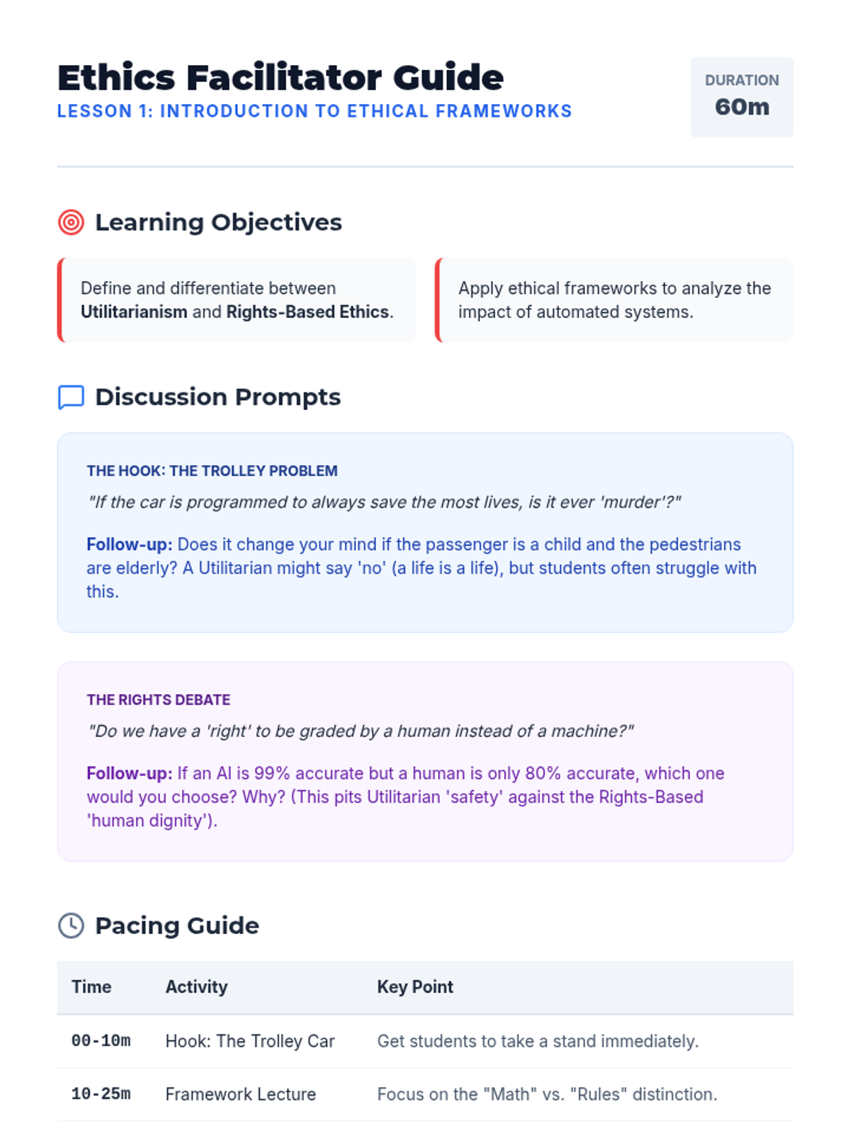 This sequence guides 7th-grade students through the ethical complexities of AI, from foundational frameworks like utilitarianism to real-world applications in facial recognition and social media. Students develop critical thinking and debate skills, culminating in a mock ethics board hearing.