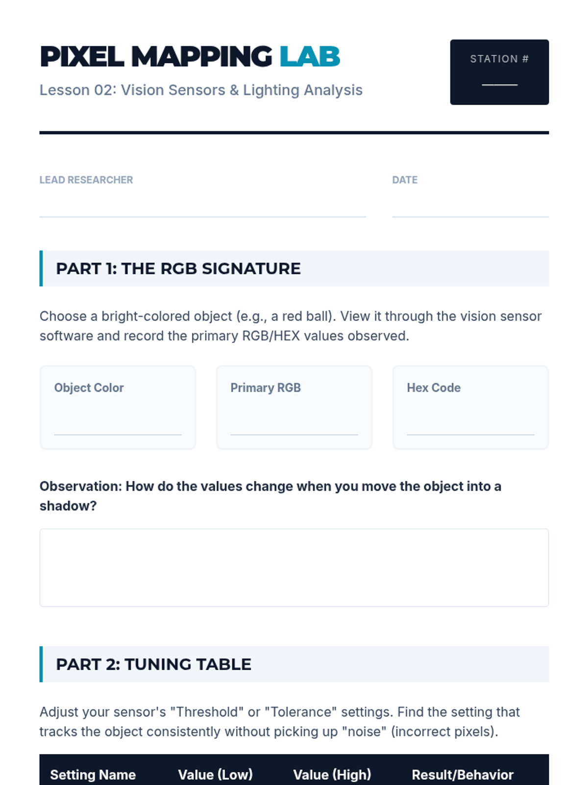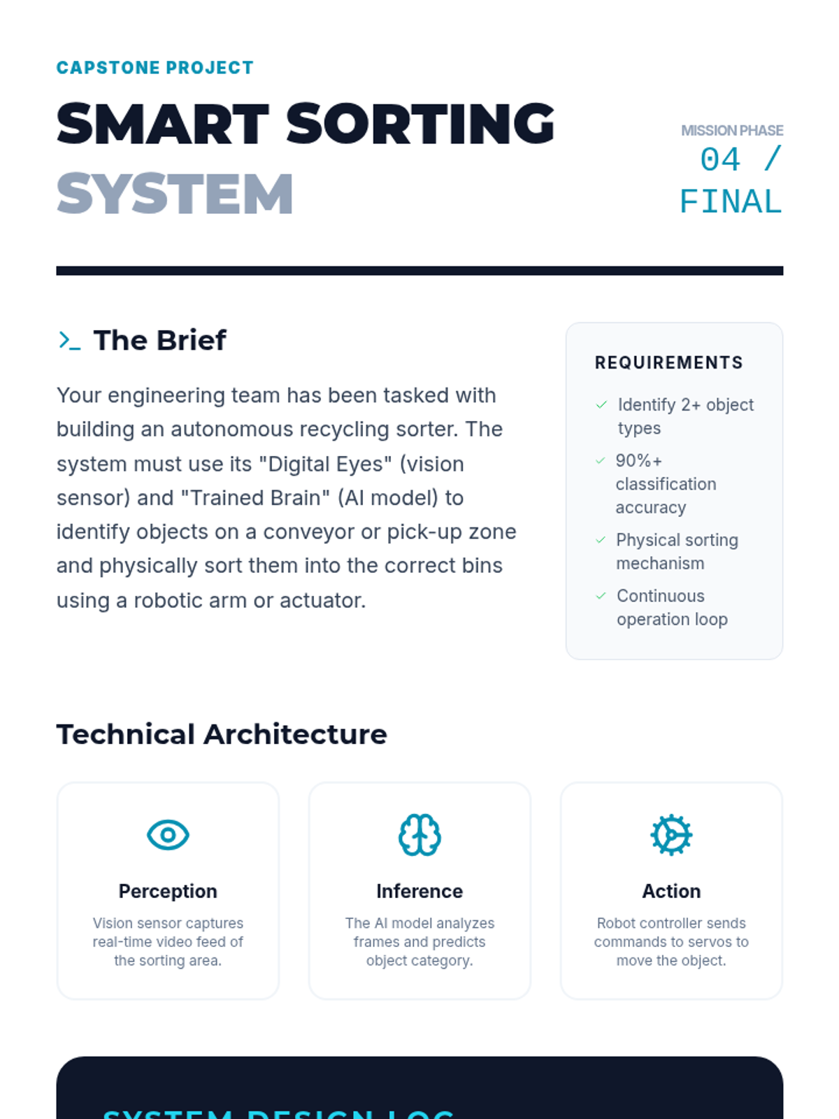 An advanced 9th-grade engineering sequence exploring AI and computer vision in robotics. Students transition from traditional logic to machine learning, training models to interpret visual data and applying these skills to a physical sorting robot project.