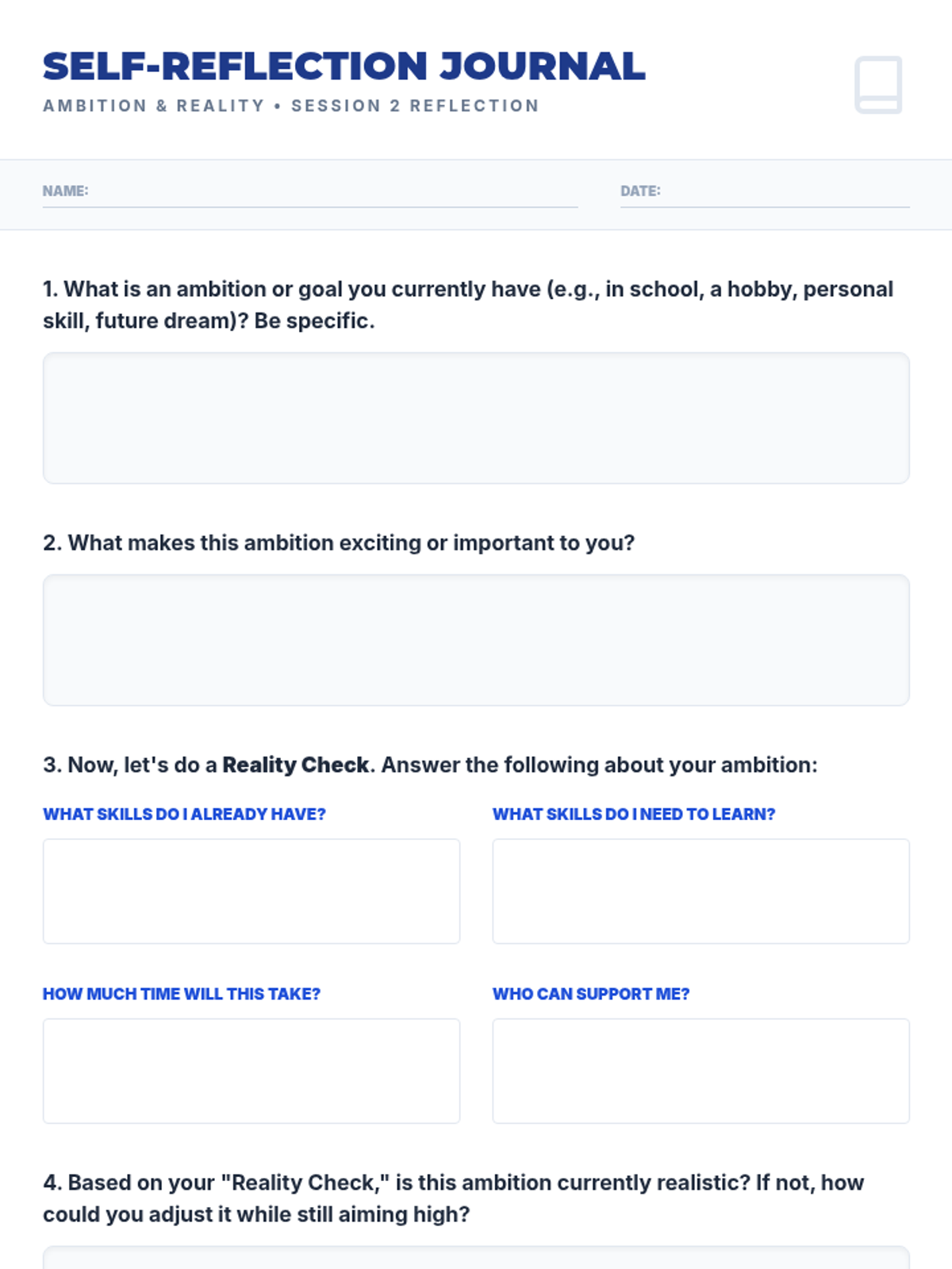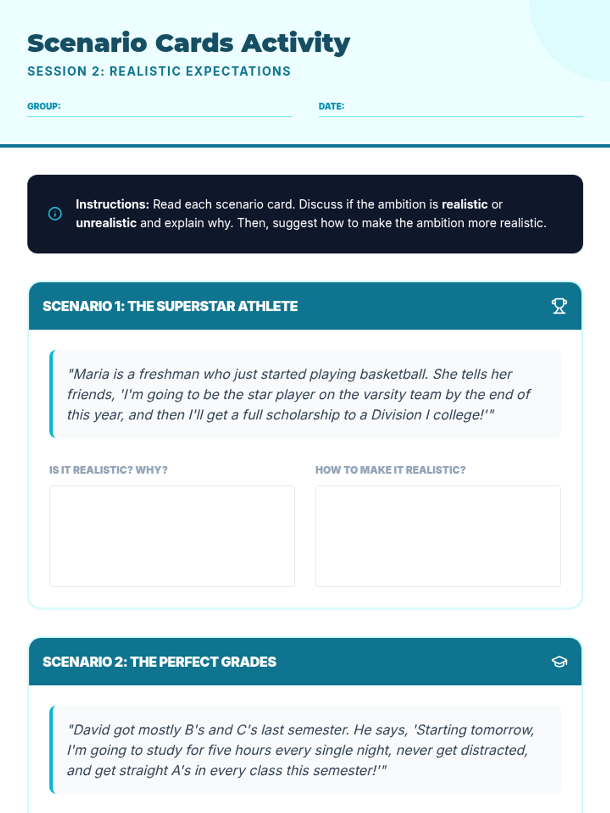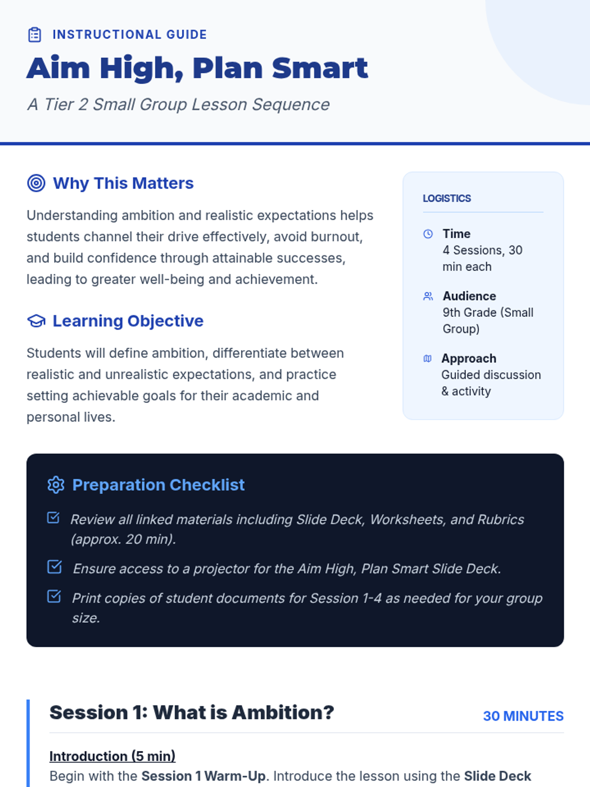 A four-session sequence for 9th-grade students to explore ambition, set realistic expectations, and develop actionable SMART goals through small-group discussion and planning.