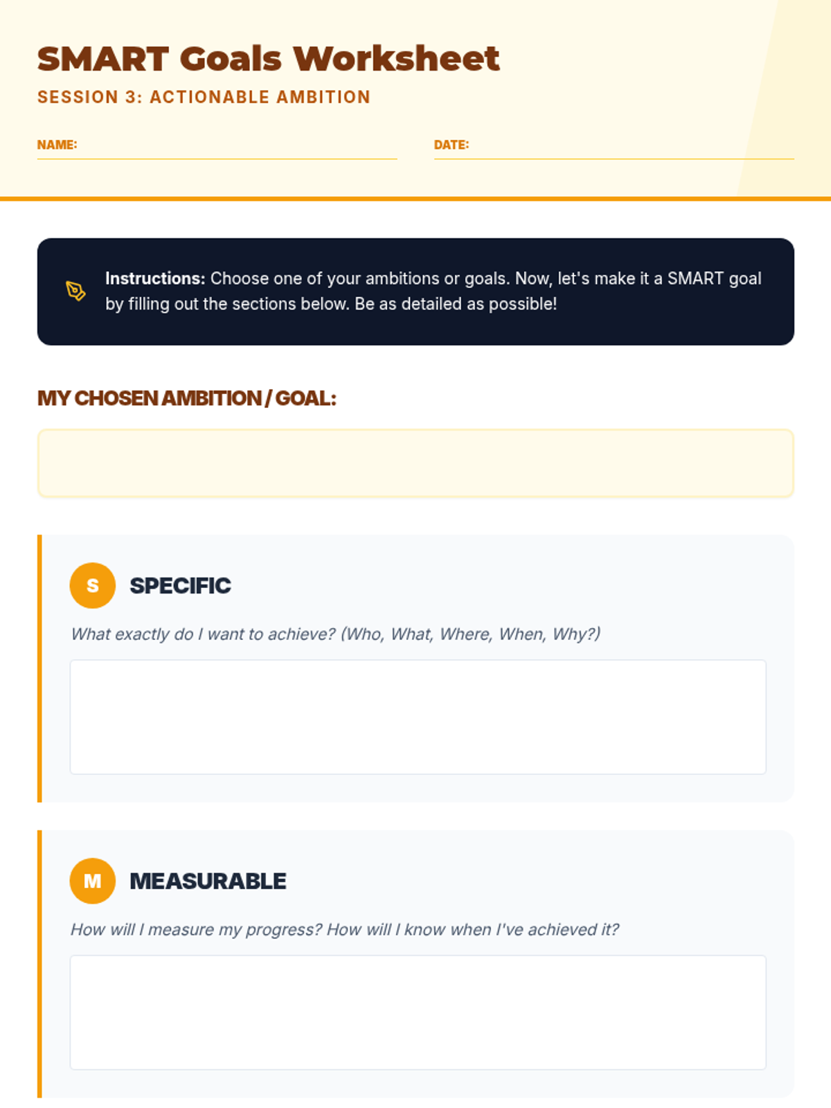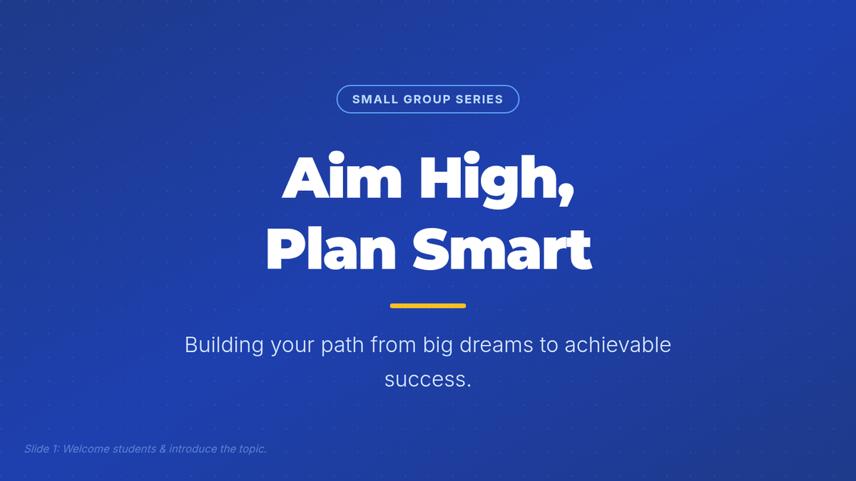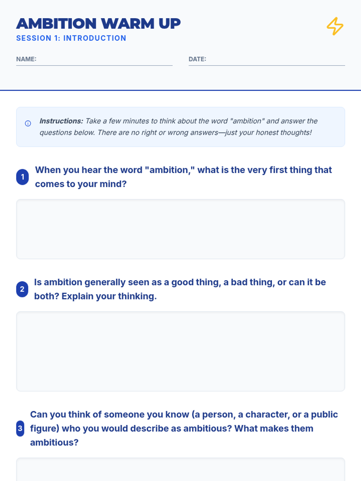 A four-session sequence for 9th-grade students to explore ambition, set realistic expectations, and develop actionable SMART goals through small-group discussion and planning.