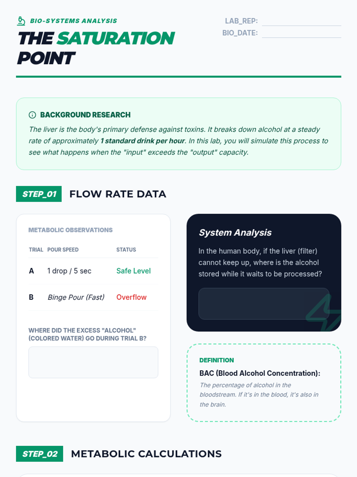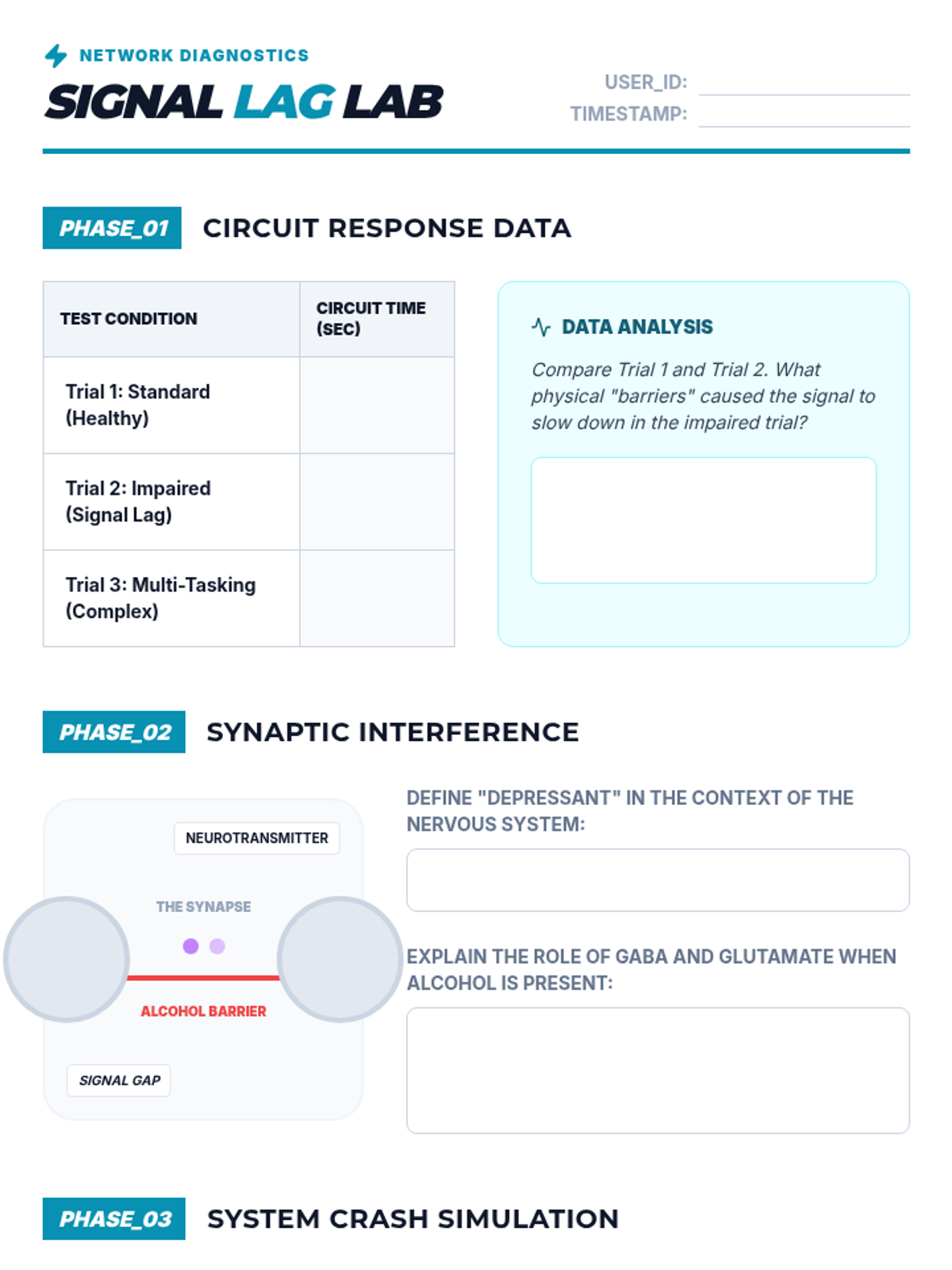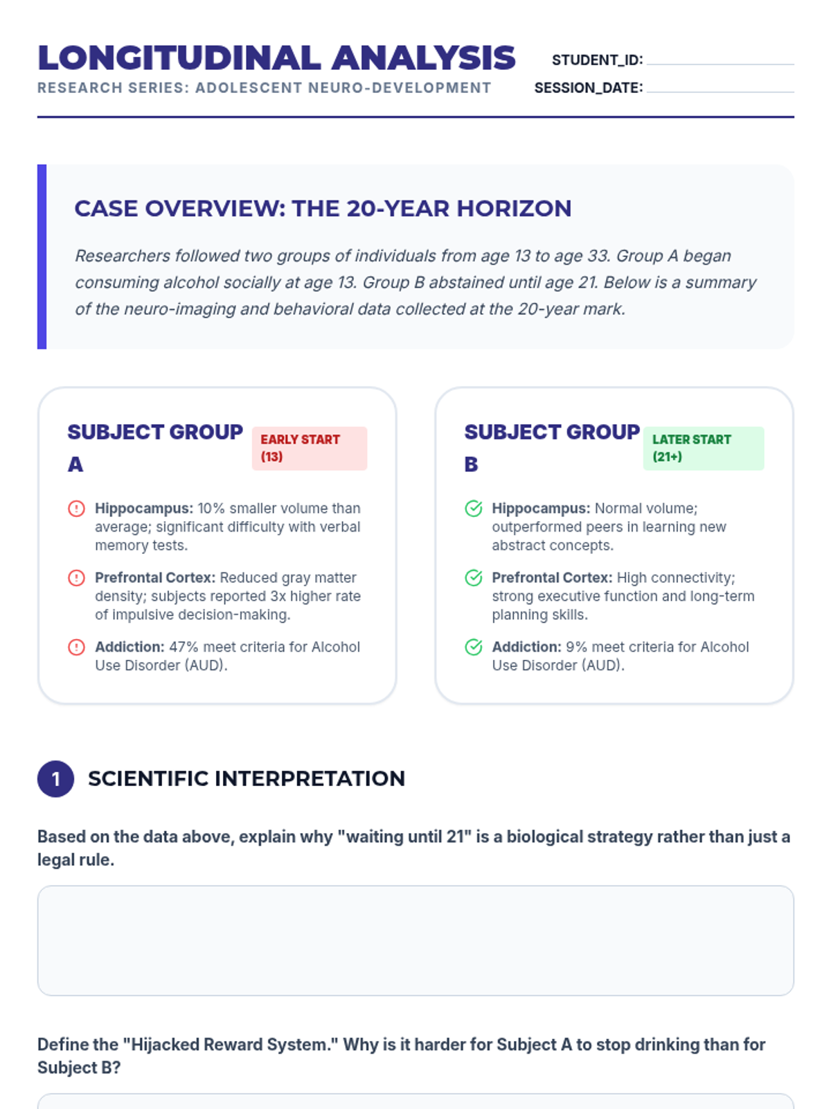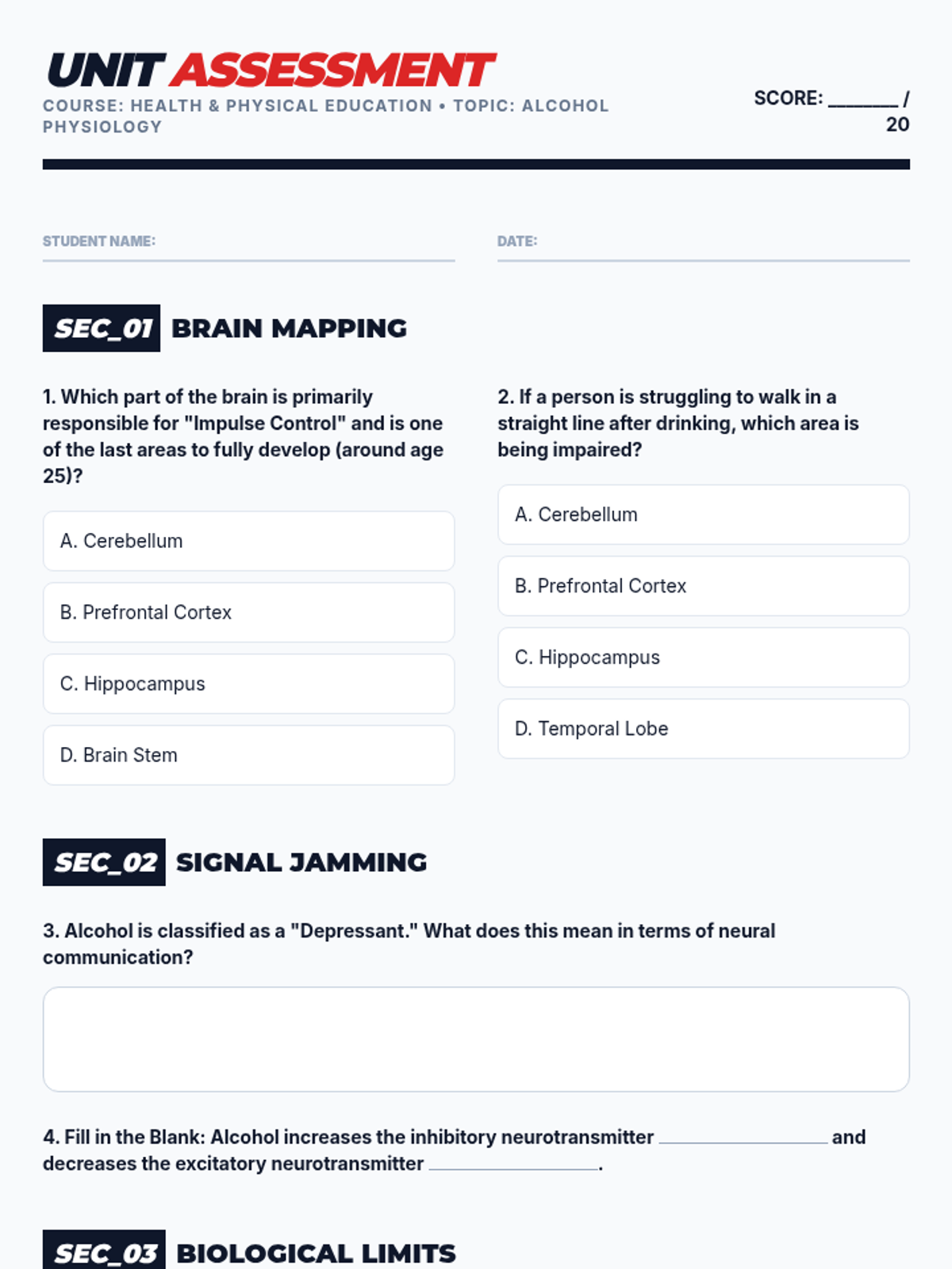 A comprehensive 7th-grade health sequence exploring the physiological impact of alcohol on the developing adolescent body. Students investigate brain anatomy, chemical neurotransmission, liver filtration limits, and long-term health consequences through inquiry-based simulations and scientific analysis.