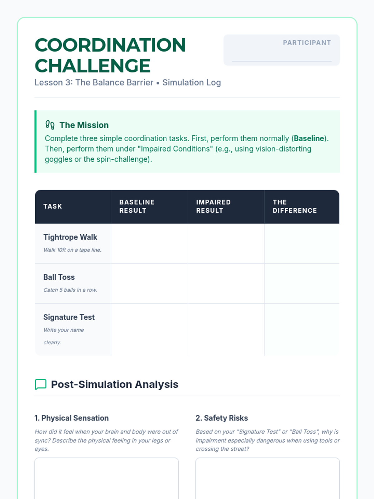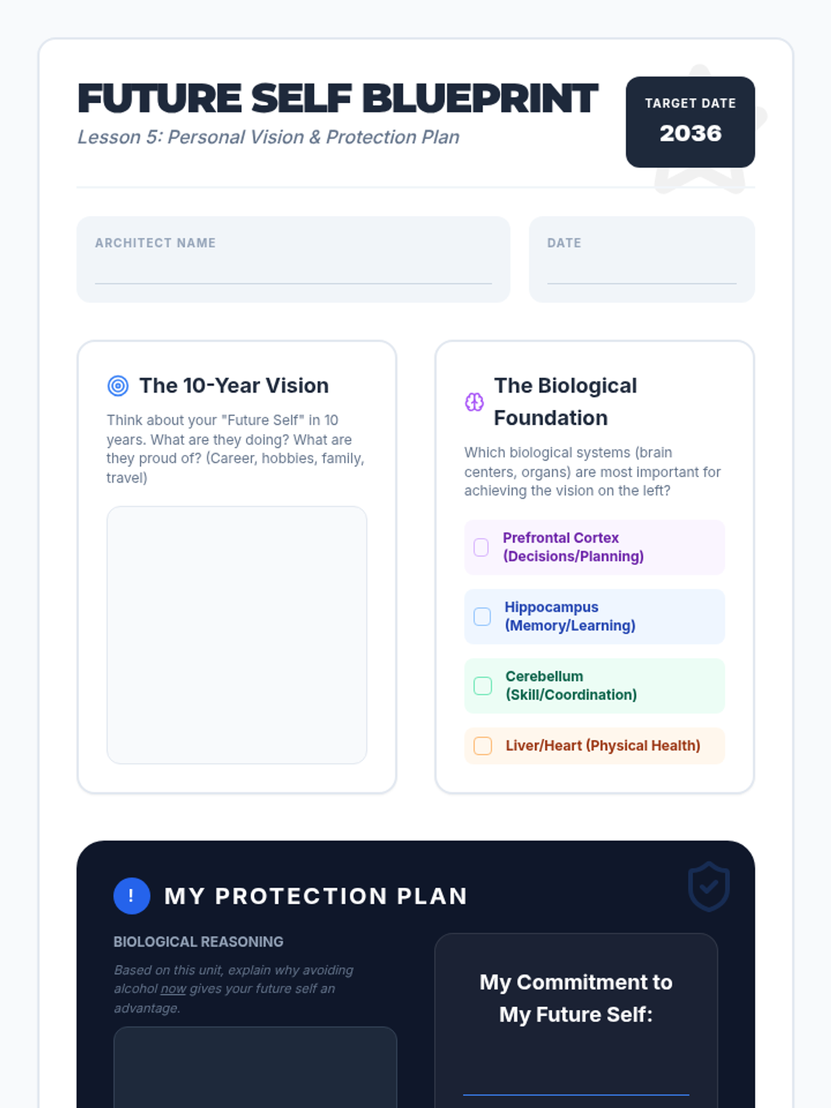 This sequence explores the biological impact of alcohol on the developing adolescent body and brain. Students investigate how alcohol interferes with the central nervous system, impairs motor skills, and impacts long-term health, emphasizing the unique vulnerability of the growing brain.