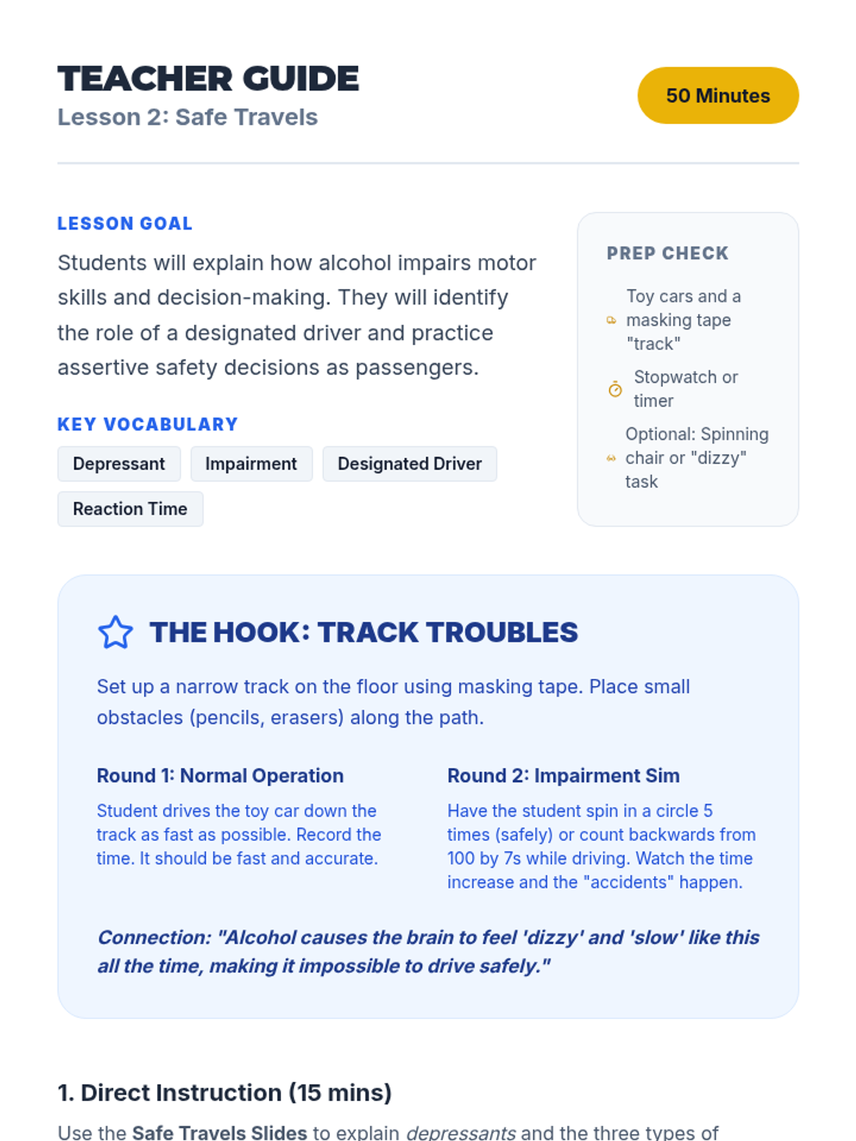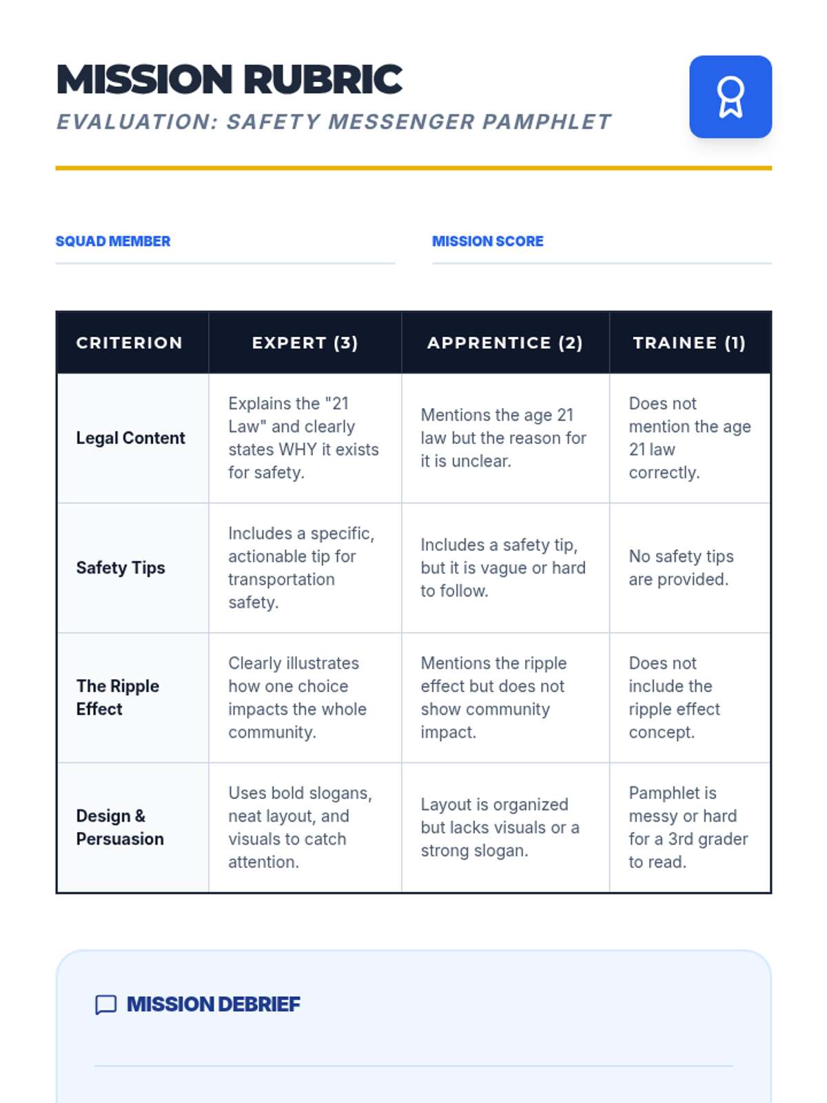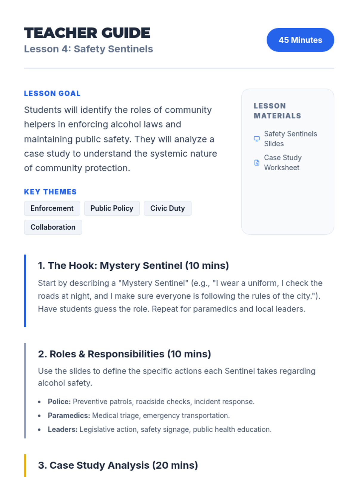 This project-based sequence explores the legal and community safety aspects of alcohol awareness for 4th-grade students. It frames laws as protective measures for the community, focusing on the legal drinking age and transportation safety.