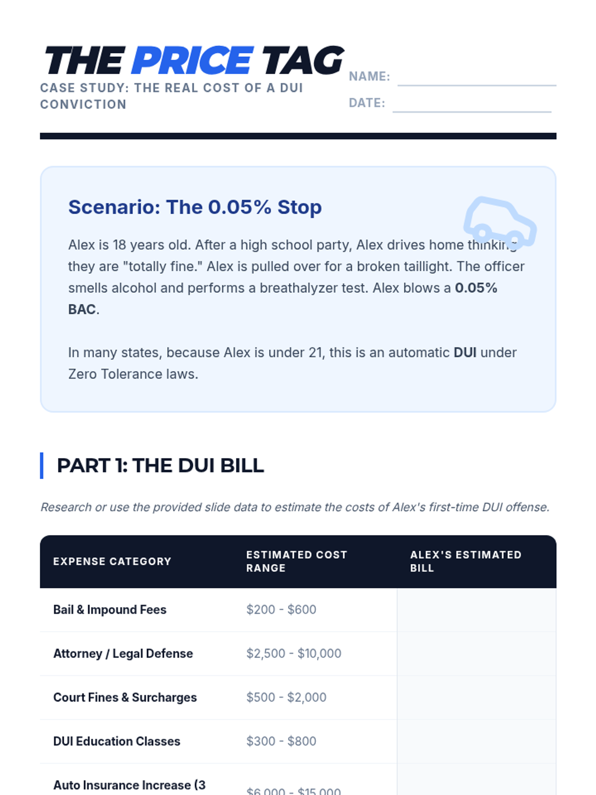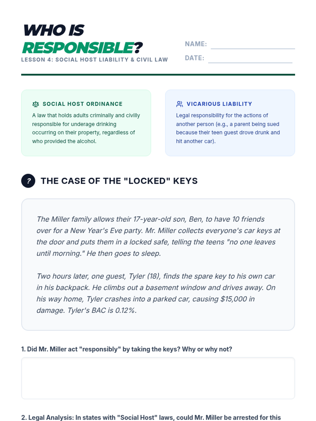 A comprehensive 9th-grade health sequence exploring the legal, financial, and community consequences of alcohol misuse, from underage possession to social host liability and Good Samaritan laws.