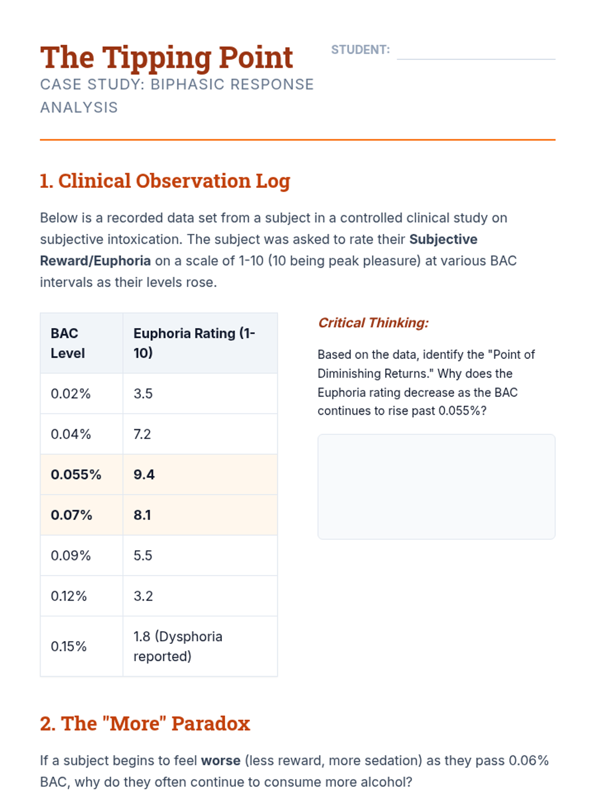 A scientific exploration of the pharmacokinetics, neurobiology, and physiological impacts of alcohol consumption, designed for undergraduate students. The sequence covers metabolic pathways, neurotransmitter interference, the biphasic response, memory formation disruption, and acute toxicity protocols.