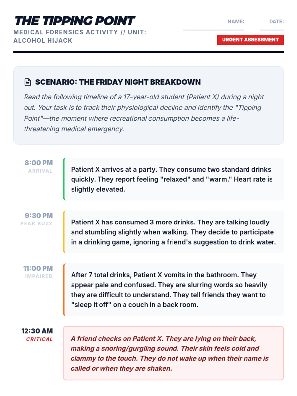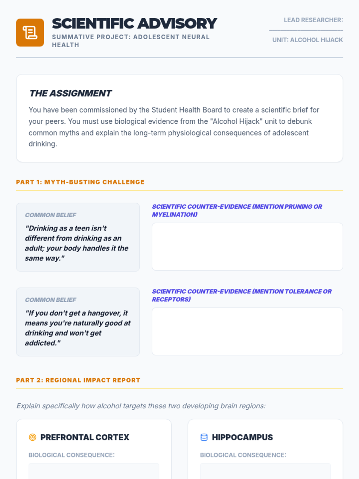 A comprehensive 10th-grade health unit exploring the neurochemical and physiological impacts of alcohol. Students investigate how alcohol affects neurotransmitters, leads to acute poisoning, causes chronic organ damage, and alters the developing adolescent brain.