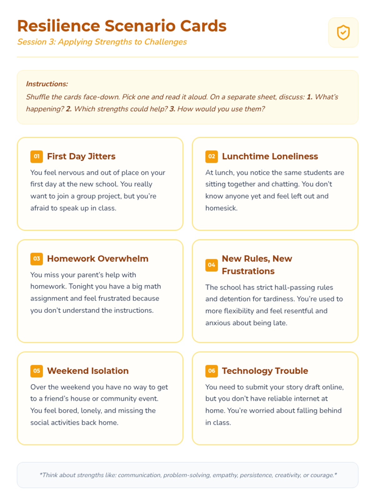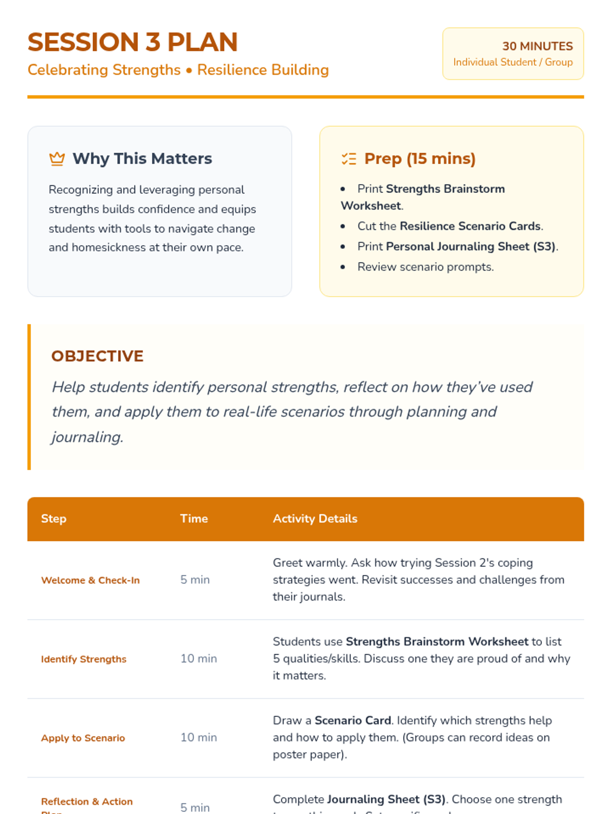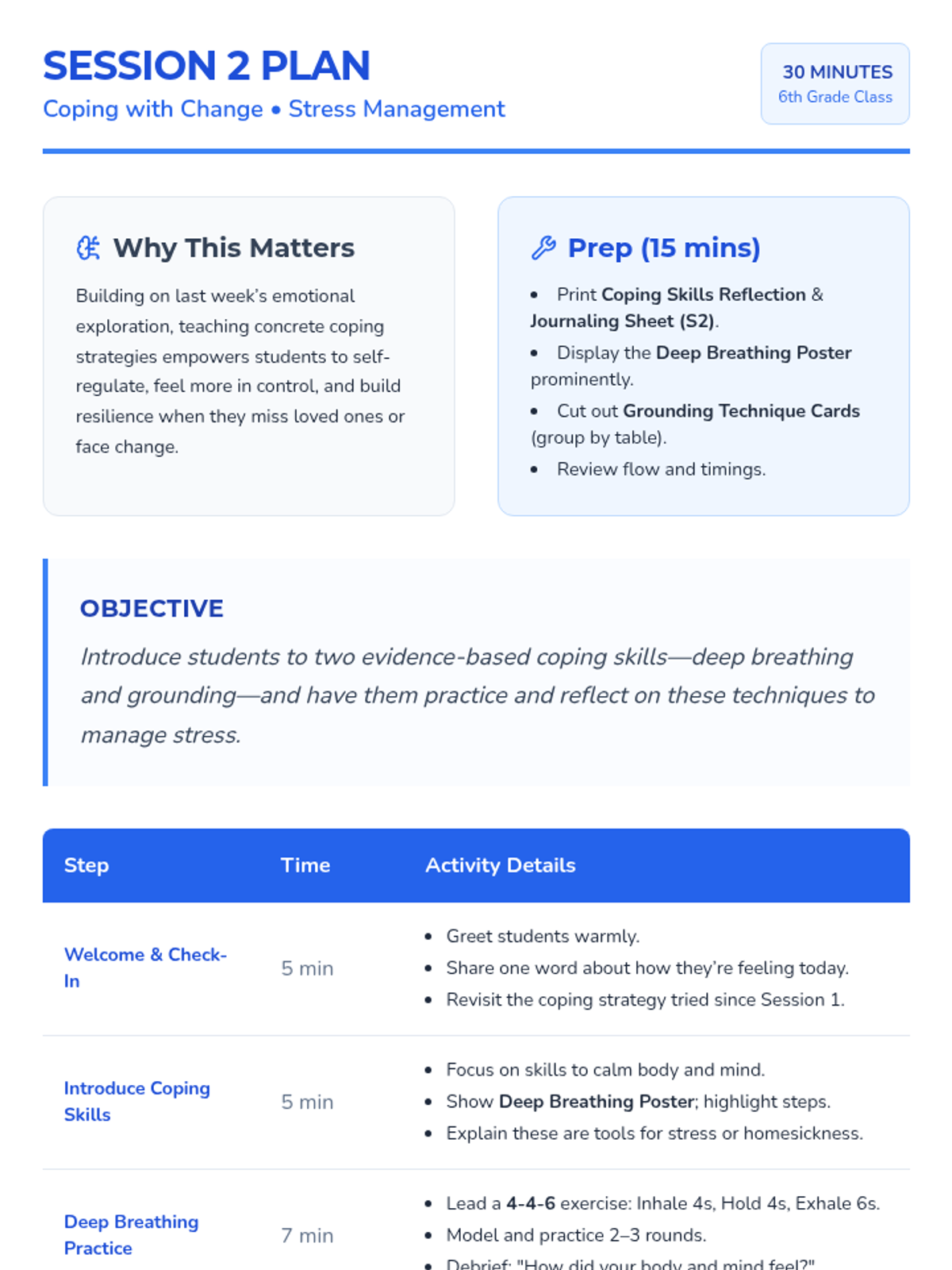 A comprehensive 6-week Tier 1 emotional support program designed for 6th graders navigating major life transitions. The series focuses on building resilience, managing homesickness, identifying personal strengths, and establishing a supportive peer community.