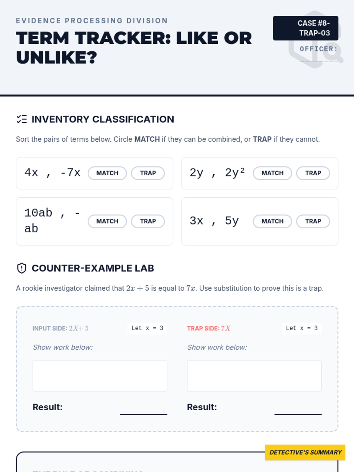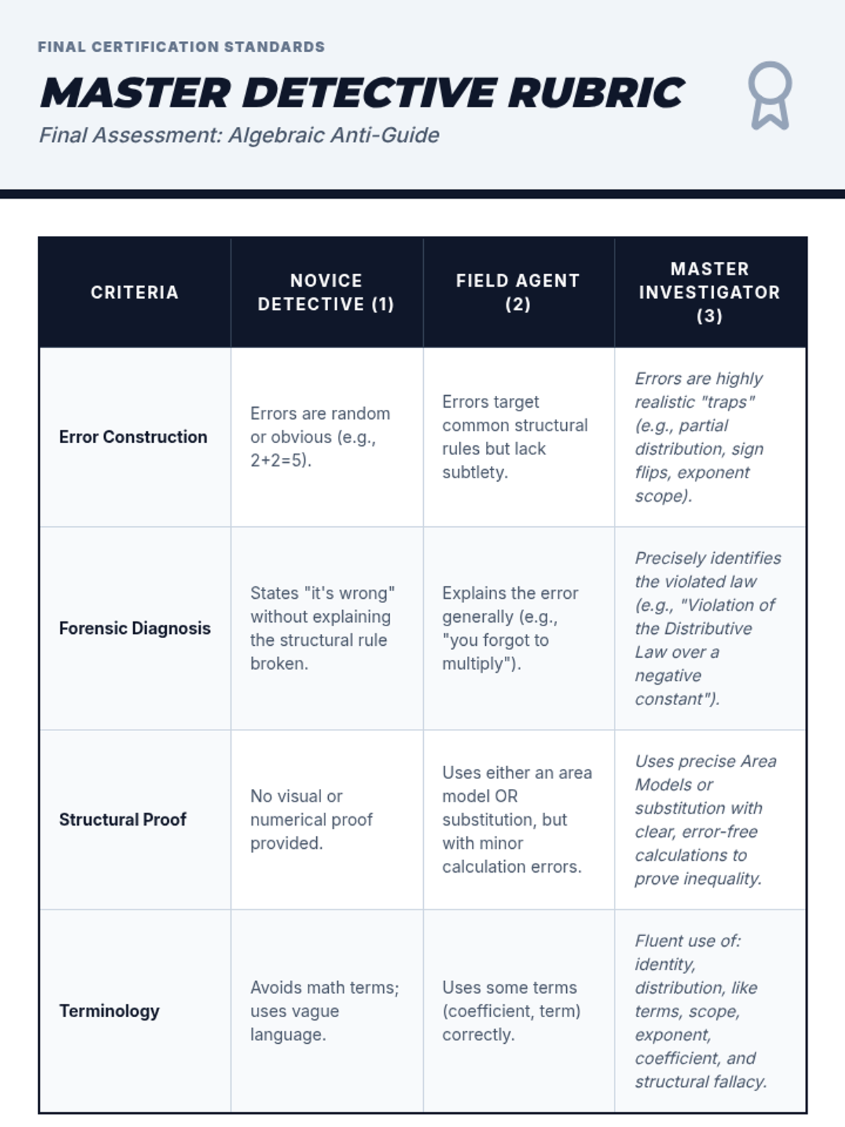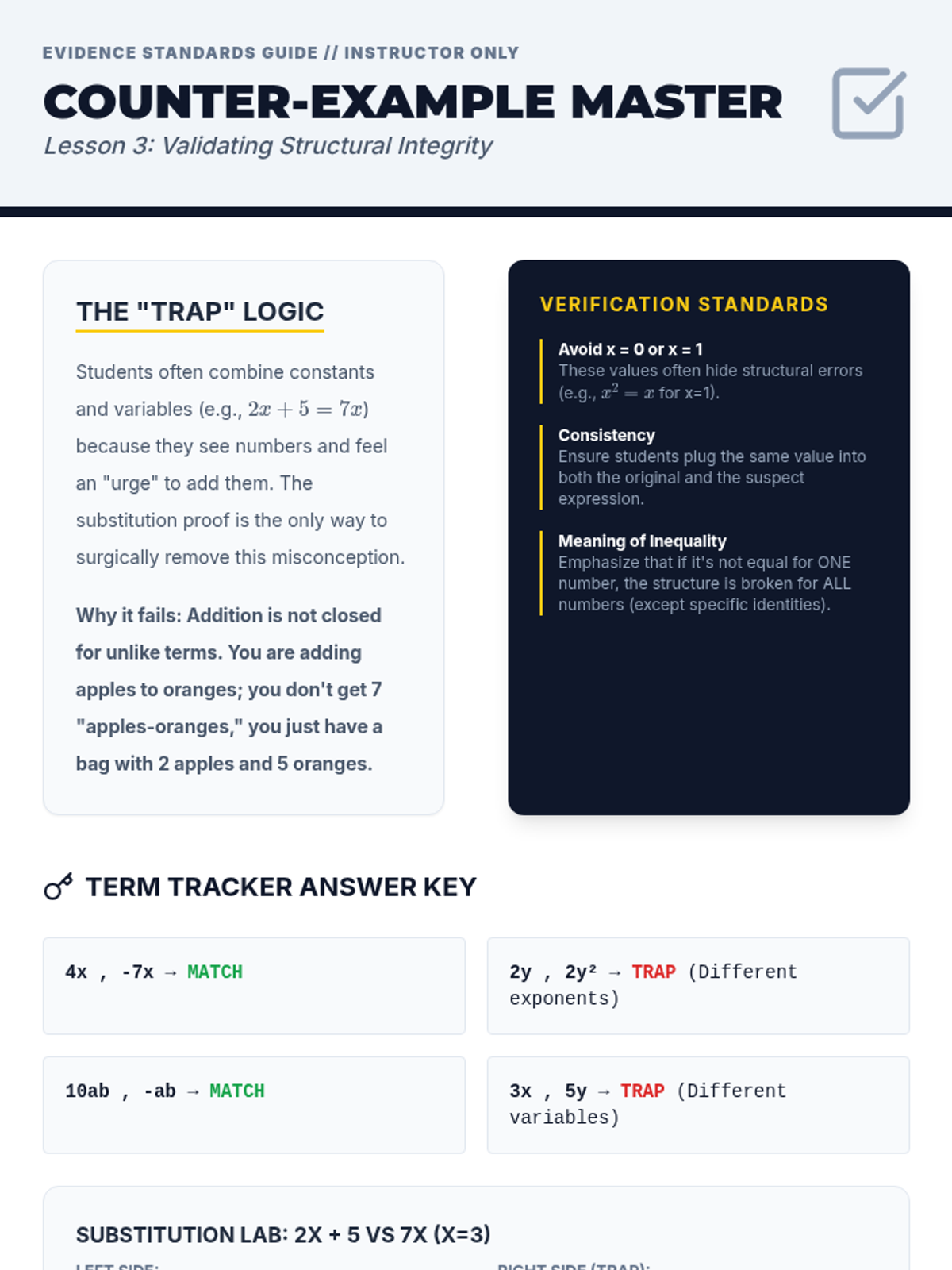 A 5-lesson sequence for 8th-grade algebra focusing on identifying and correcting structural errors in expressions using a 'Math Forensics' theme. Students act as investigators to 'debug' algebraic logic and justify their findings using visual models and counter-examples.