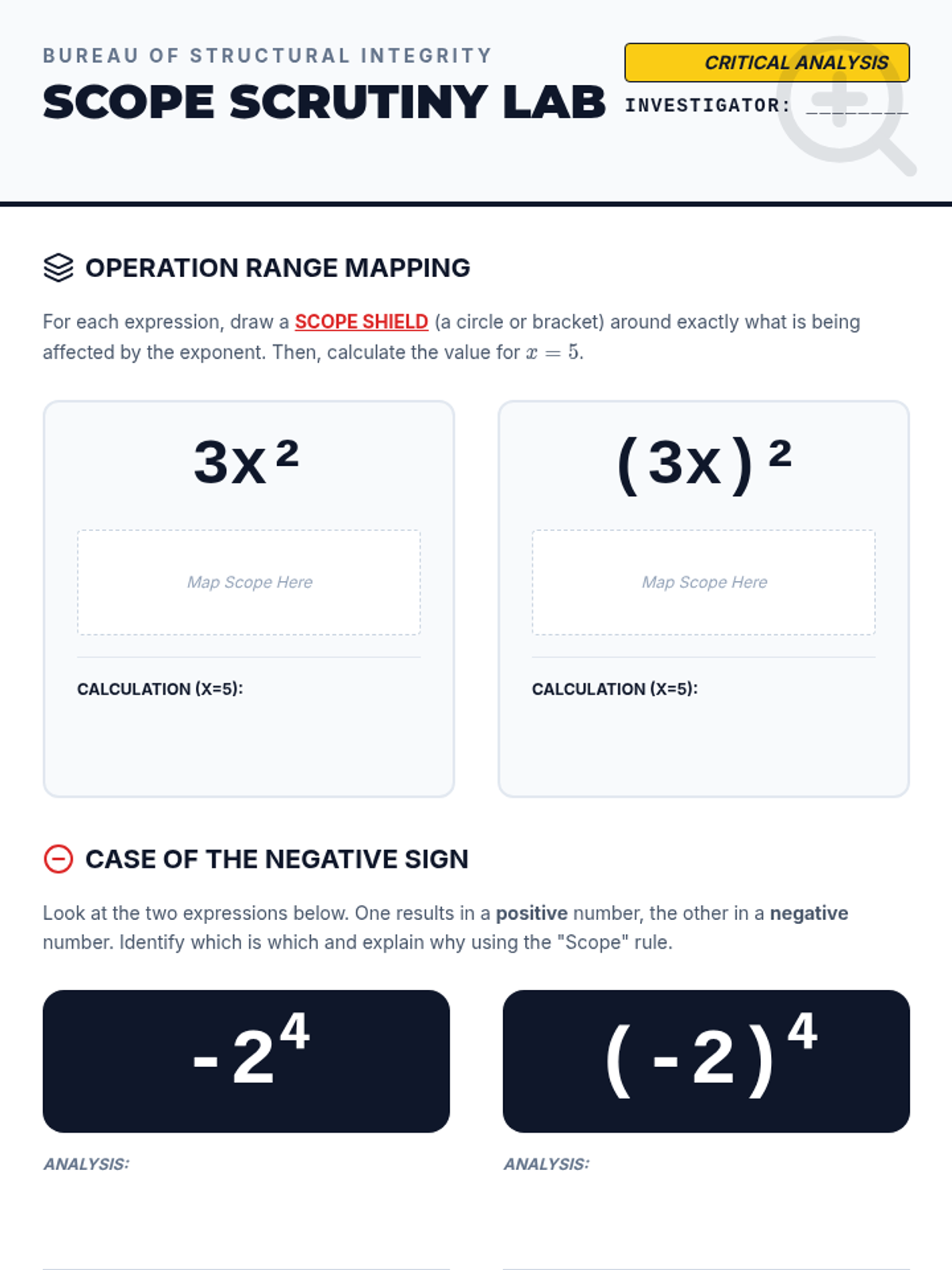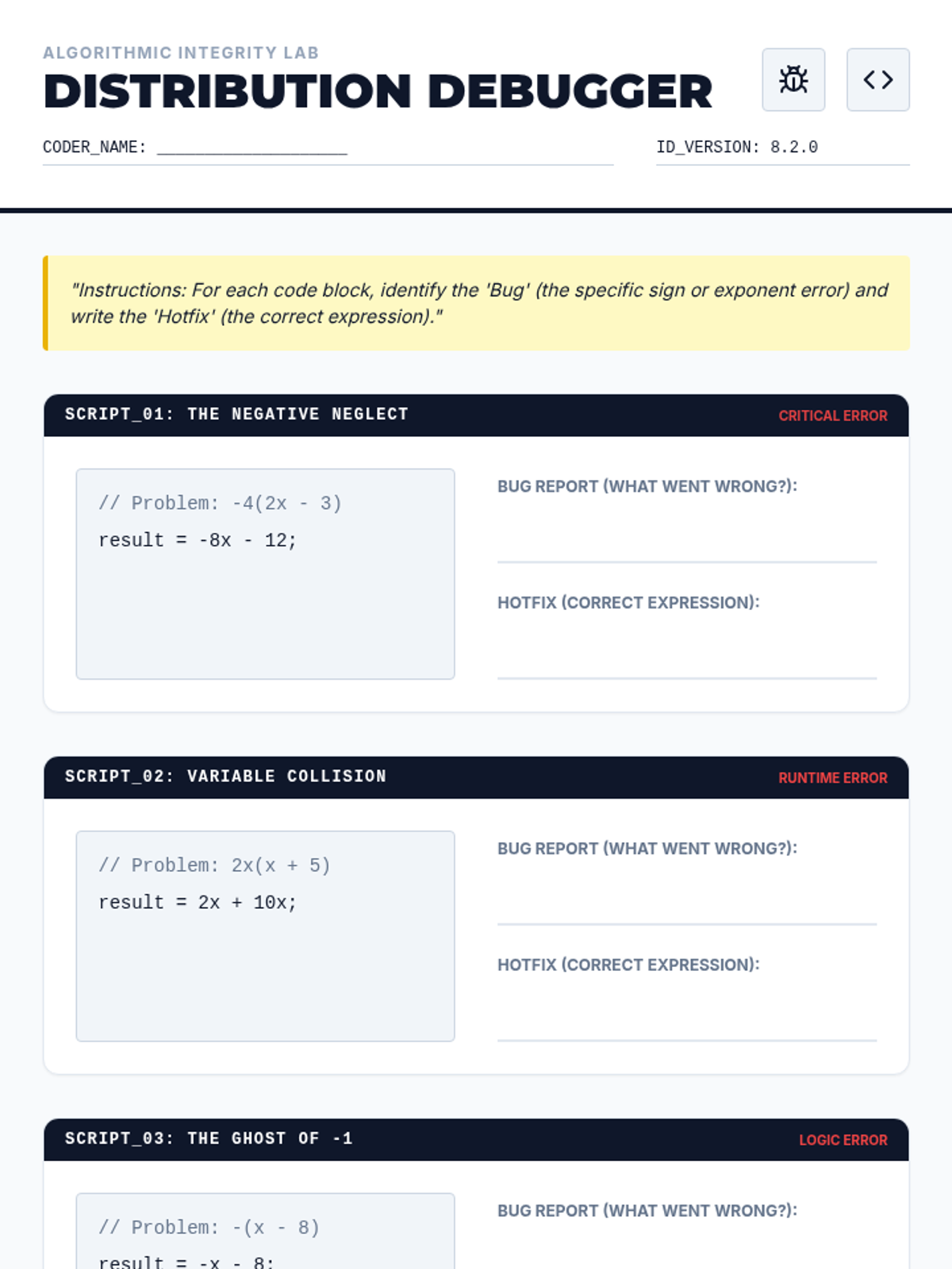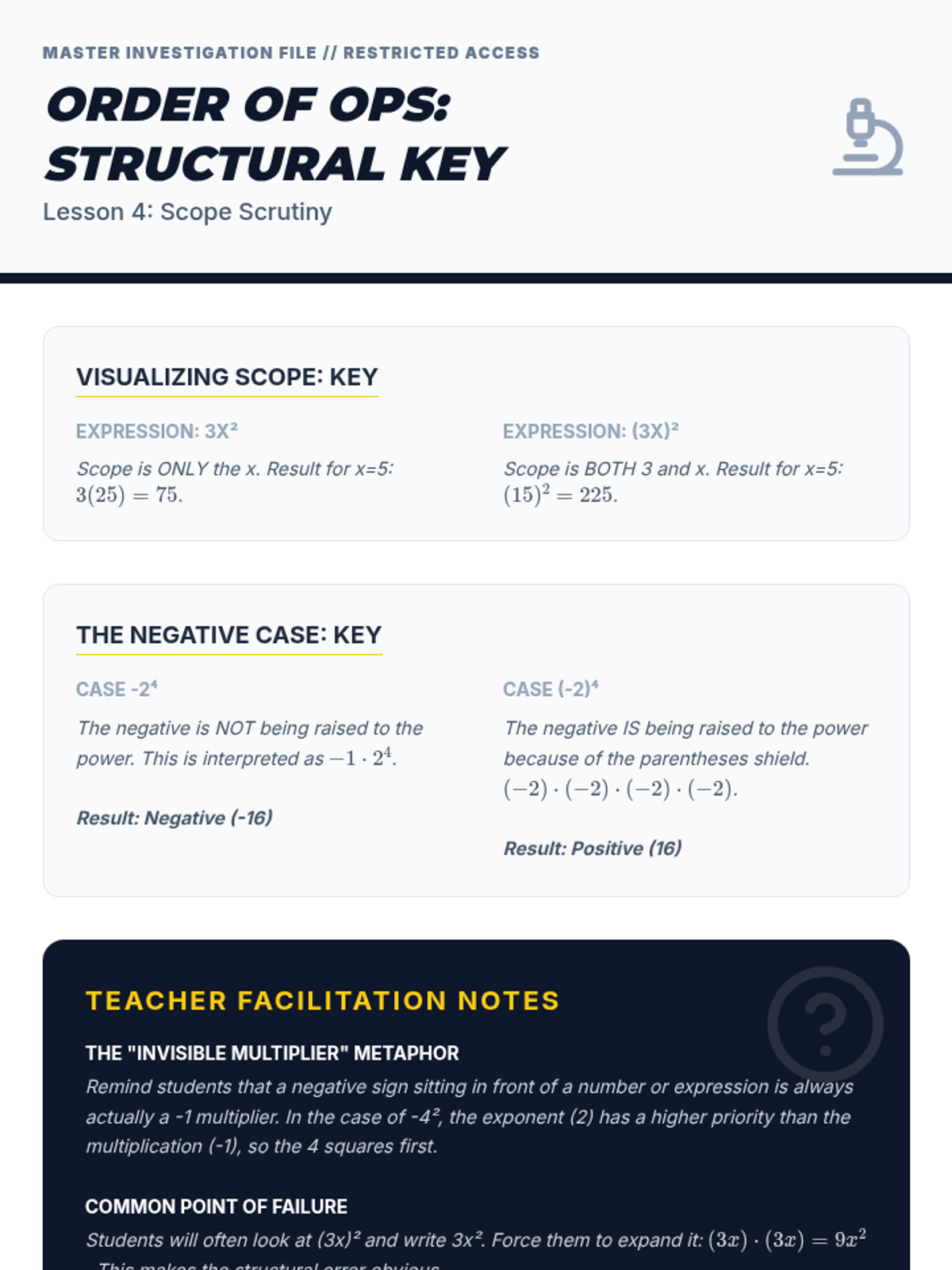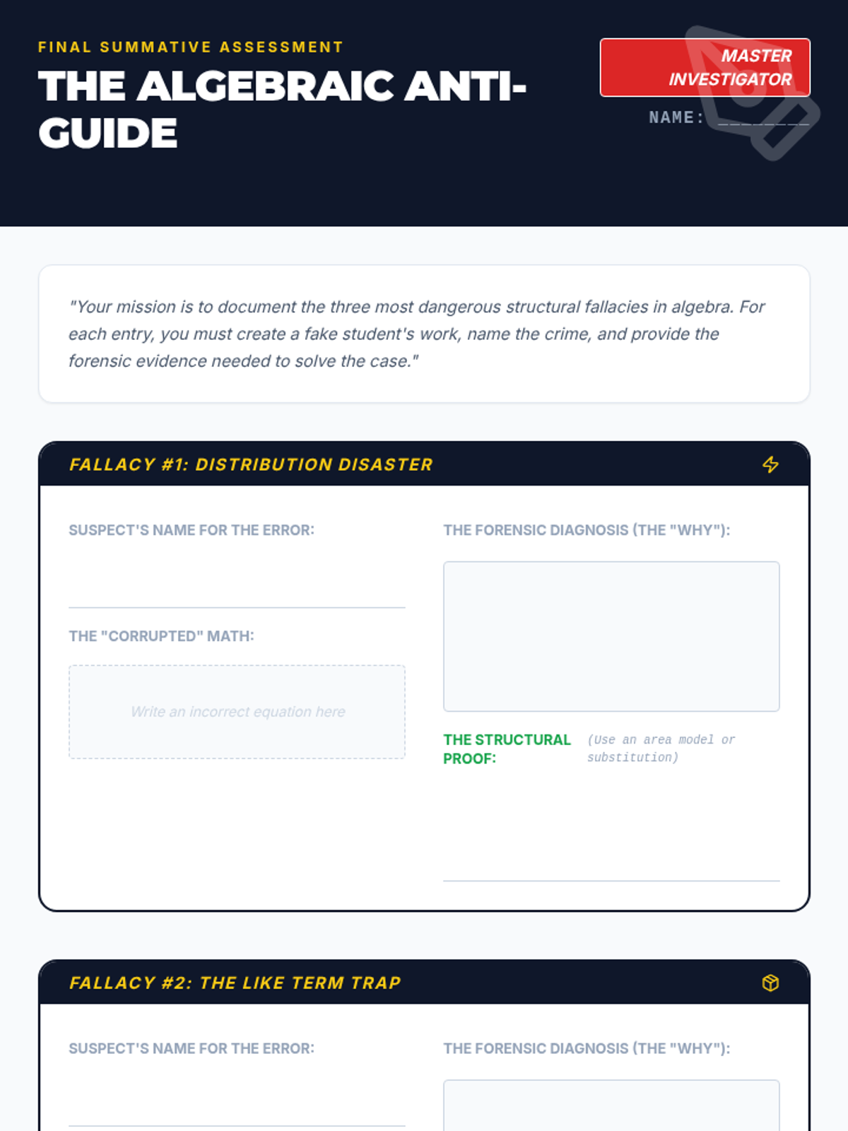 A 5-lesson sequence for 8th-grade algebra focusing on identifying and correcting structural errors in expressions using a 'Math Forensics' theme. Students act as investigators to 'debug' algebraic logic and justify their findings using visual models and counter-examples.