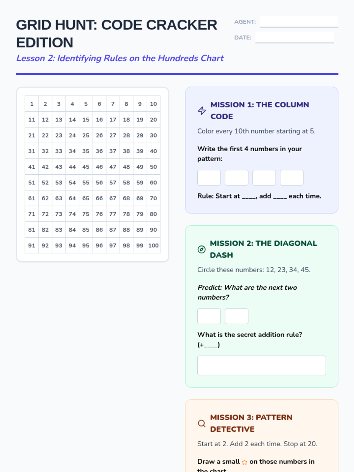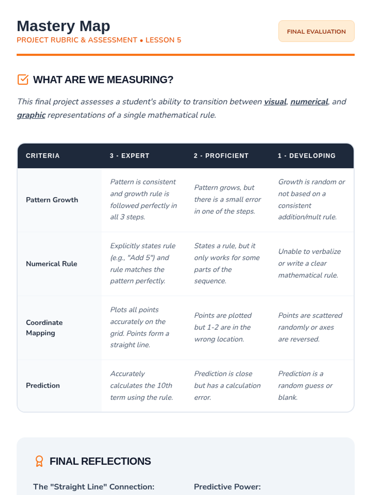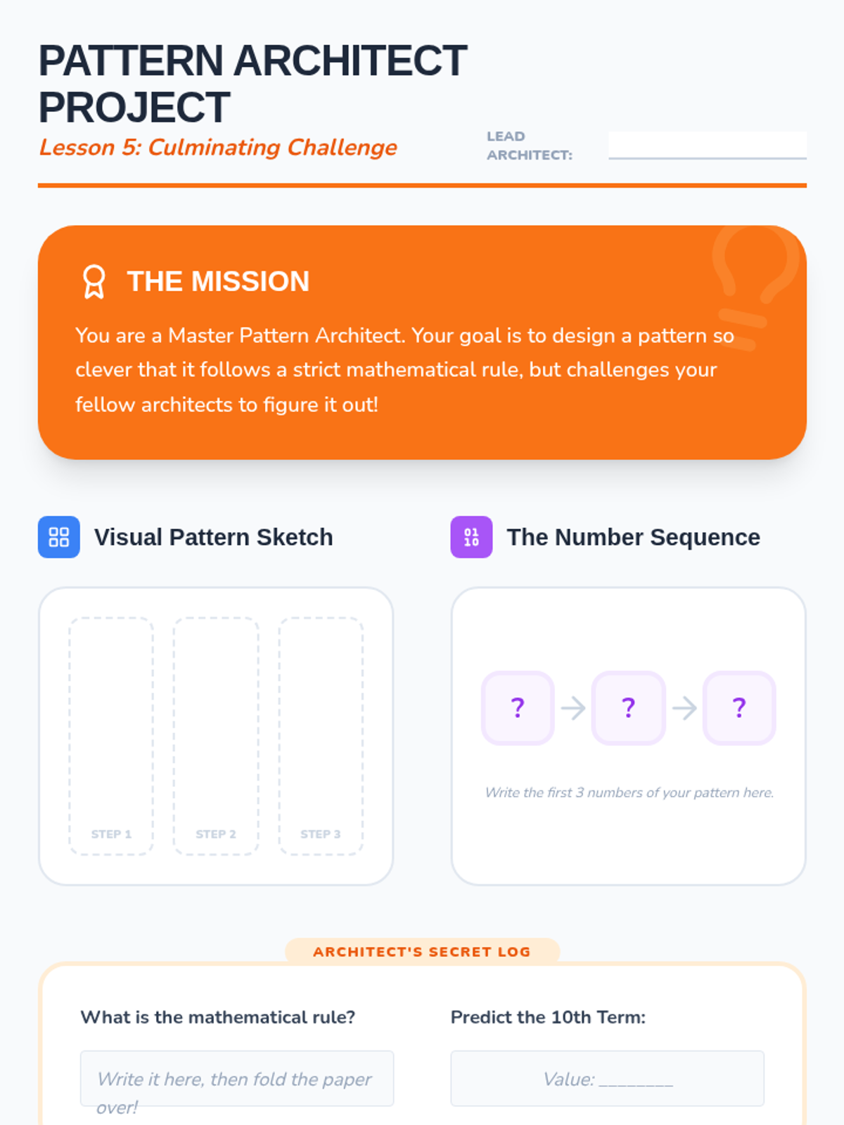 A comprehensive 5-lesson sequence for 3rd graders focused on identifying, extending, and creating growing patterns. Students transition from concrete geometric shapes to numerical sequences and coordinate mapping, building a foundational understanding of algebraic rules and functions.