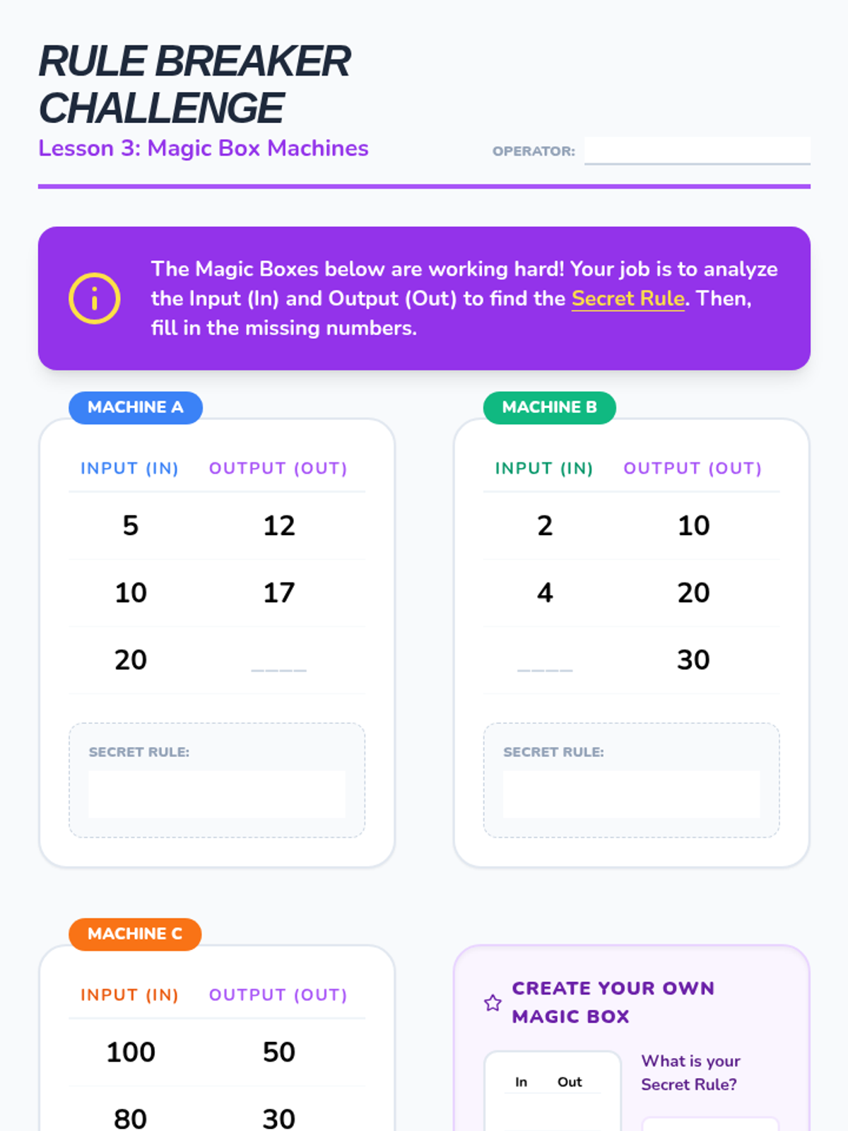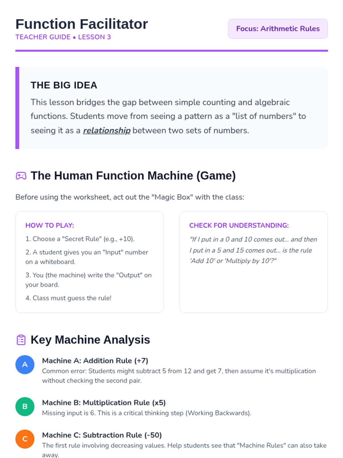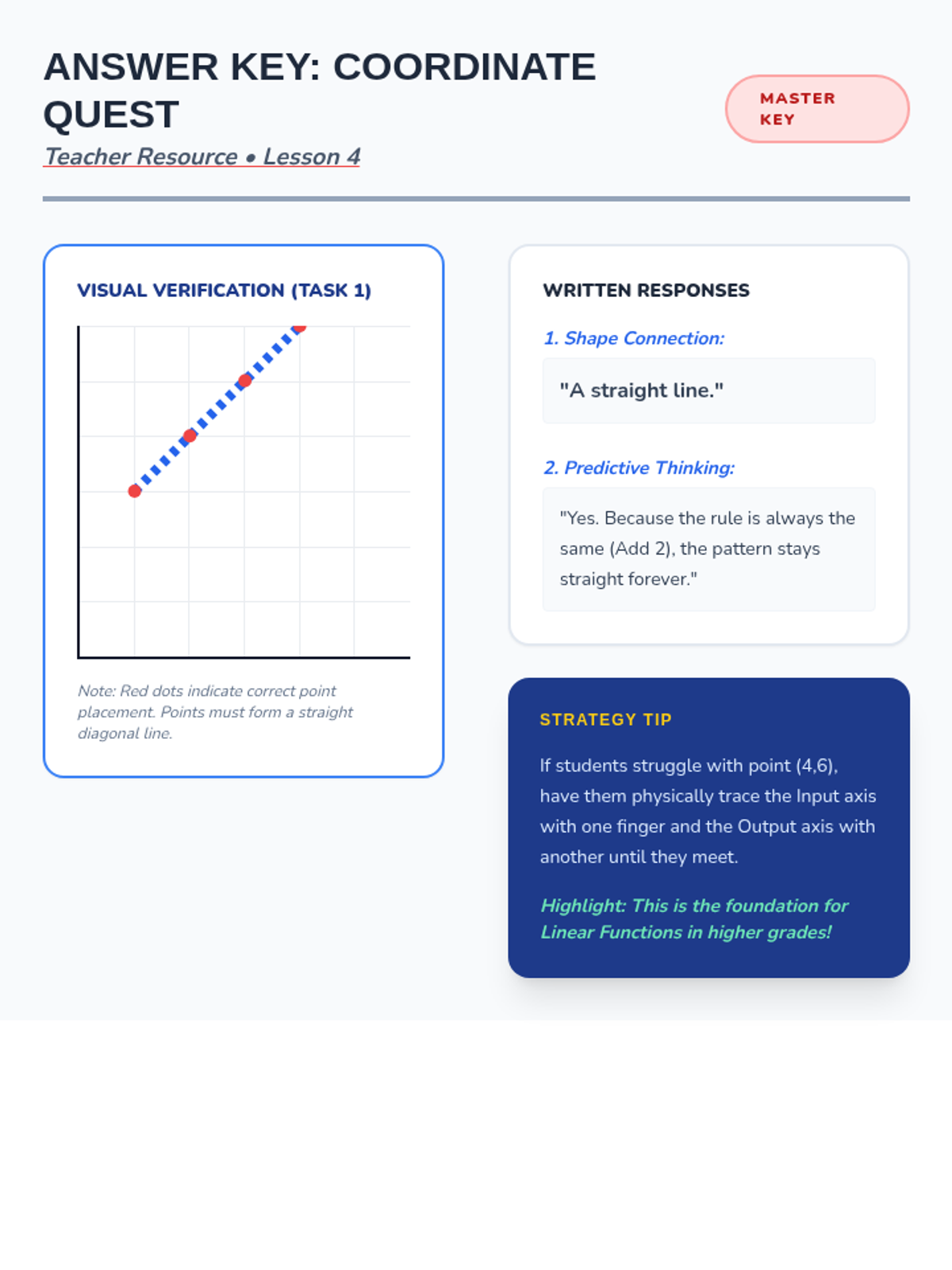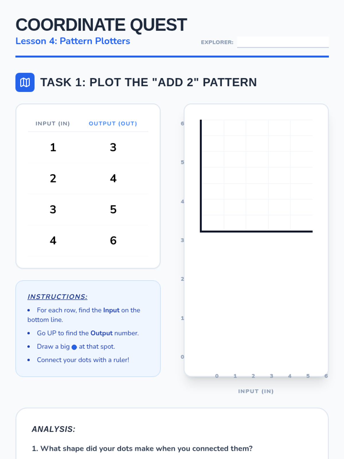 A comprehensive 5-lesson sequence for 3rd graders focused on identifying, extending, and creating growing patterns. Students transition from concrete geometric shapes to numerical sequences and coordinate mapping, building a foundational understanding of algebraic rules and functions.