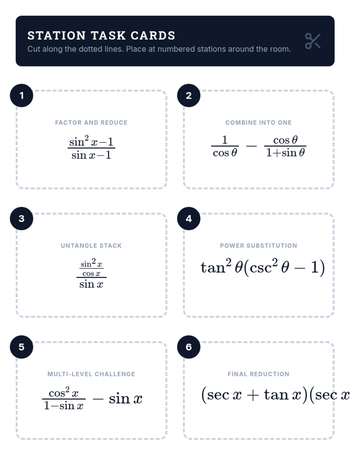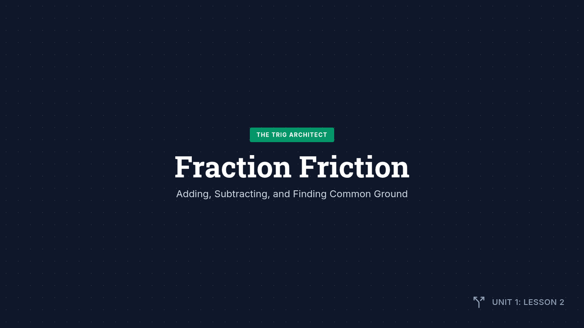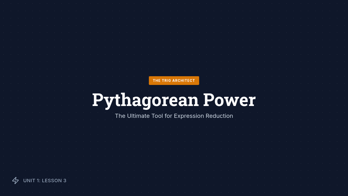 This workshop-style sequence focuses on the mechanics of simplifying complex trigonometric expressions using algebraic techniques like factoring, combining fractions, and Pythagorean substitution. Students learn to treat trigonometric functions as algebraic variables to achieve fluency and precision in preparation for formal proofs.