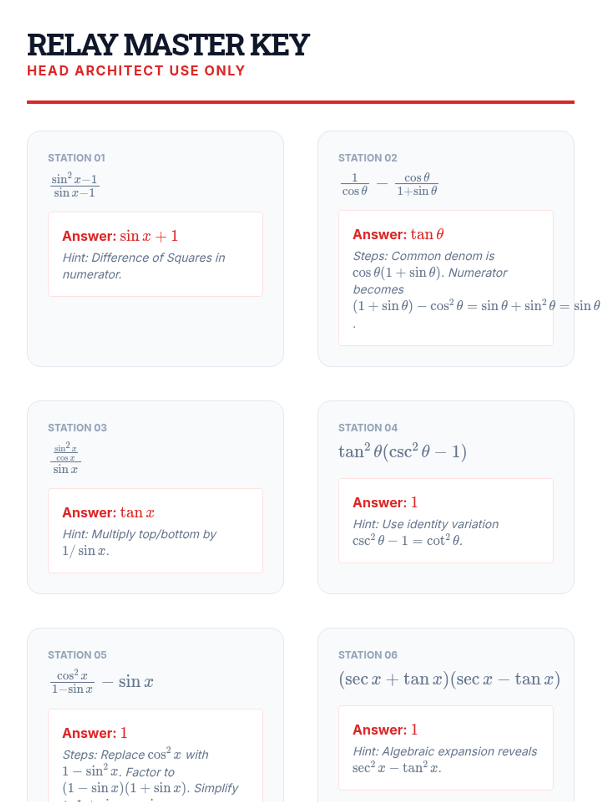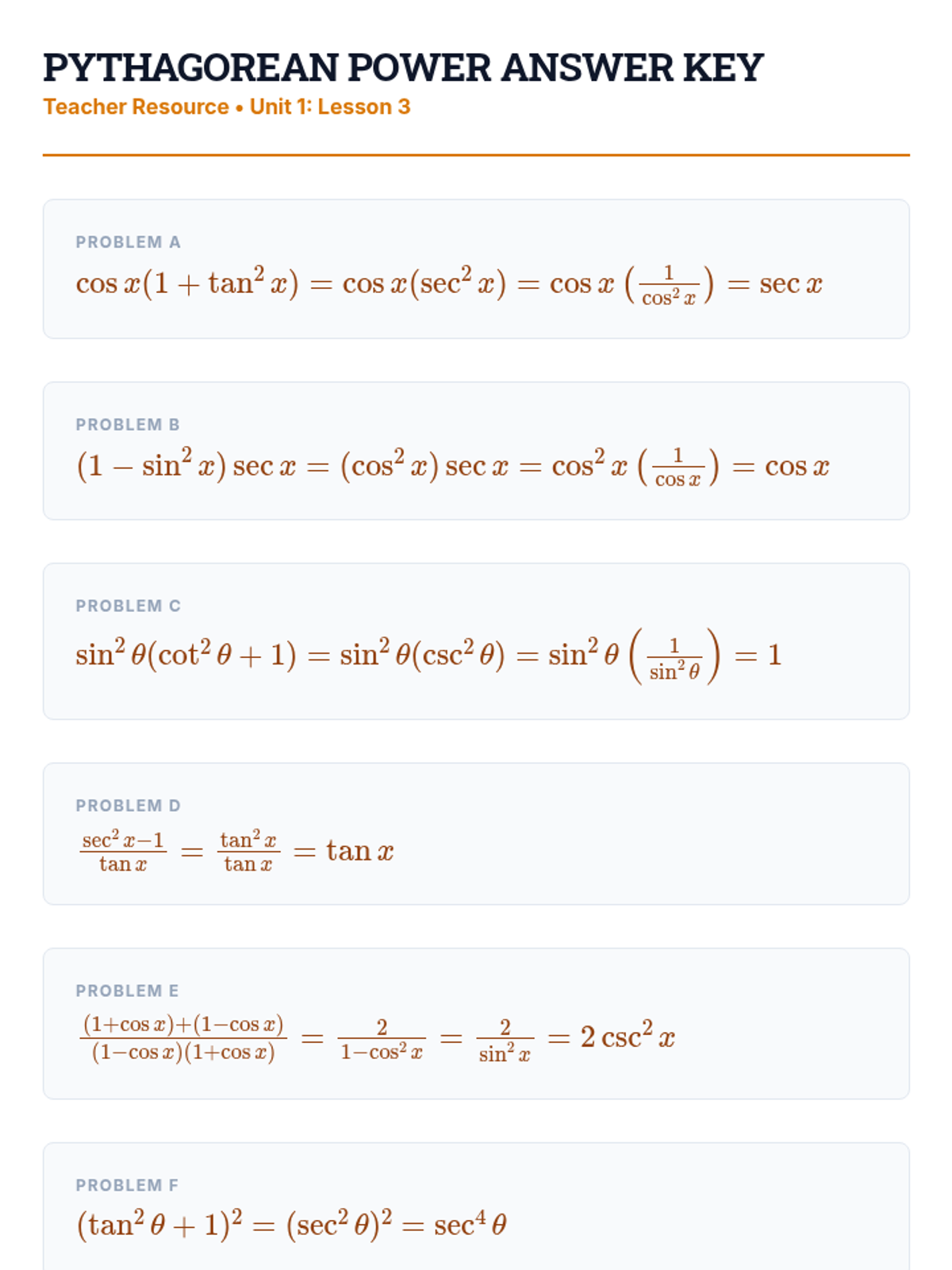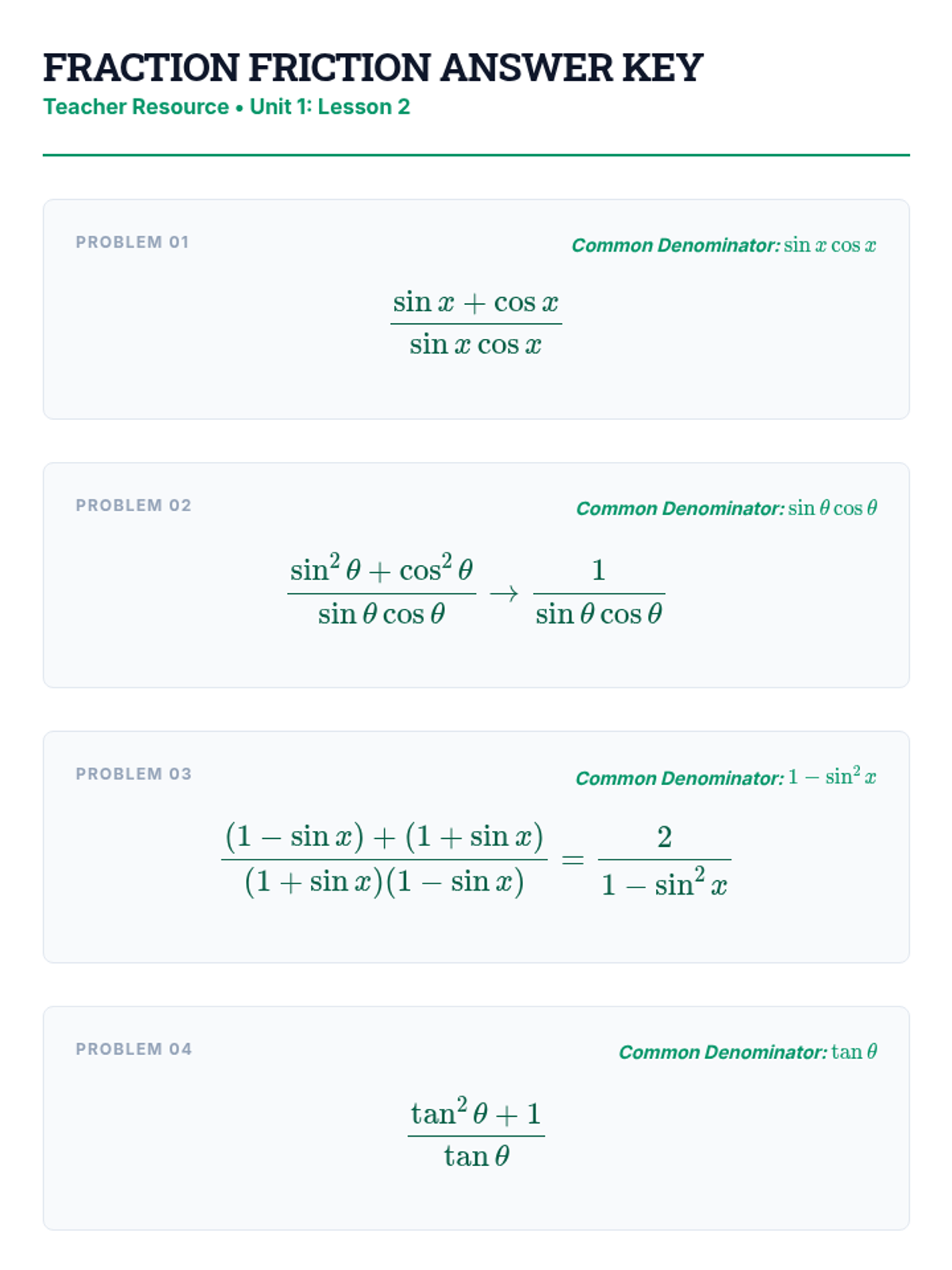 This workshop-style sequence focuses on the mechanics of simplifying complex trigonometric expressions using algebraic techniques like factoring, combining fractions, and Pythagorean substitution. Students learn to treat trigonometric functions as algebraic variables to achieve fluency and precision in preparation for formal proofs.