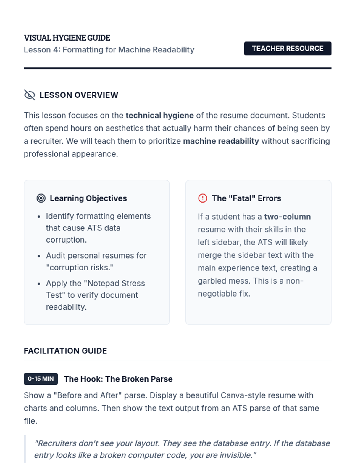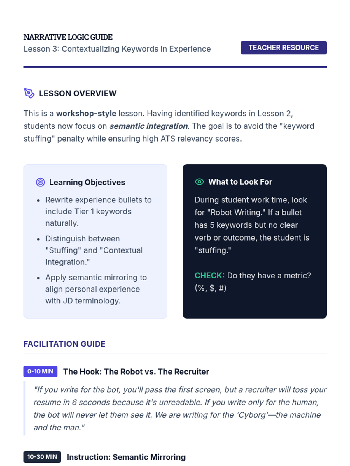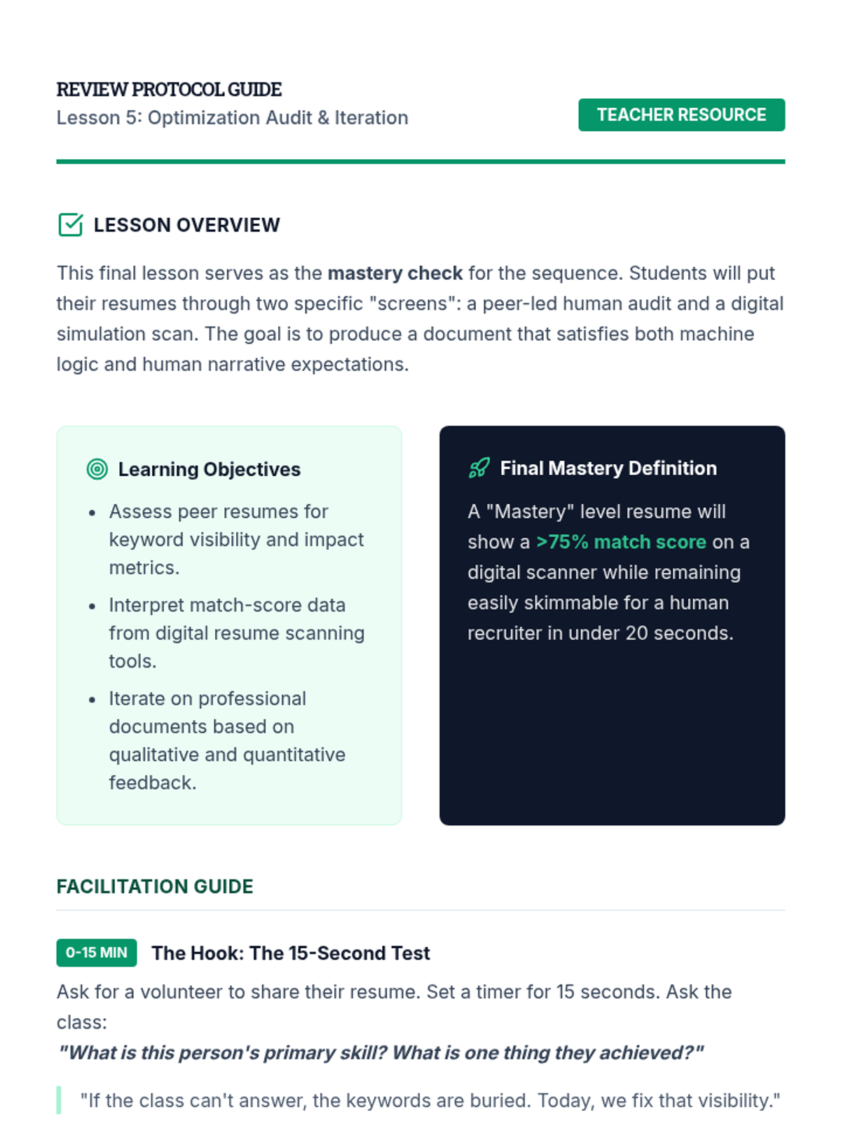 A comprehensive sequence for graduate students to master resume optimization for Applicant Tracking Systems (ATS). Students move from understanding the mechanics of parsing algorithms to identifying keywords, contextualizing skills, and formatting for maximum machine readability and human impact.