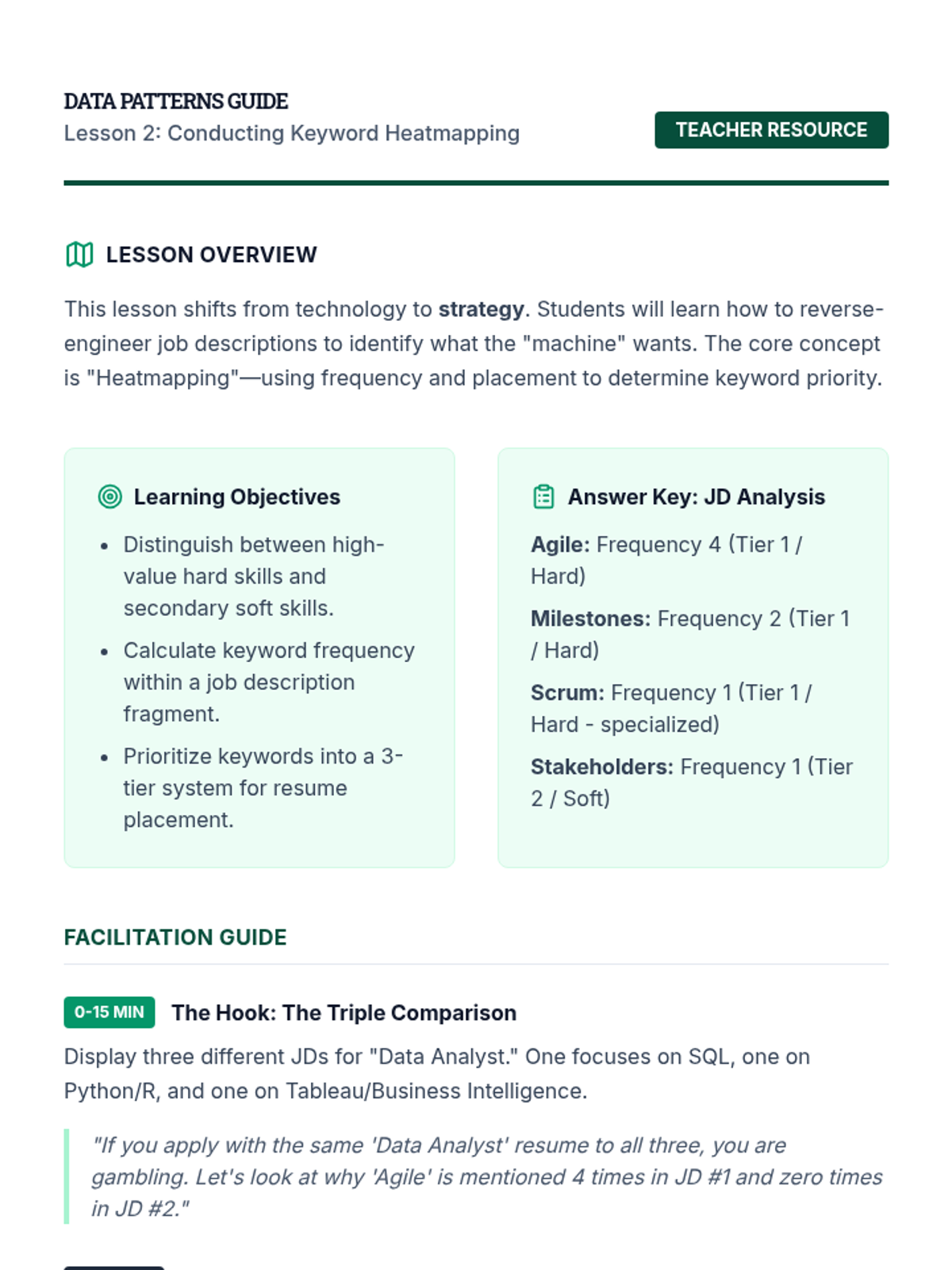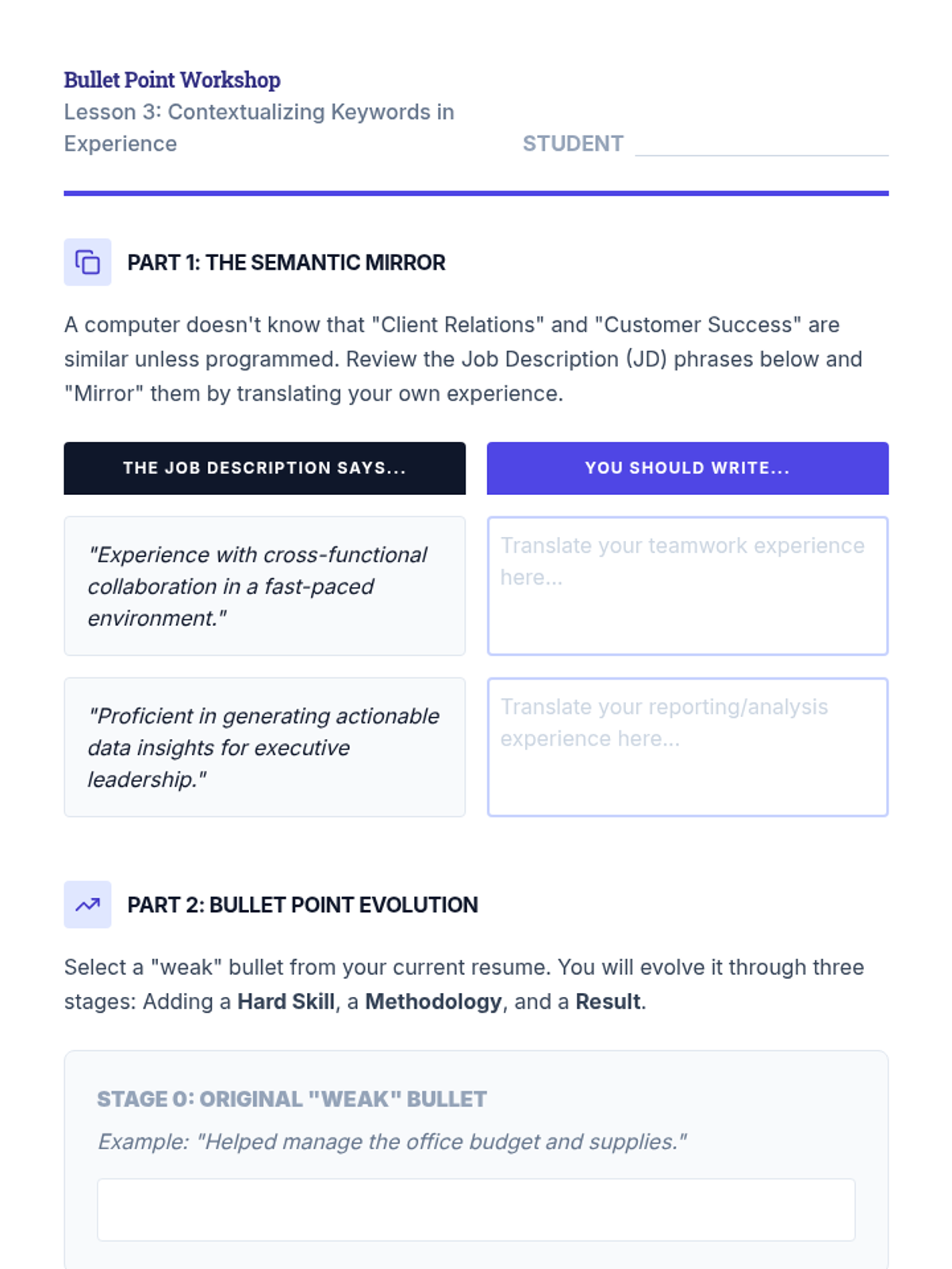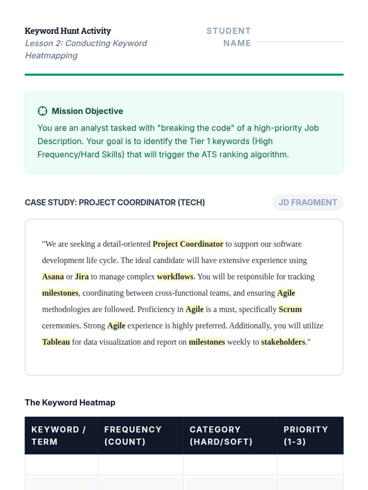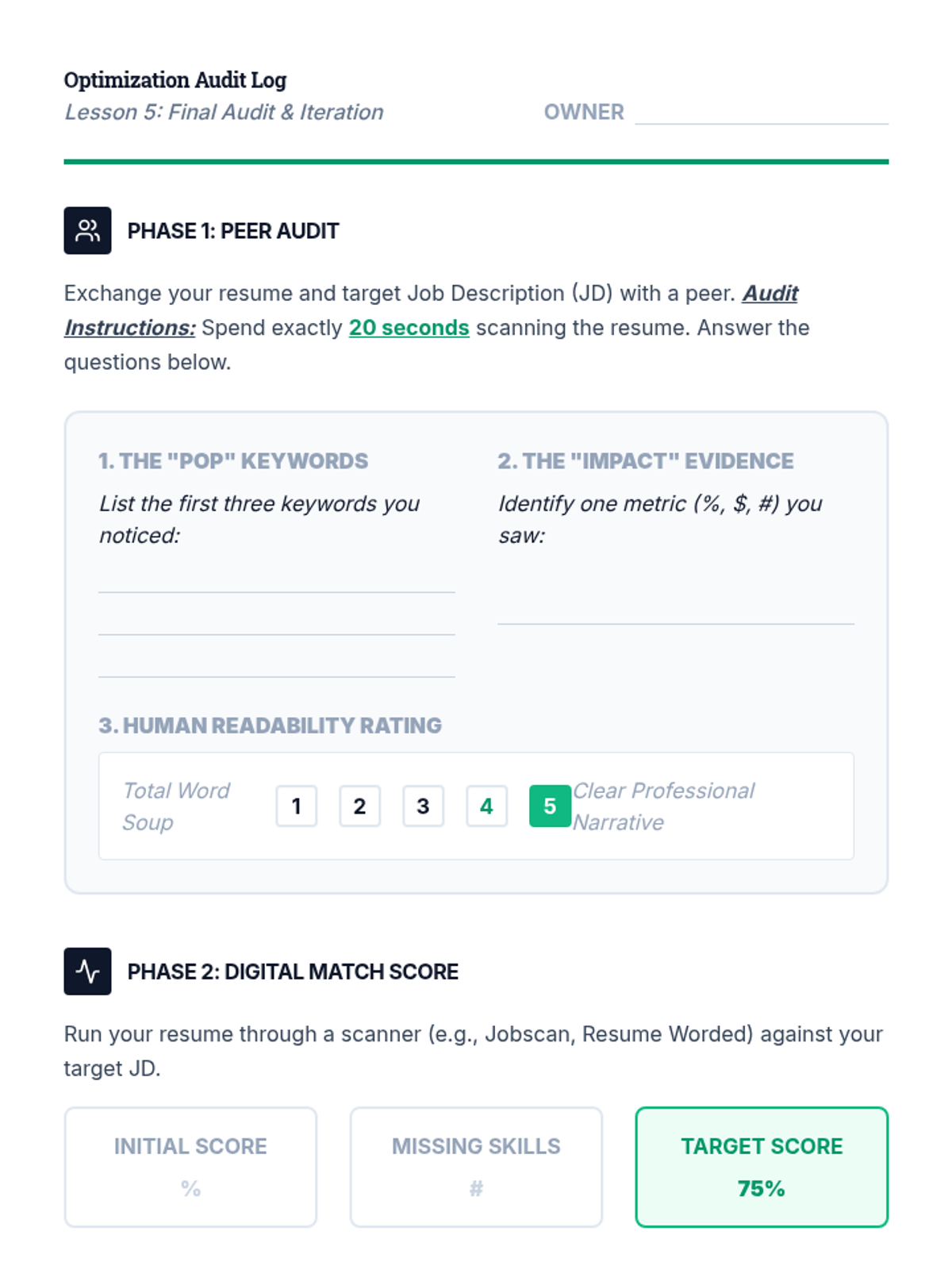 A comprehensive sequence for graduate students to master resume optimization for Applicant Tracking Systems (ATS). Students move from understanding the mechanics of parsing algorithms to identifying keywords, contextualizing skills, and formatting for maximum machine readability and human impact.