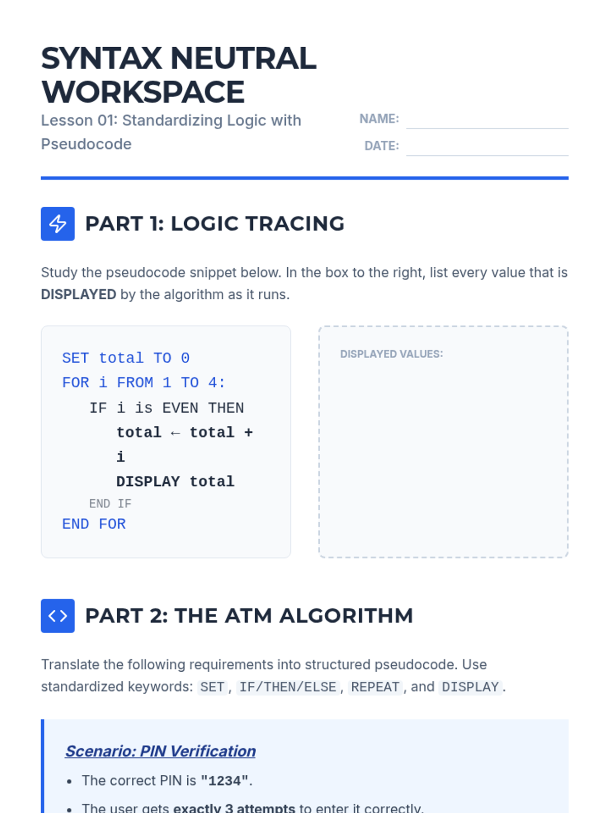 This sequence transitions 11th-grade students from abstract computational concepts to the rigorous design of specific algorithms using pseudocode and flowcharts. Students explore searching and sorting mechanisms, trace execution flow, and focus on debugging logic for robust, error-free procedures.