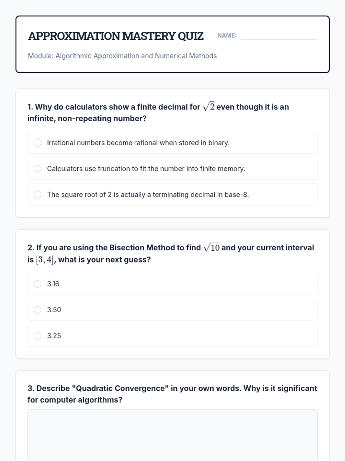 An exploration of how irrational numbers are approximated in science, engineering, and computer science using algorithms like the Bisection Method and Newton's Method.