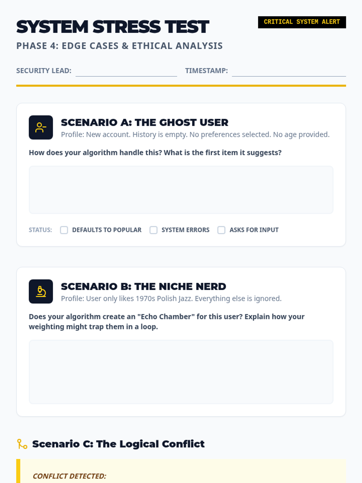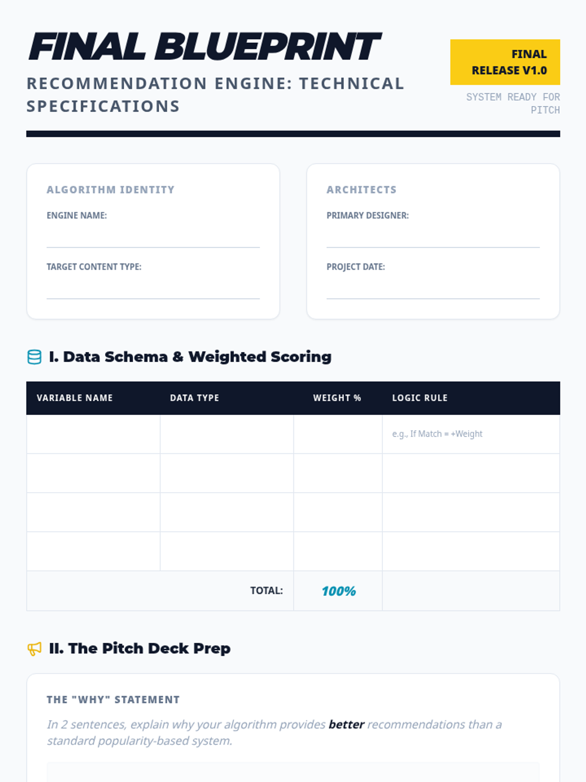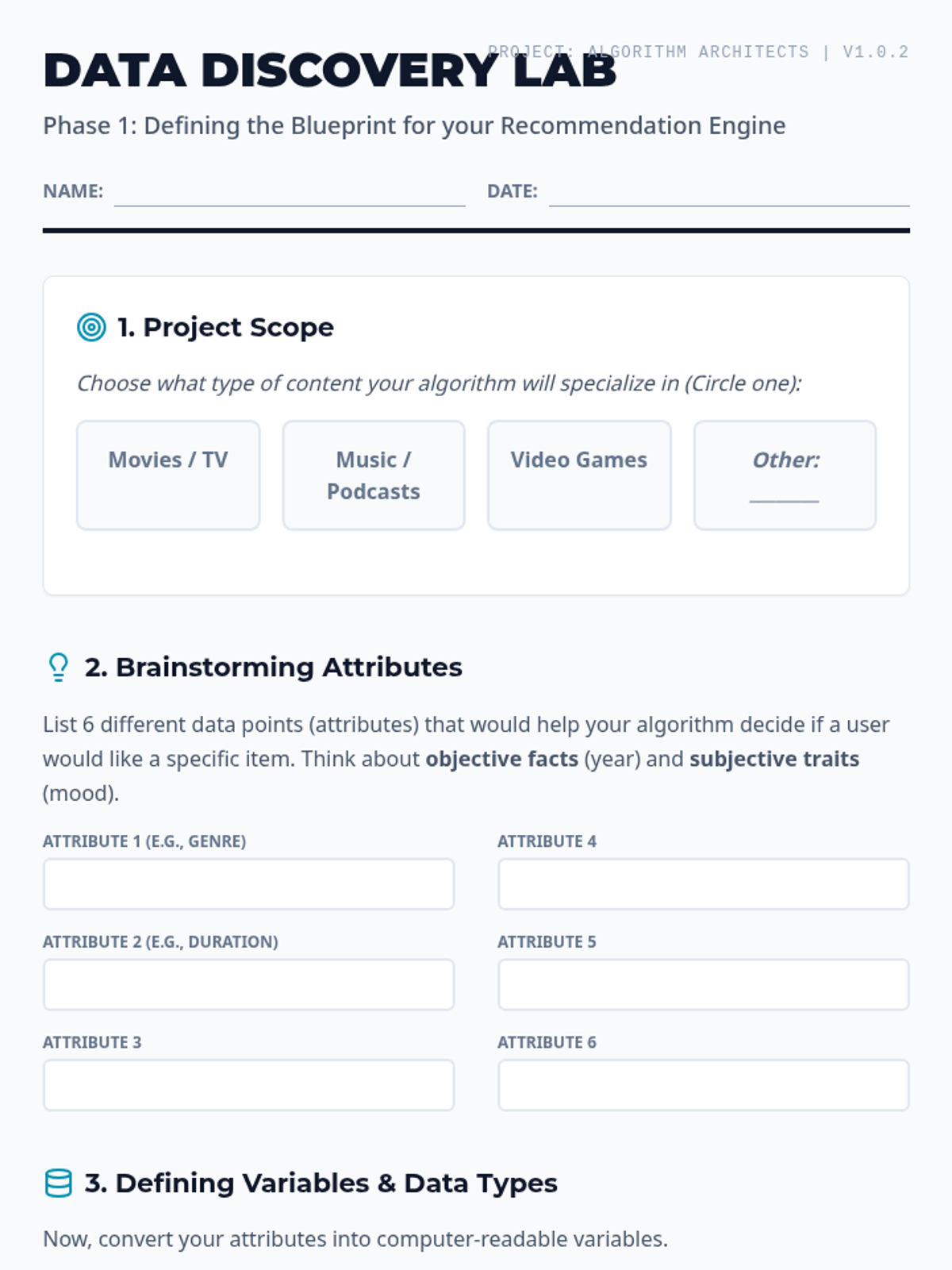 A project-based sequence where 9th-grade students design a 'Recommendation Engine' algorithm. They move from data modeling and weighted scoring to control flow, bias analysis, and technical optimization, culminating in a logical pitch of their system.