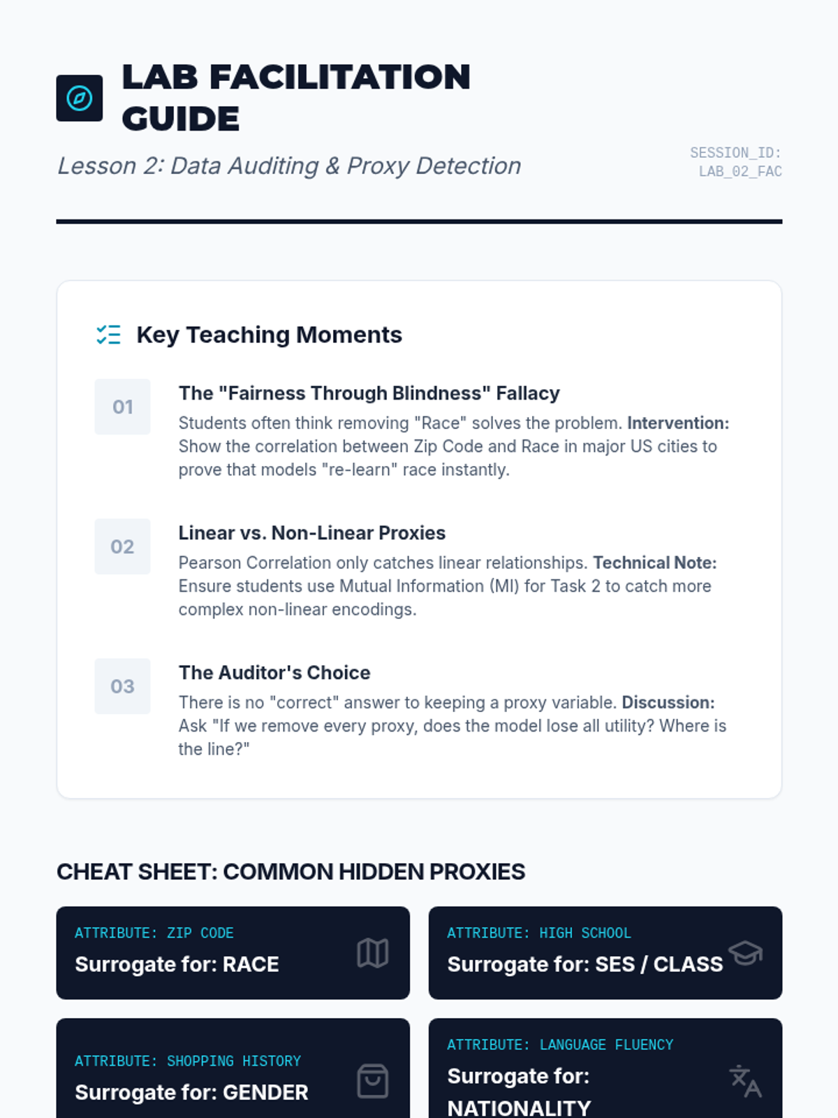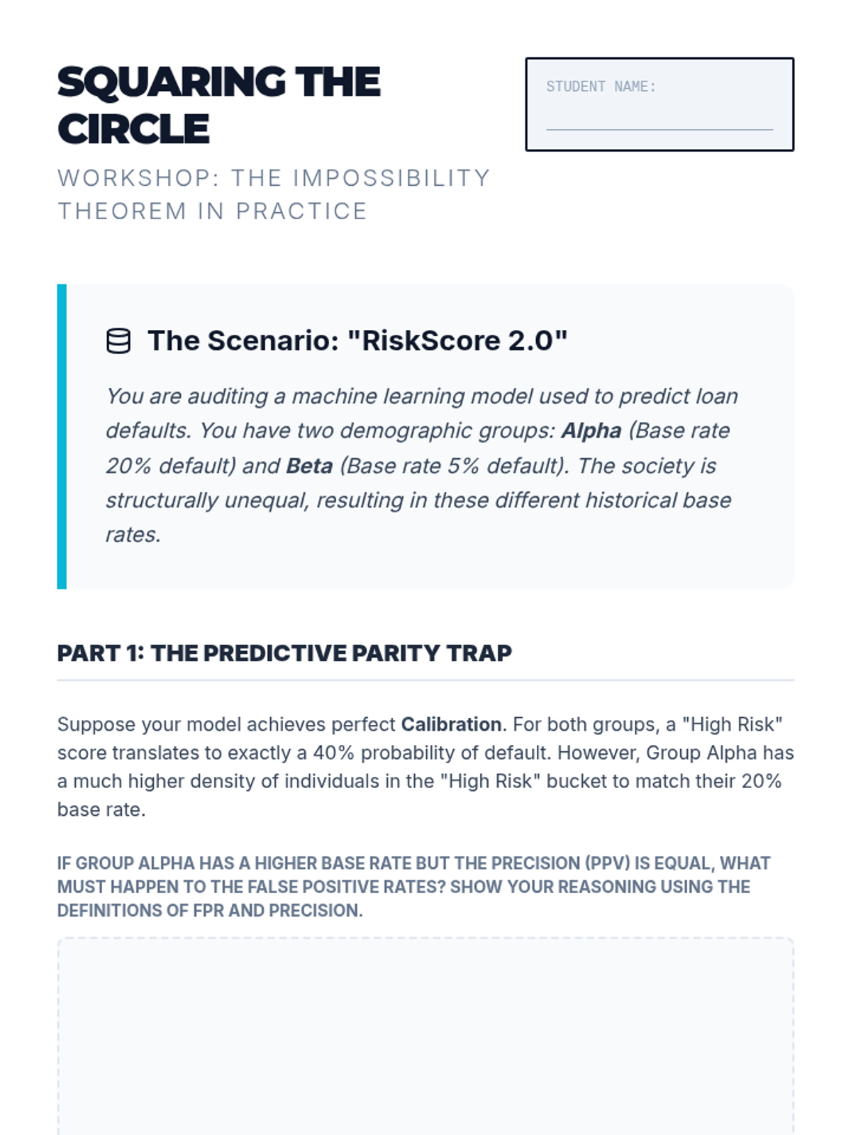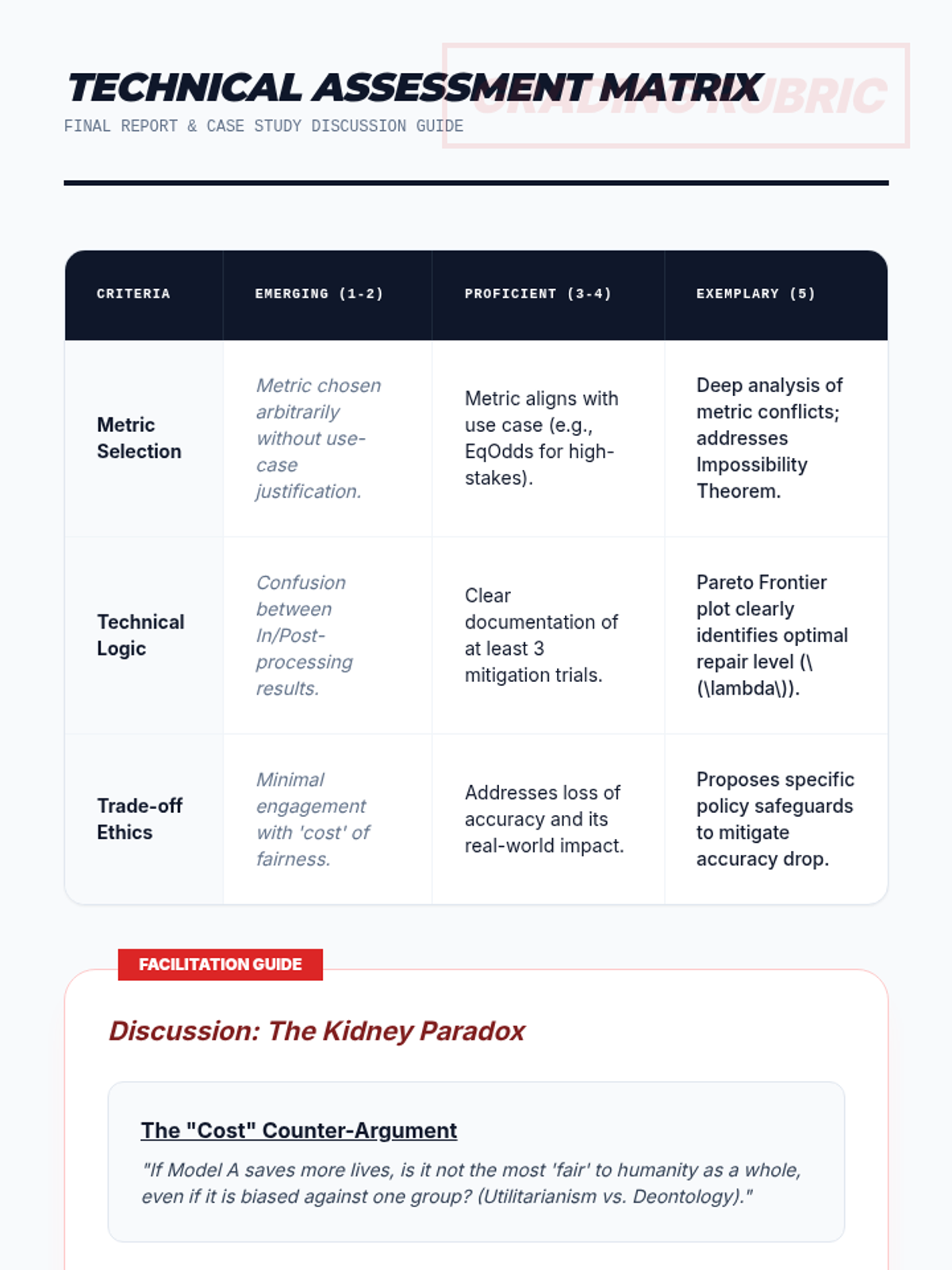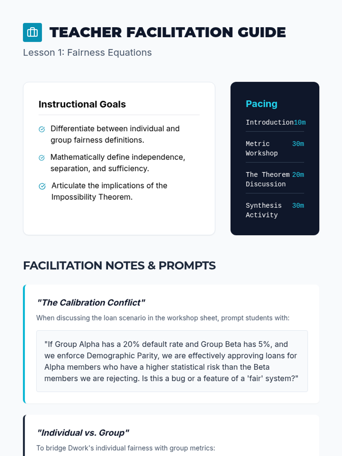 A technical workshop sequence for graduate students bridging abstract fairness concepts with executable code, exploring mathematical definitions, bias mitigation algorithms, and the accuracy-fairness trade-off.
