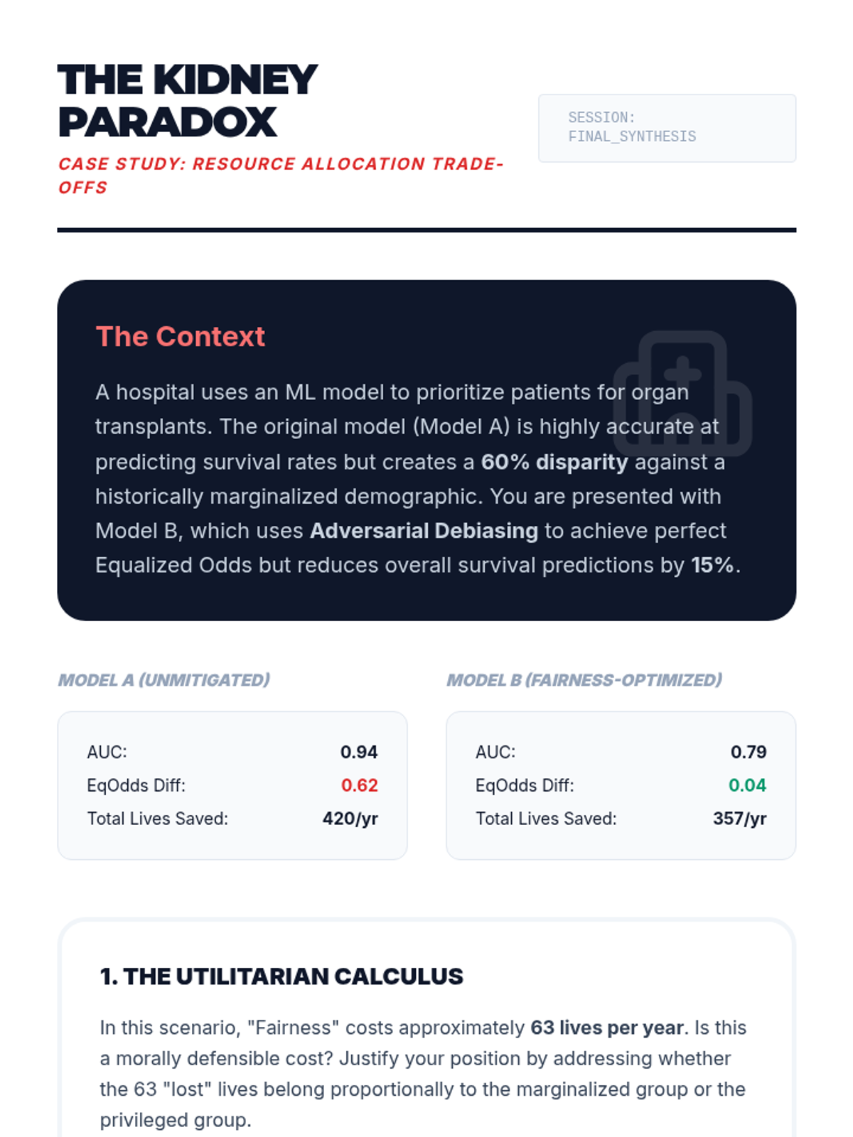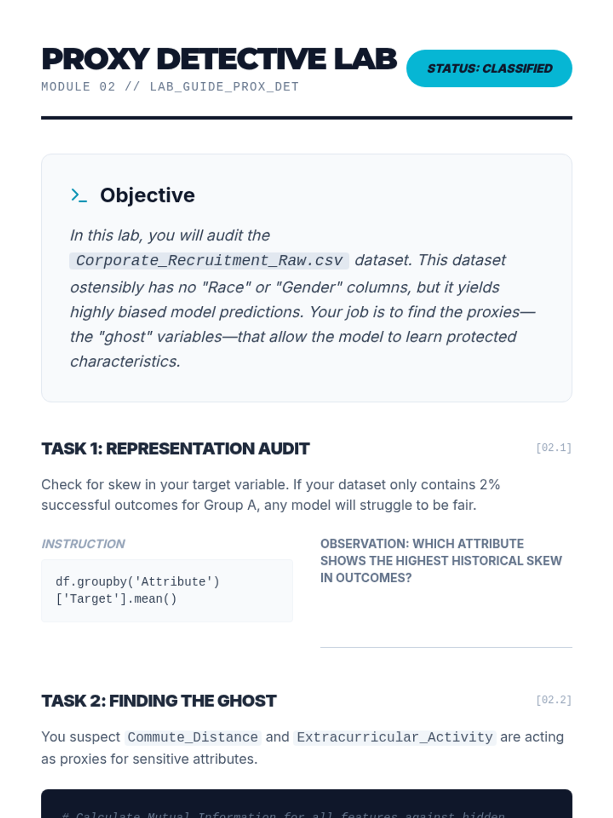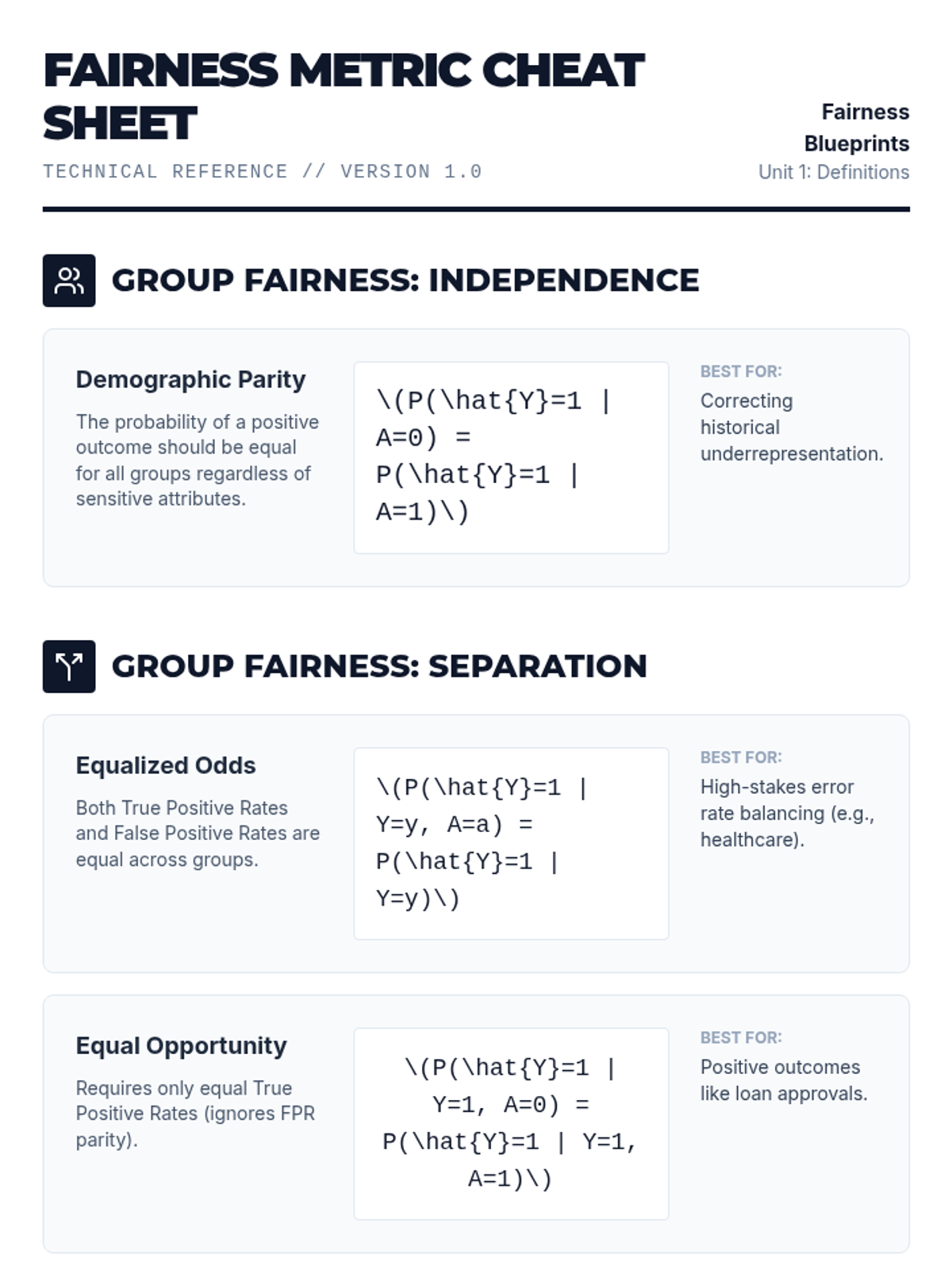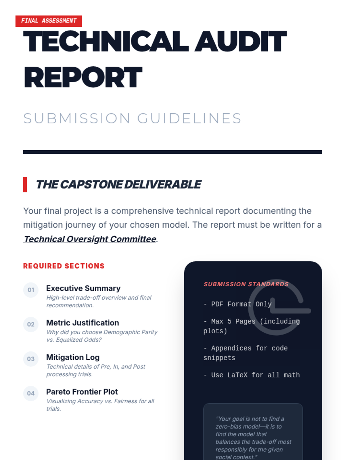 A technical workshop sequence for graduate students bridging abstract fairness concepts with executable code, exploring mathematical definitions, bias mitigation algorithms, and the accuracy-fairness trade-off.