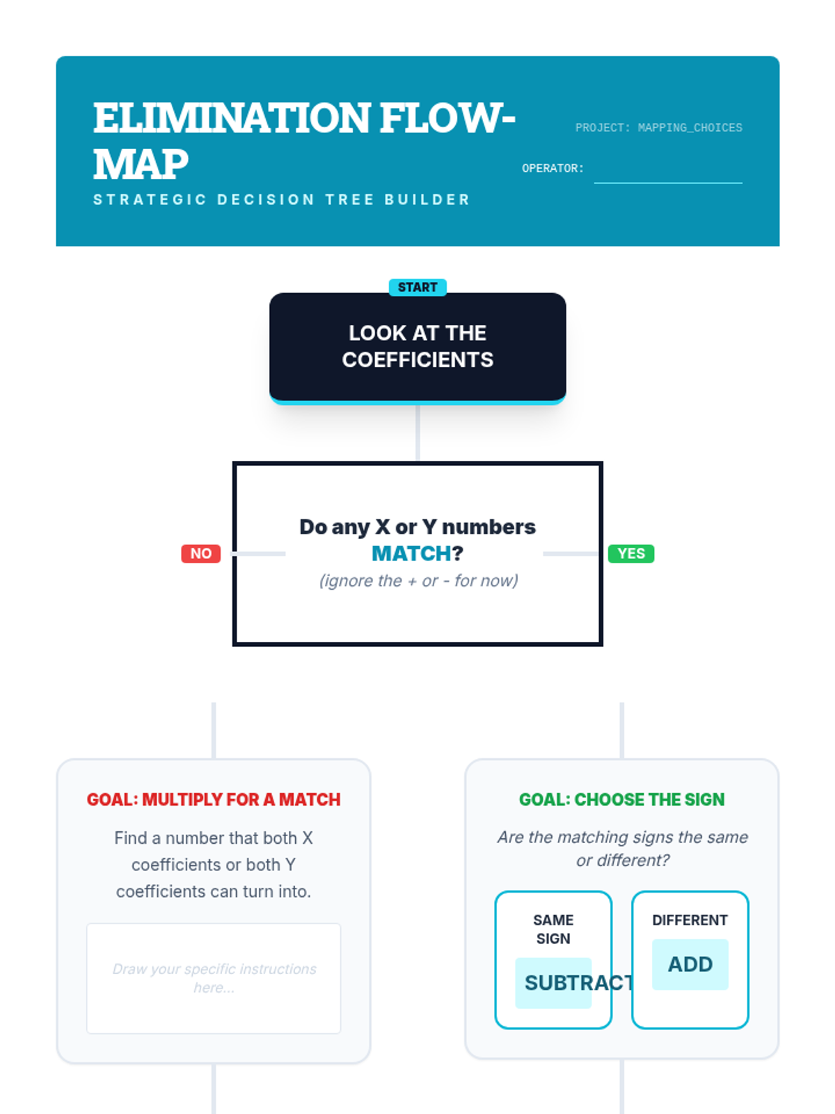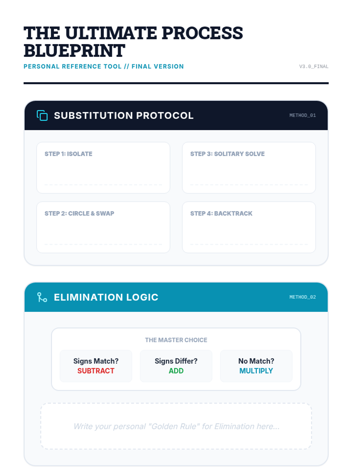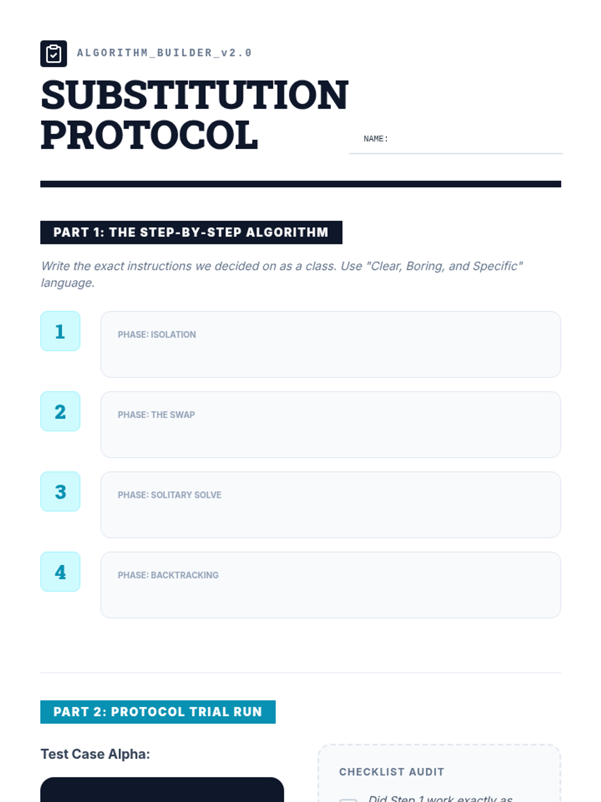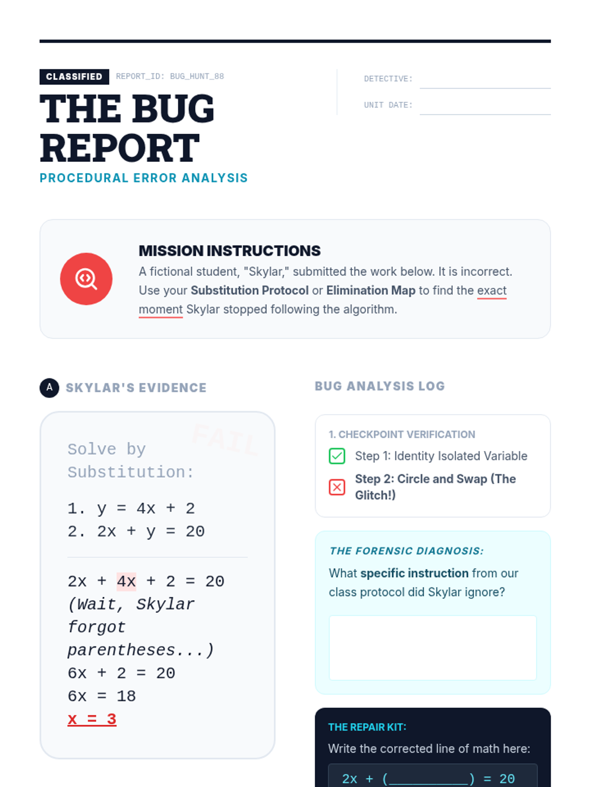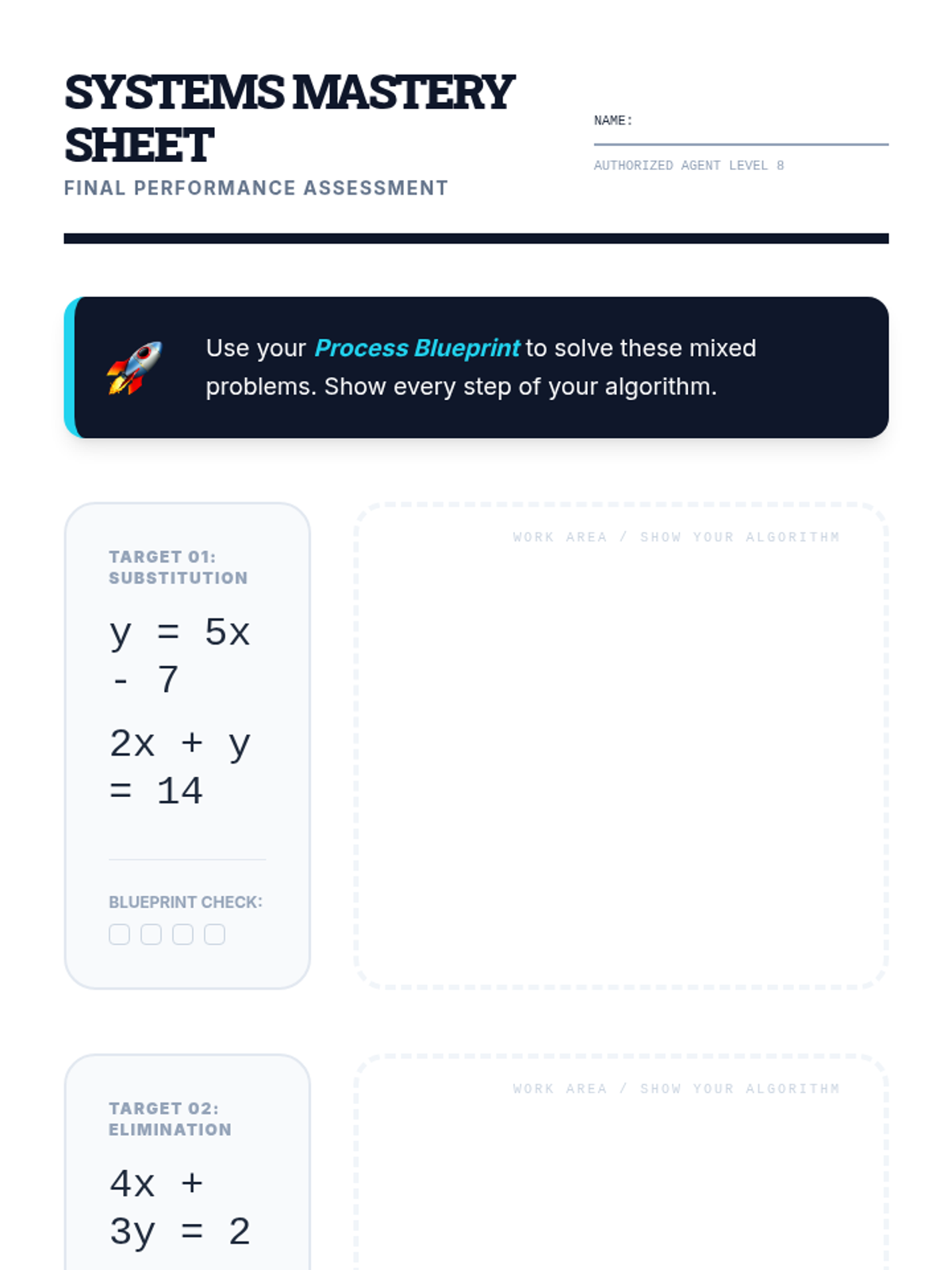 A specialized math sequence for 8th-grade academic support, focusing on breaking down systems of equations into repeatable, algorithmic checklists to support students with executive function challenges. Students transition from task analysis of solved problems to creating and refining their own procedural tools for substitution and elimination.