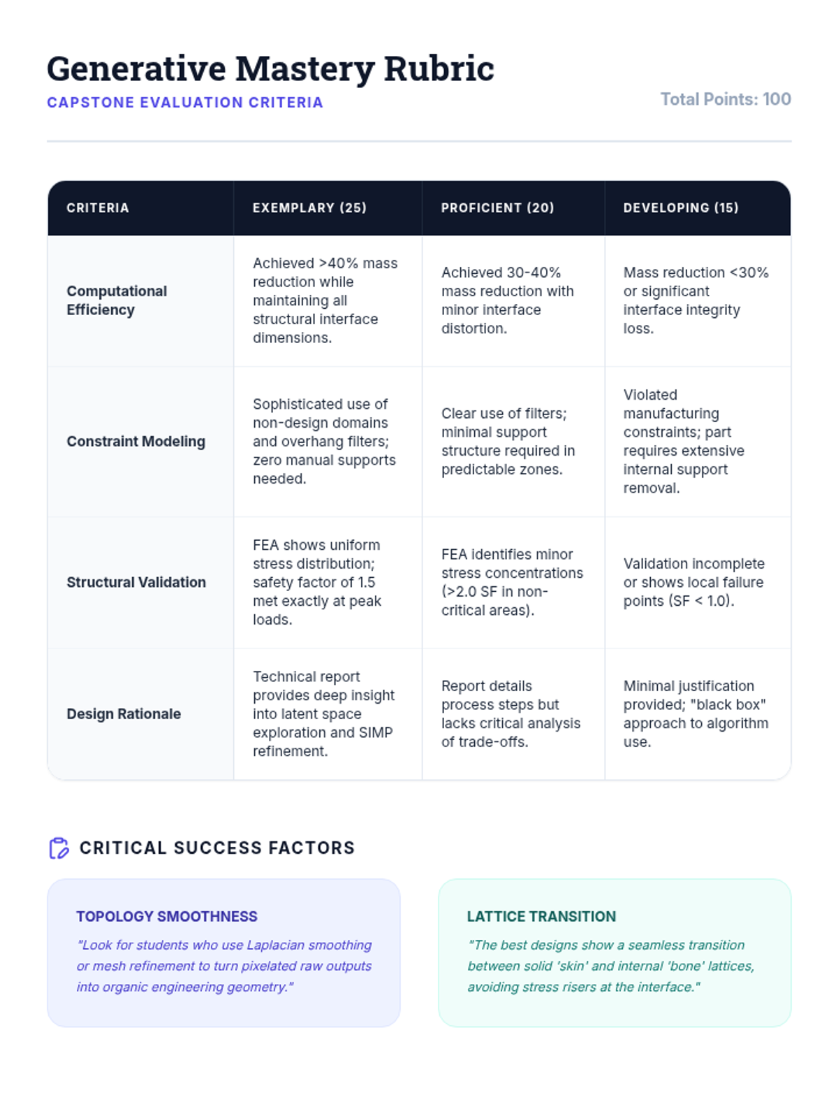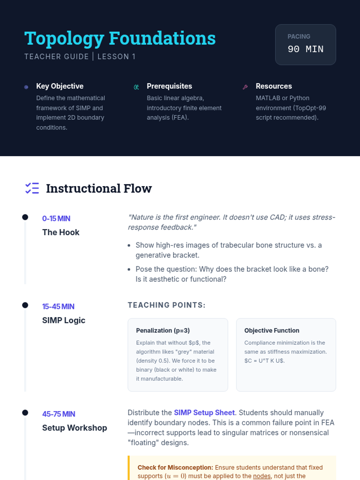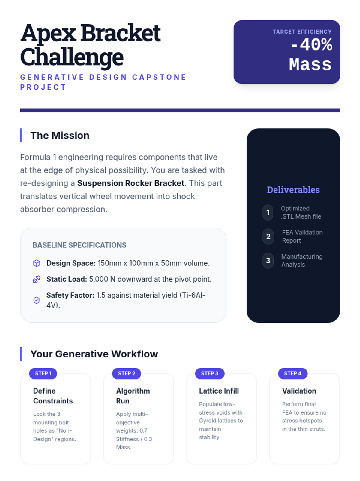 This sequence introduces undergraduate engineering students to algorithmic and generative structural design, moving from classical topology optimization to modern AI-driven generative models. Students learn to define design spaces, apply complex constraints, and utilize lattice structures to create high-performance, lightweight engineering components.