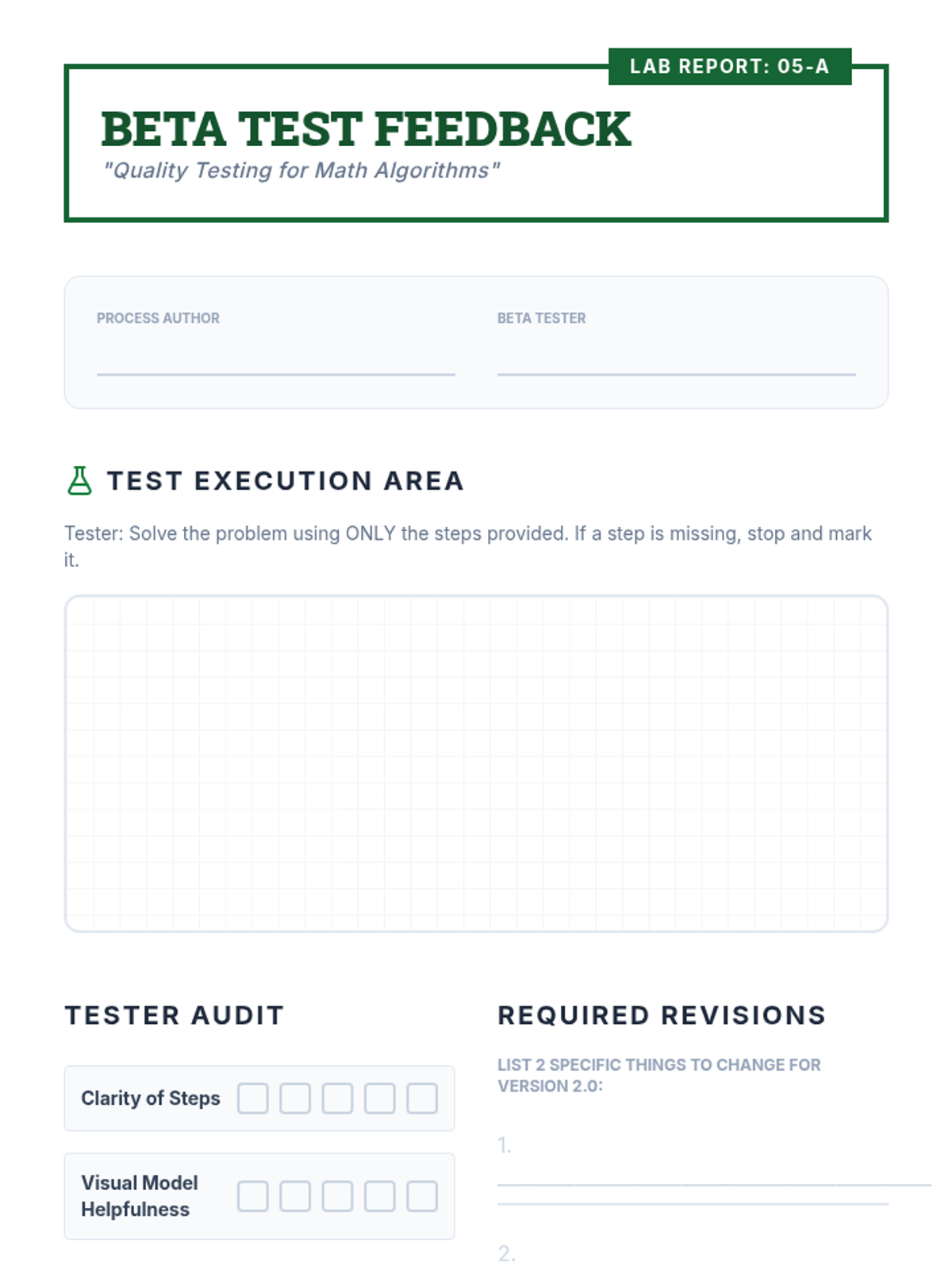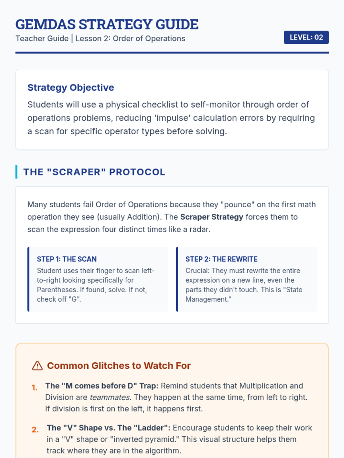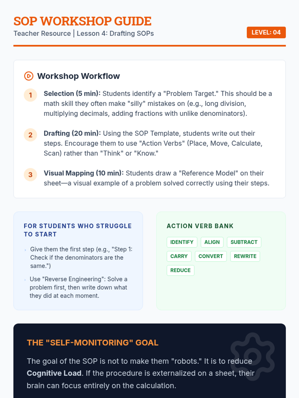 A specialized sequence for 6th-grade students to master complex math problems by breaking them down into algorithmic steps. Students move from analyzing everyday tasks to drafting and testing their own Standard Operating Procedures (SOPs) for math operations, fostering independence and reducing procedural errors.