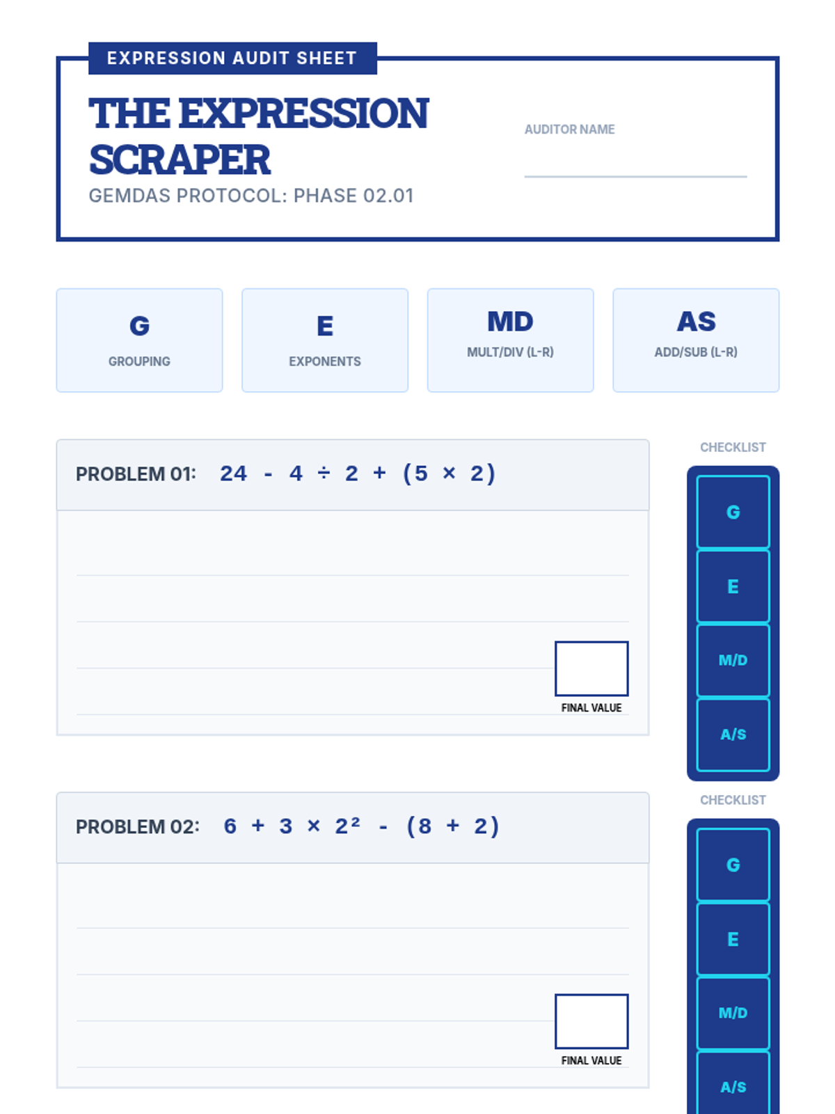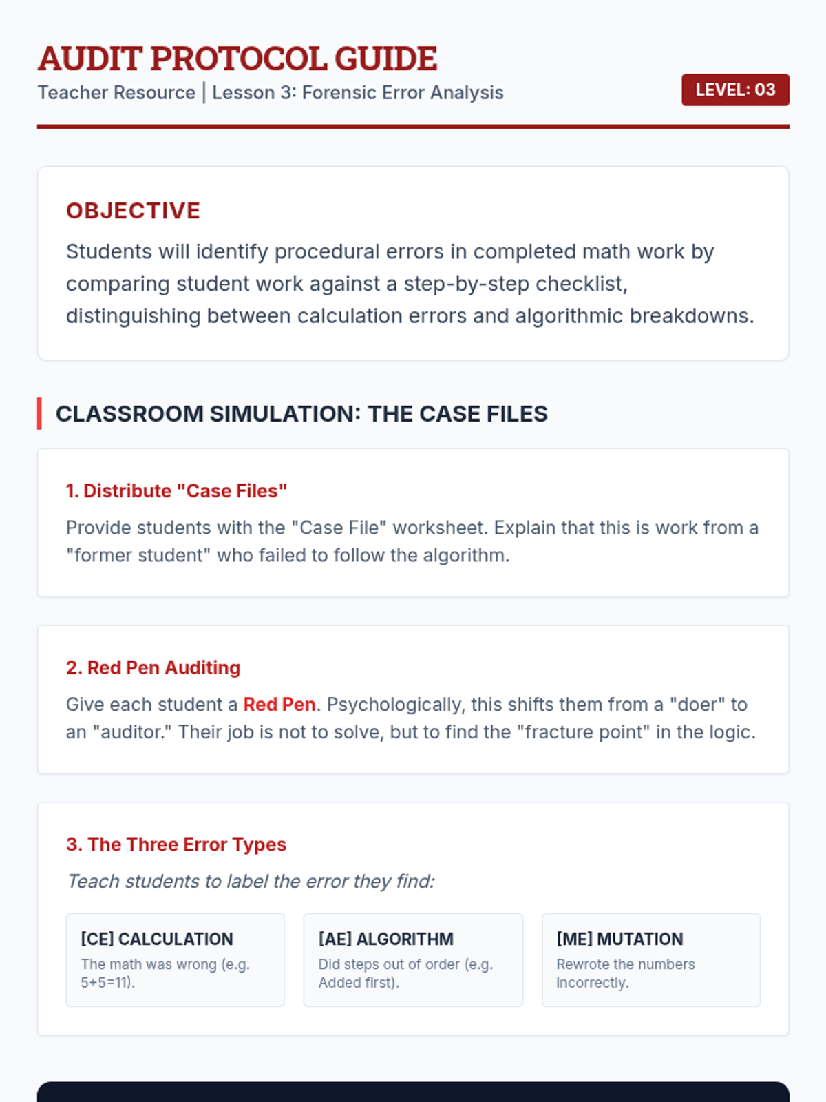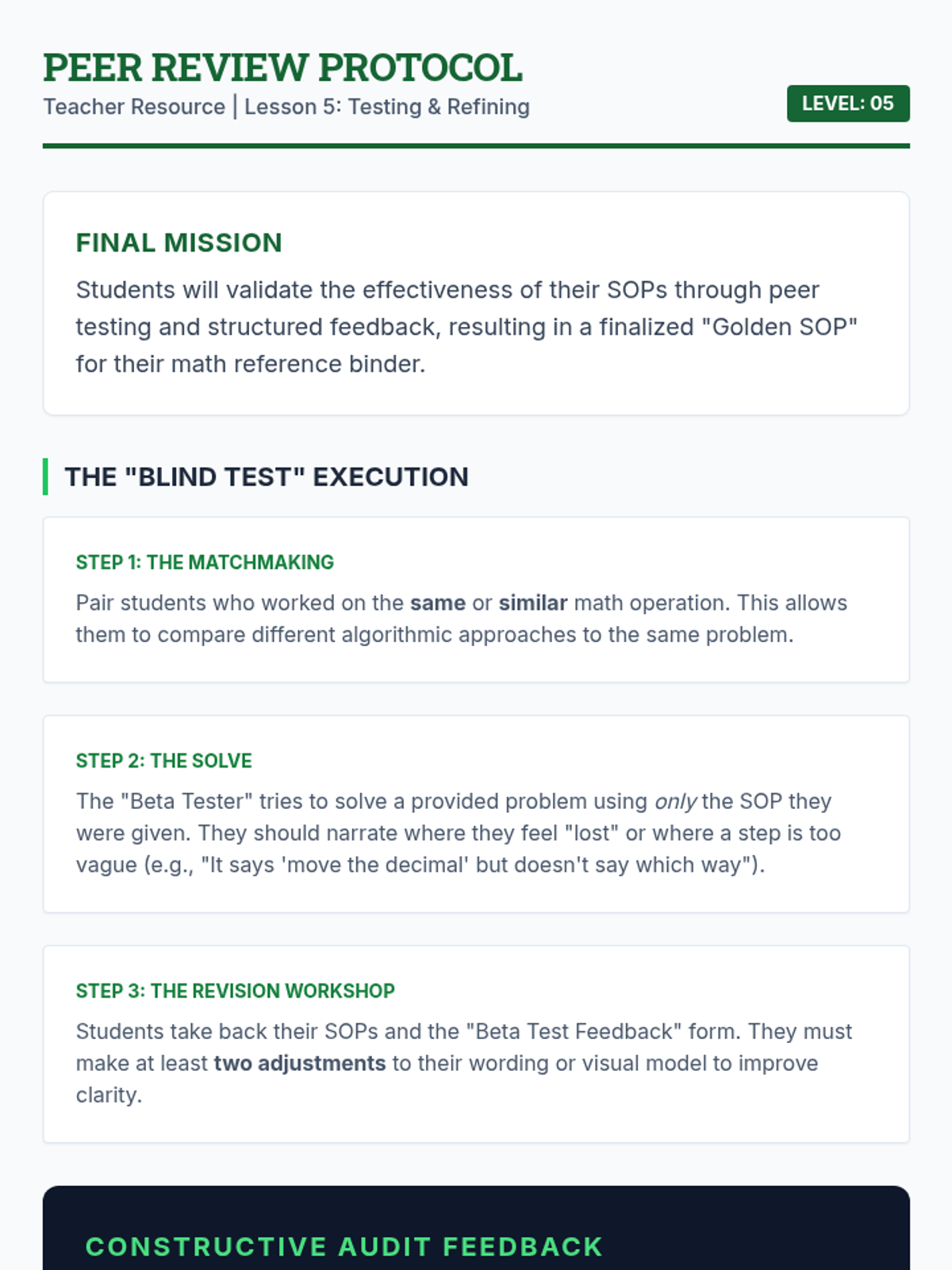 A specialized sequence for 6th-grade students to master complex math problems by breaking them down into algorithmic steps. Students move from analyzing everyday tasks to drafting and testing their own Standard Operating Procedures (SOPs) for math operations, fostering independence and reducing procedural errors.
