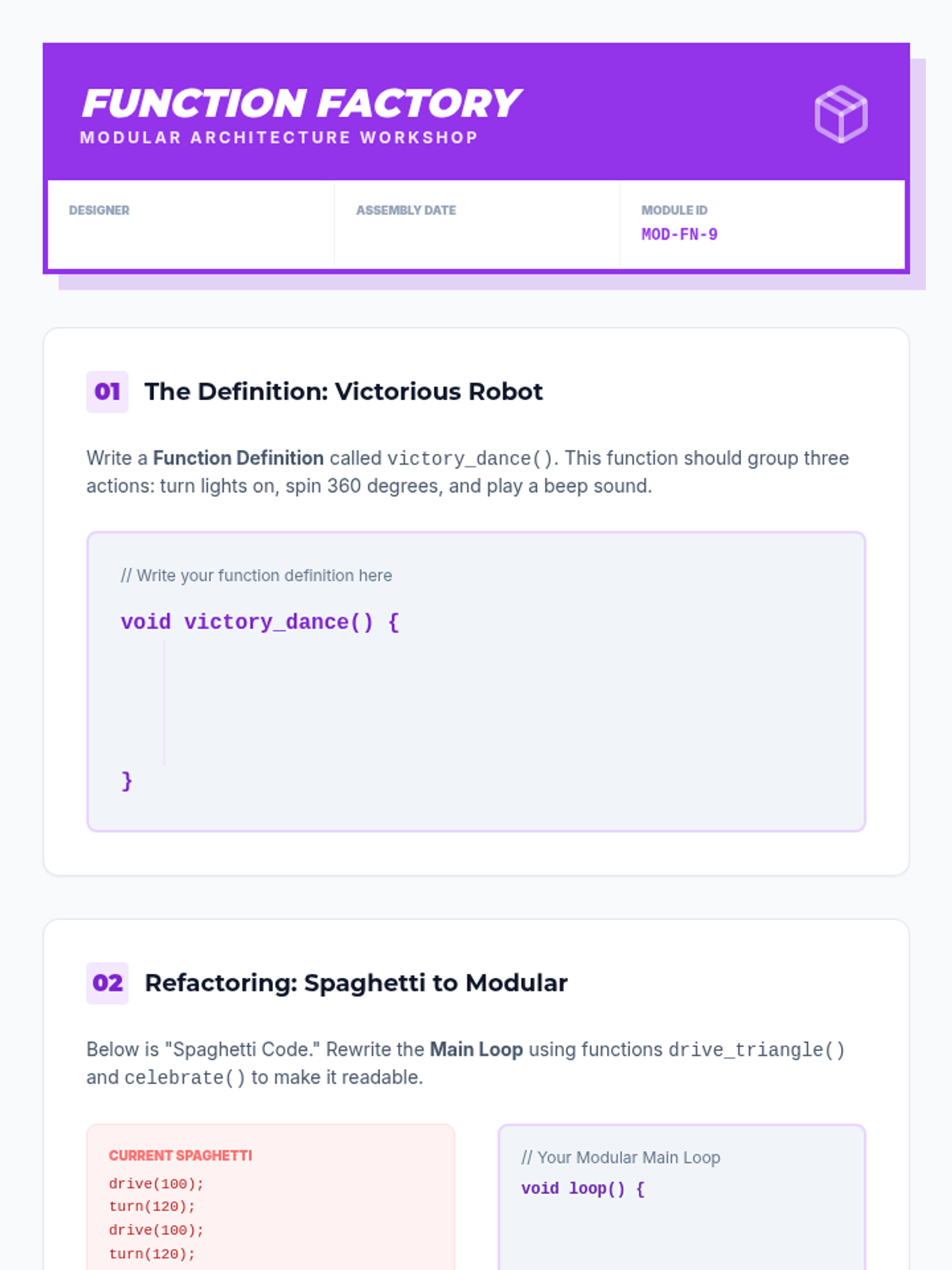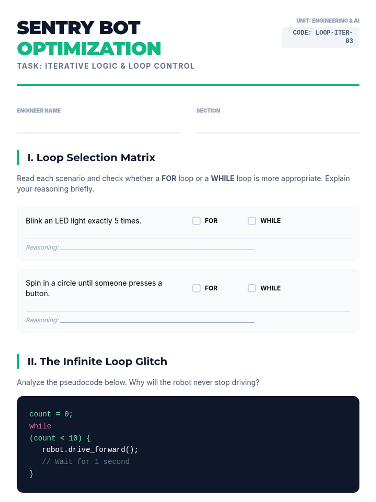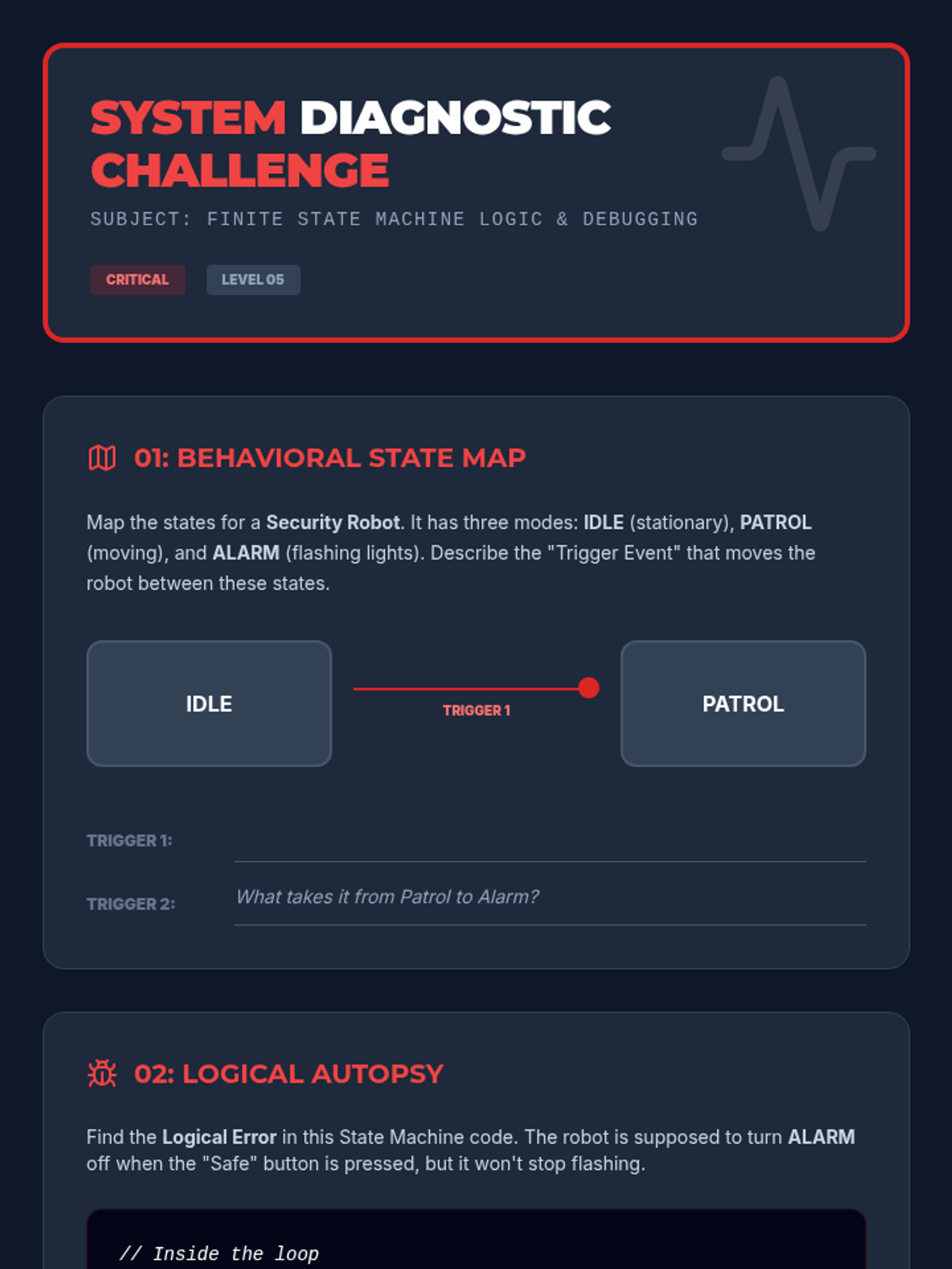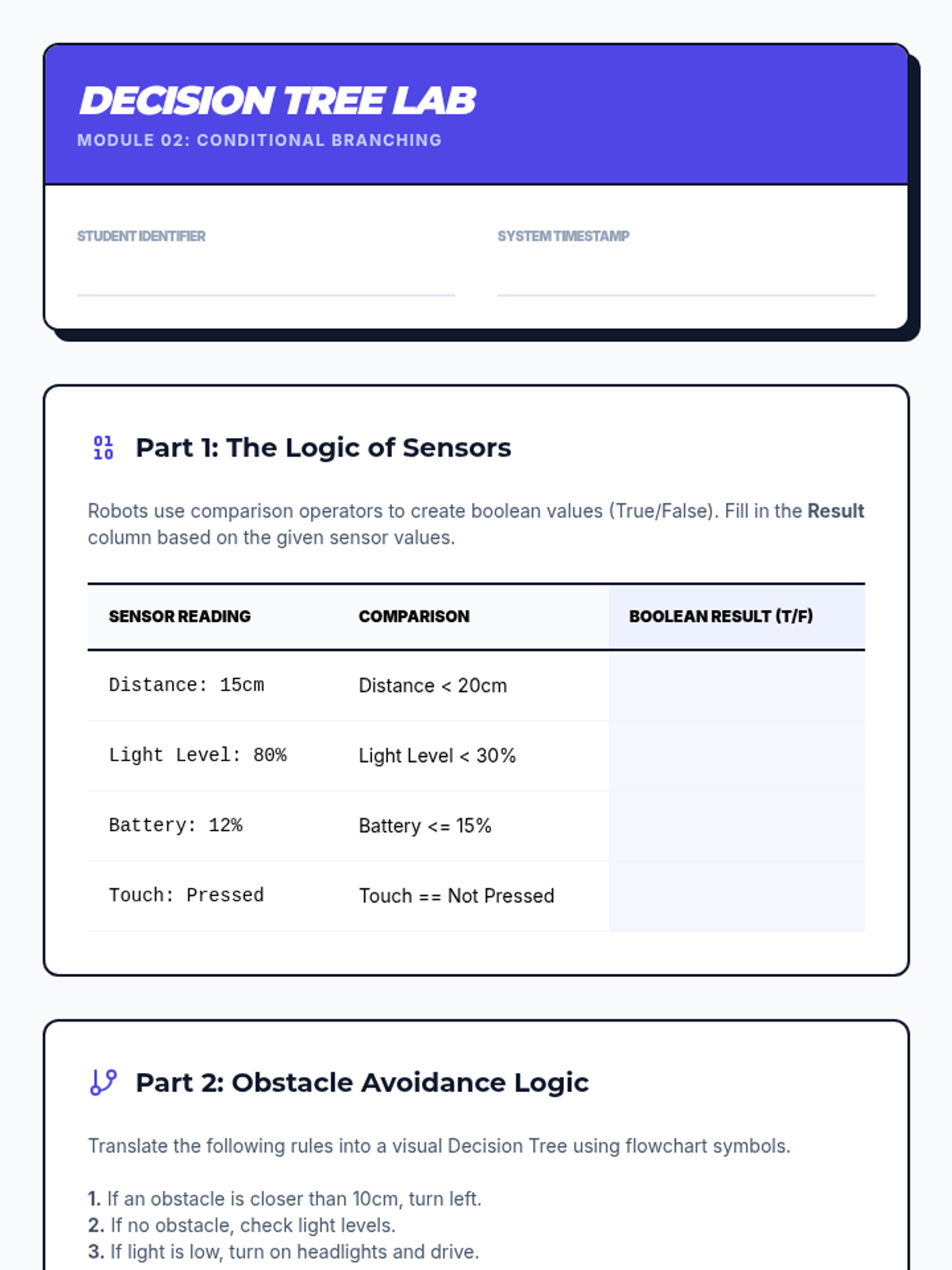 A comprehensive 9th-grade robotics sequence focusing on computational thinking. Students progress from basic algorithmic design and flowcharting to complex control logic, including conditional branching, iterative loops, modular functions, and finite state machines.