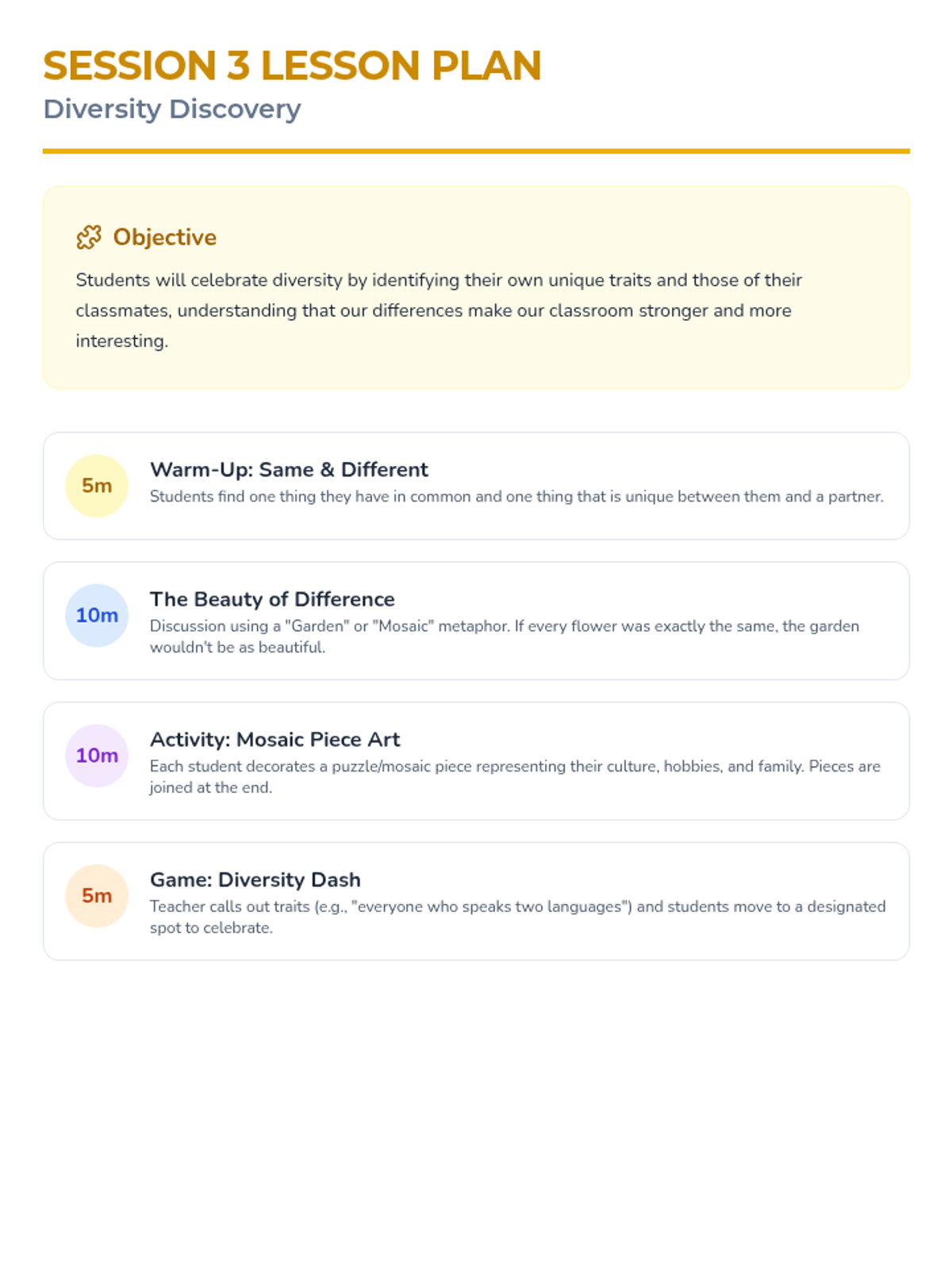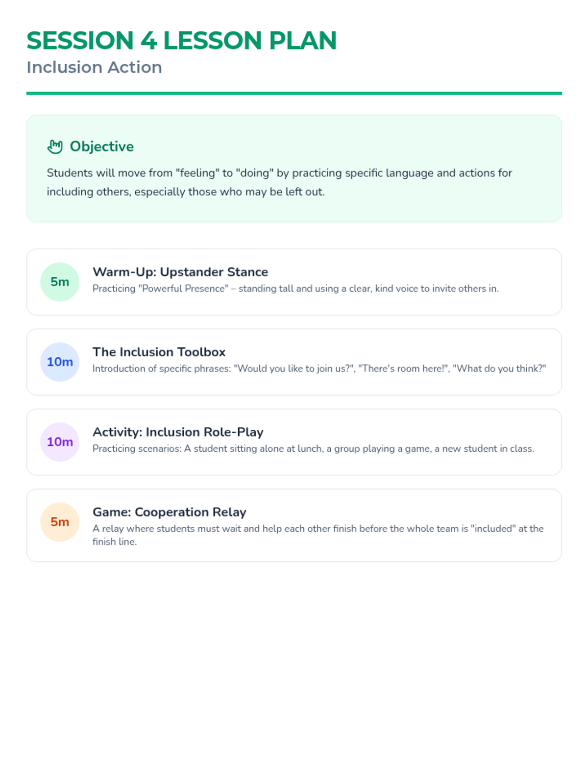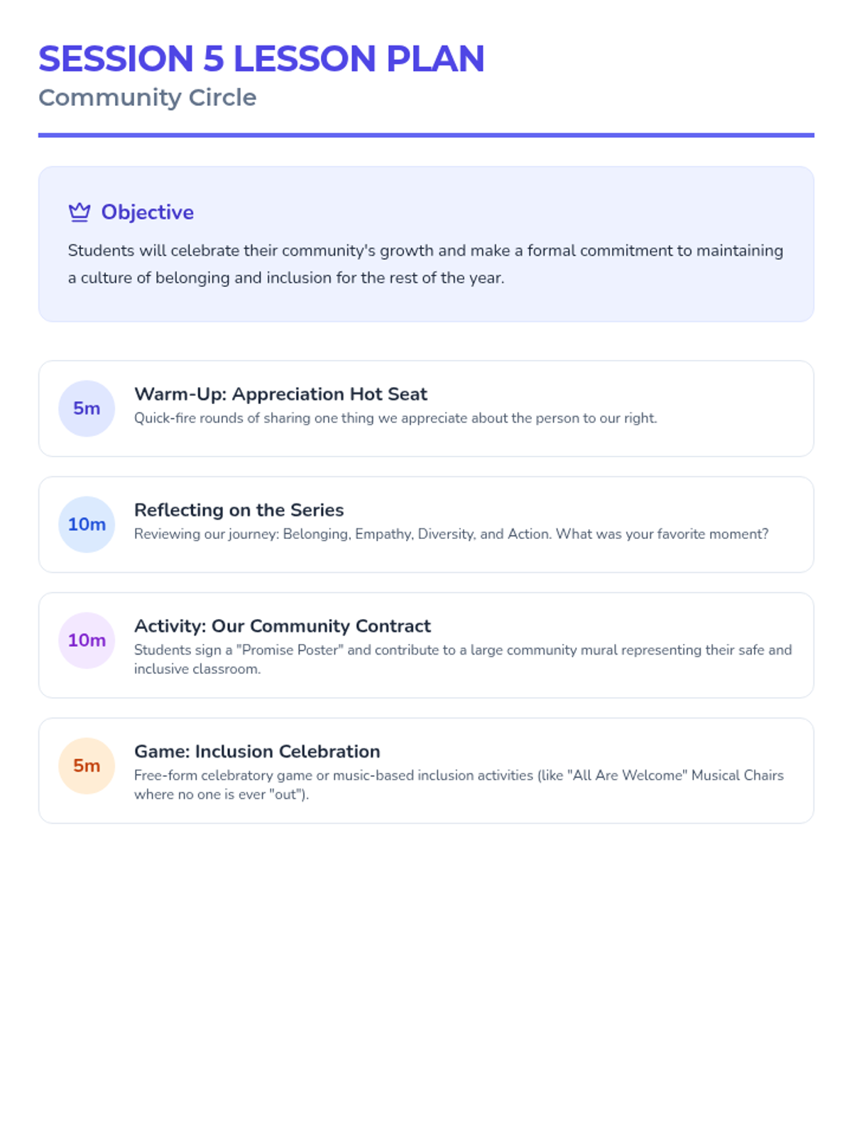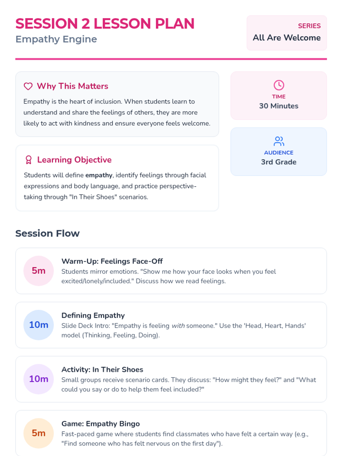 A 5-session series for 3rd graders focused on building belonging, empathy, and inclusion through interactive classroom activities. Students move from defining belonging to practicing active inclusion and celebrating their diverse community.