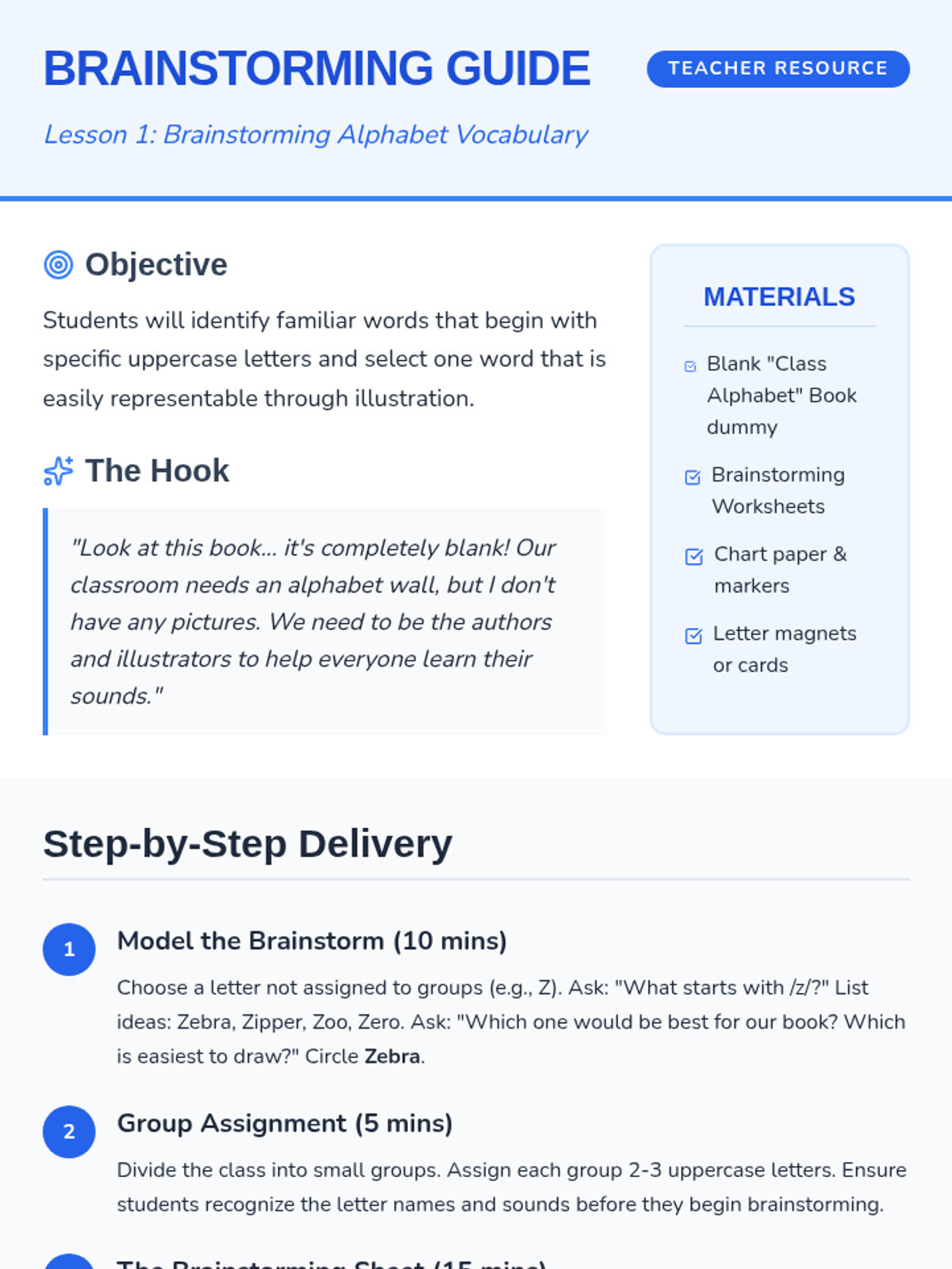 A project-based sequence where Kindergarten students collaboratively design a visual alphabet resource, moving from brainstorming to illustration and peer review to reinforce uppercase letter-sound associations.