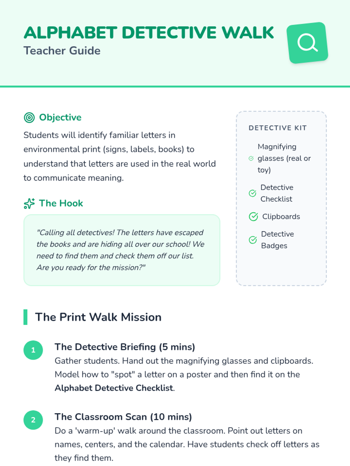 A Kindergarten sequence focused on visual literacy to teach prediction and inference. Students use picture clues from book covers and wordless stories to anticipate what happens next, developing critical thinking and observation skills through a 'Picture Detective' theme.