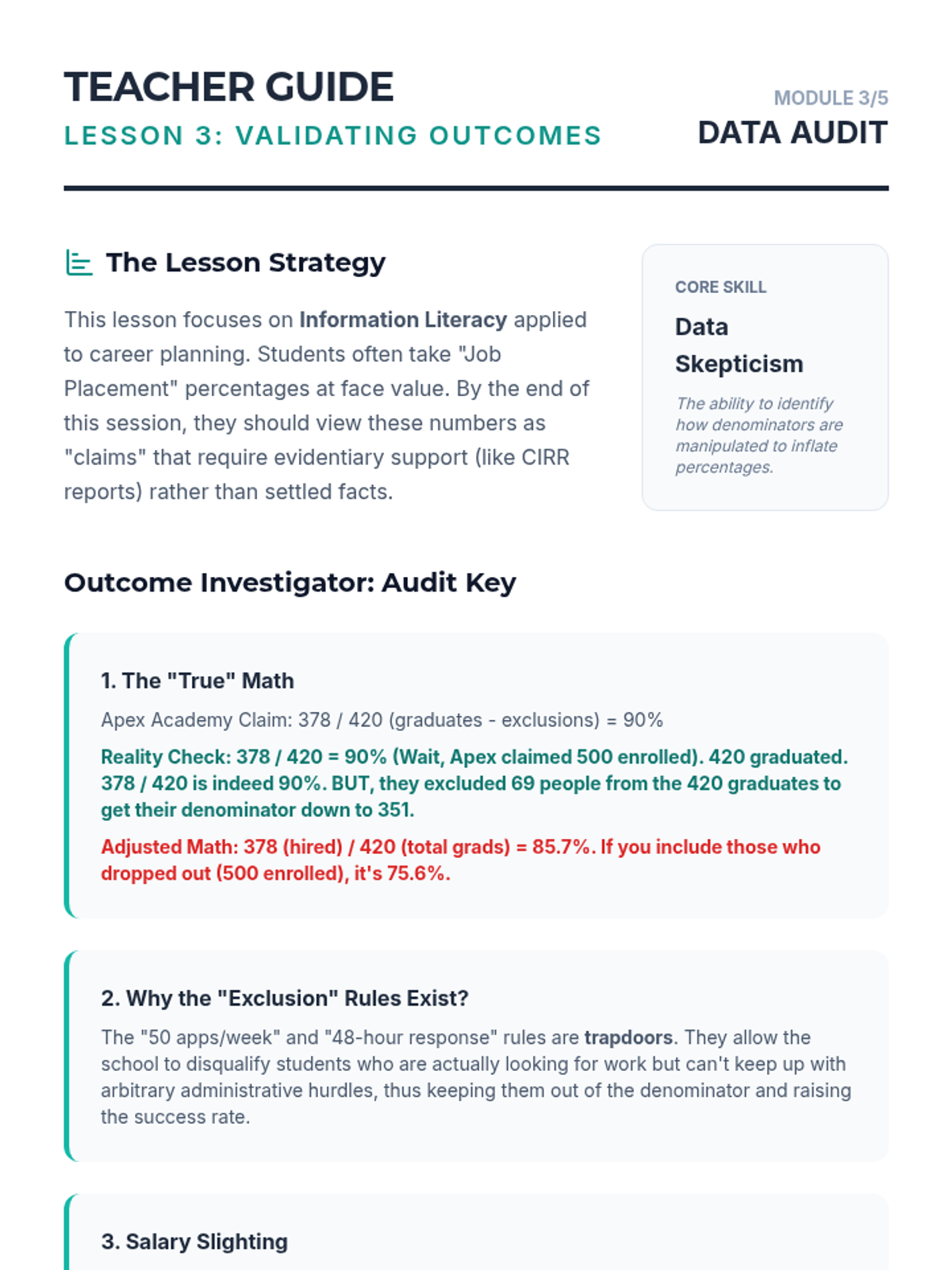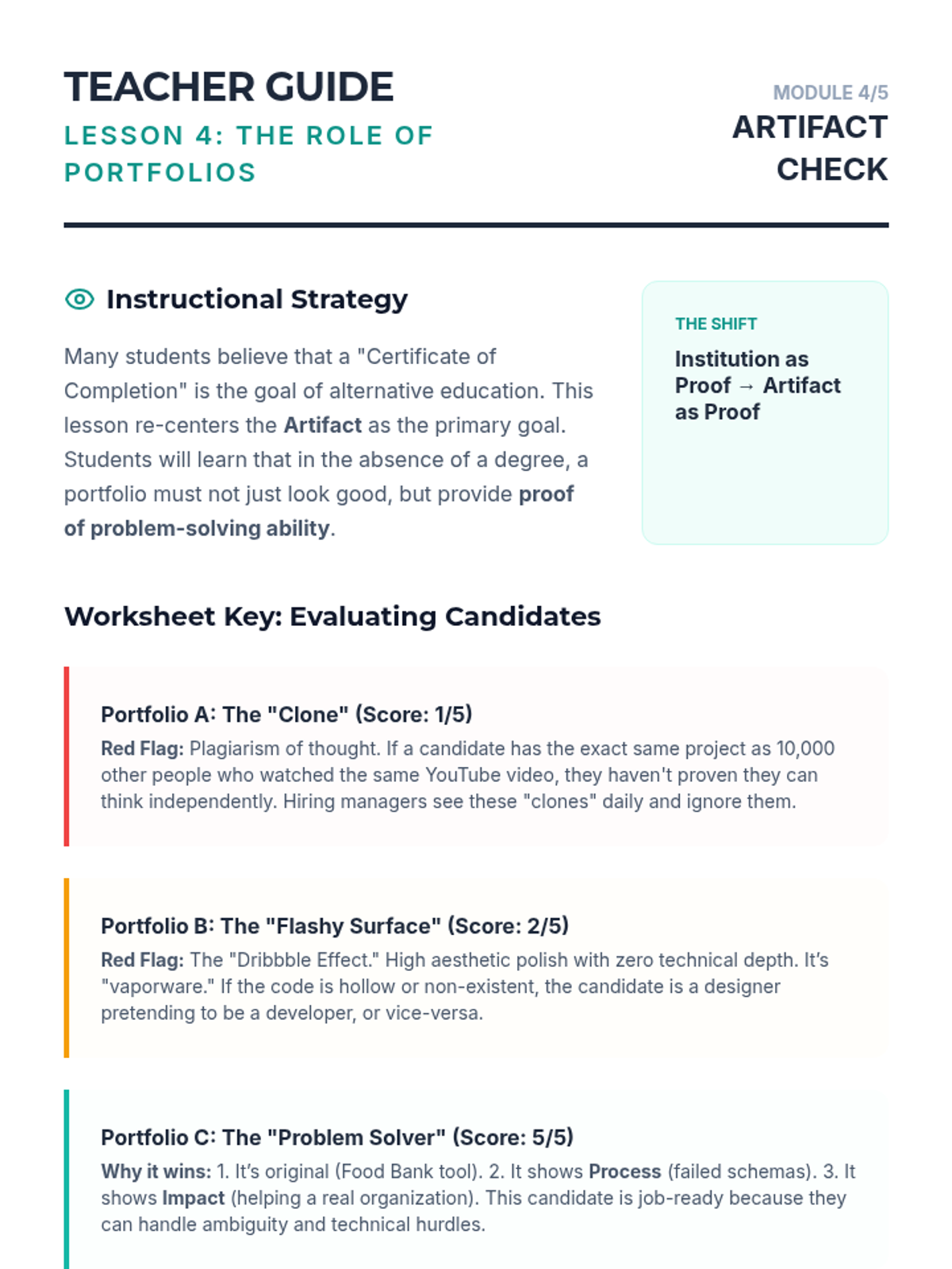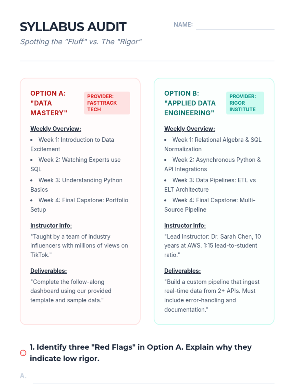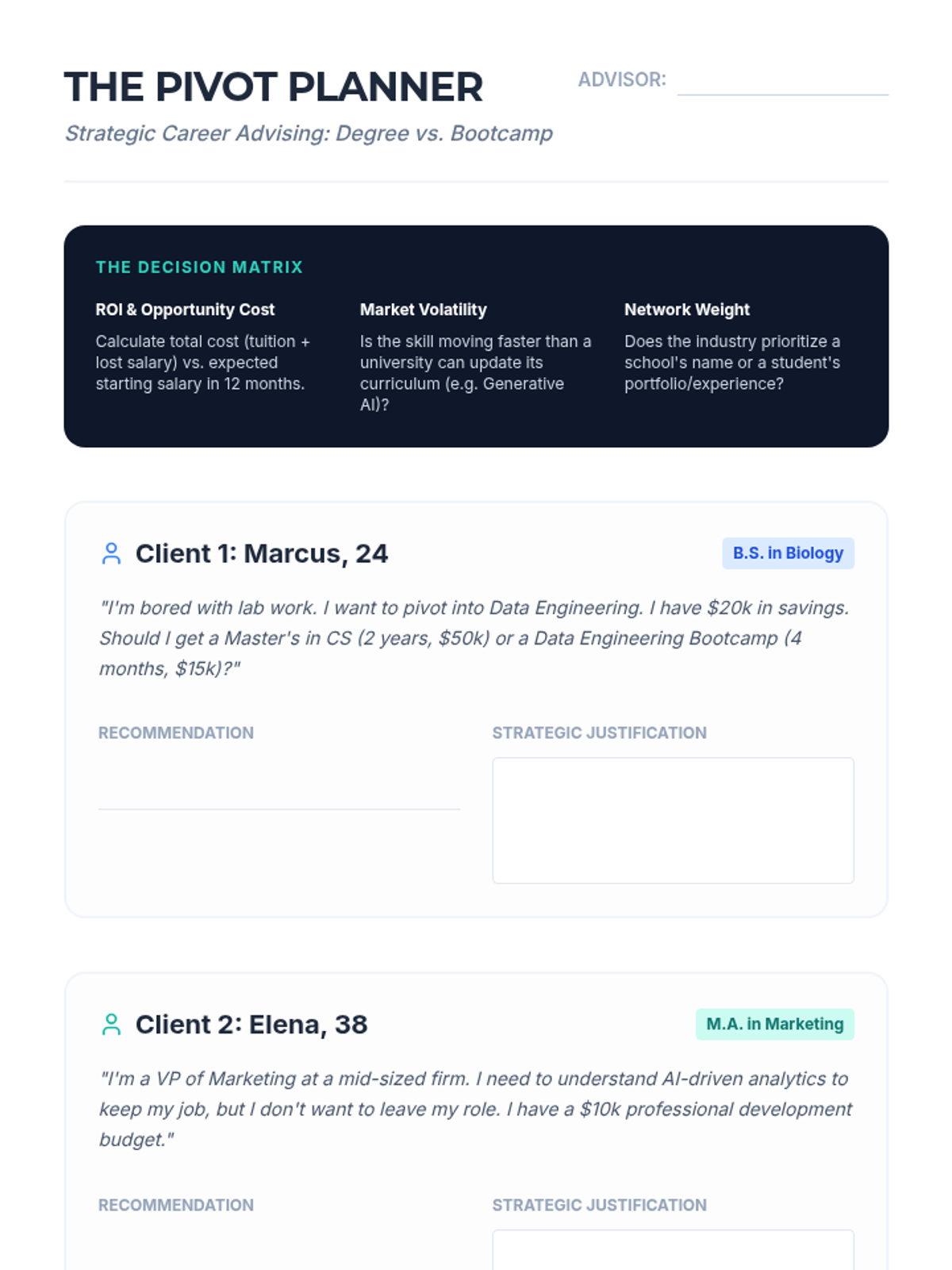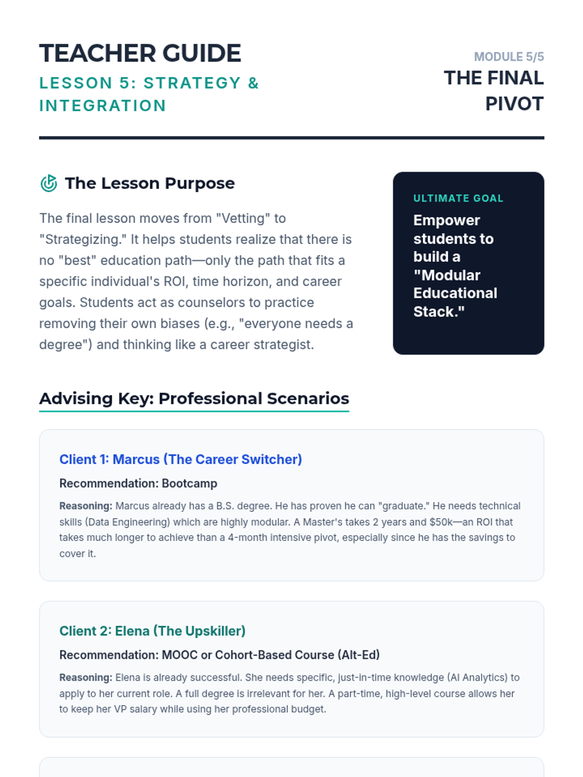 This sequence investigates the rapidly growing sector of non-traditional education, including coding bootcamps, MOOCs, and corporate training. Students learn to vet these pathways for quality, outcomes, and career alignment, moving from landscape survey to strategic decision-making.