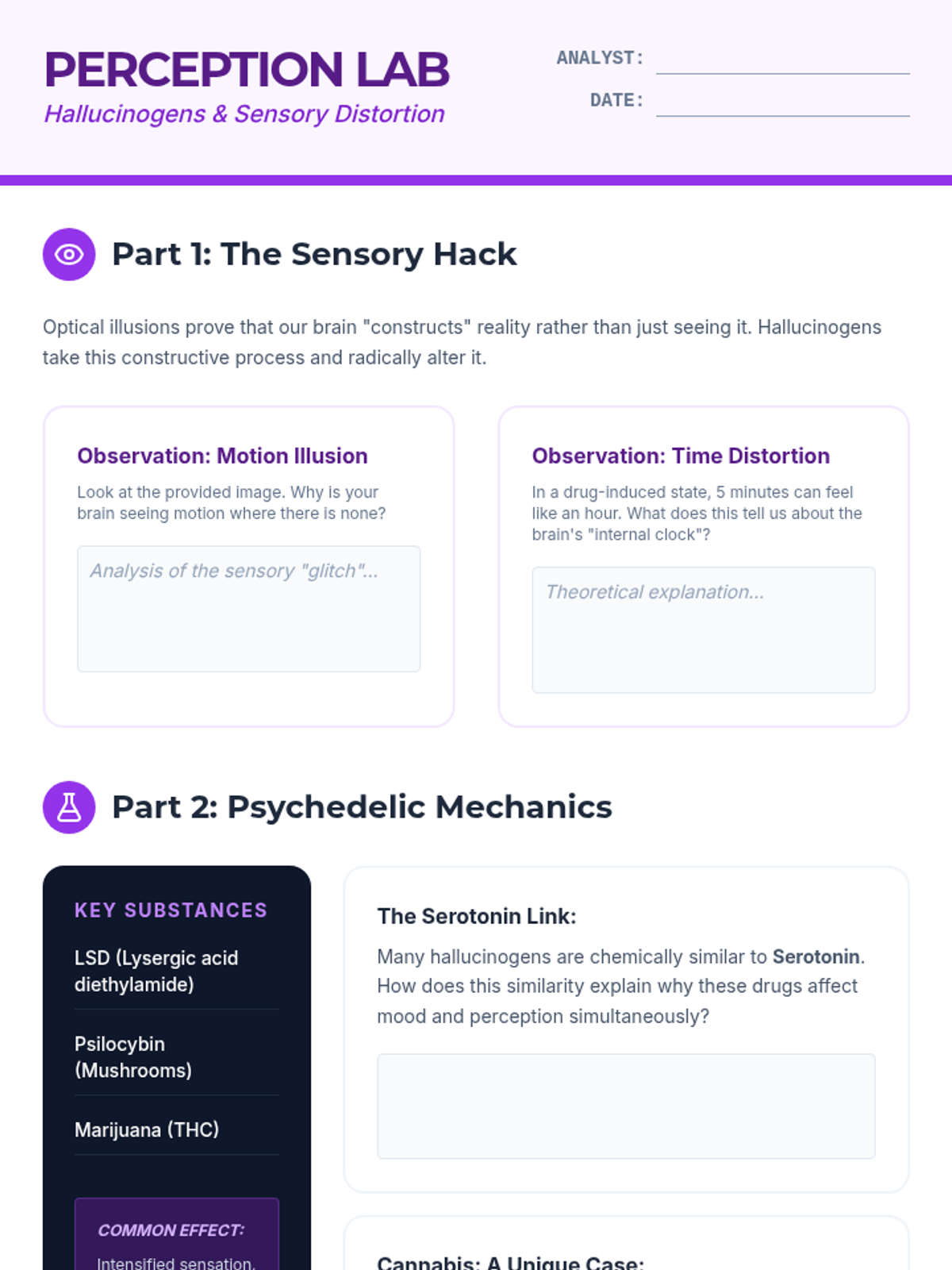 This 10th-grade psychology sequence explores altered states of consciousness, from hypnosis and meditation to the neurochemistry of psychoactive drugs and addiction. Students evaluate scientific theories, analyze physiological changes, and investigate the biological mechanisms that drive perception and dependence.