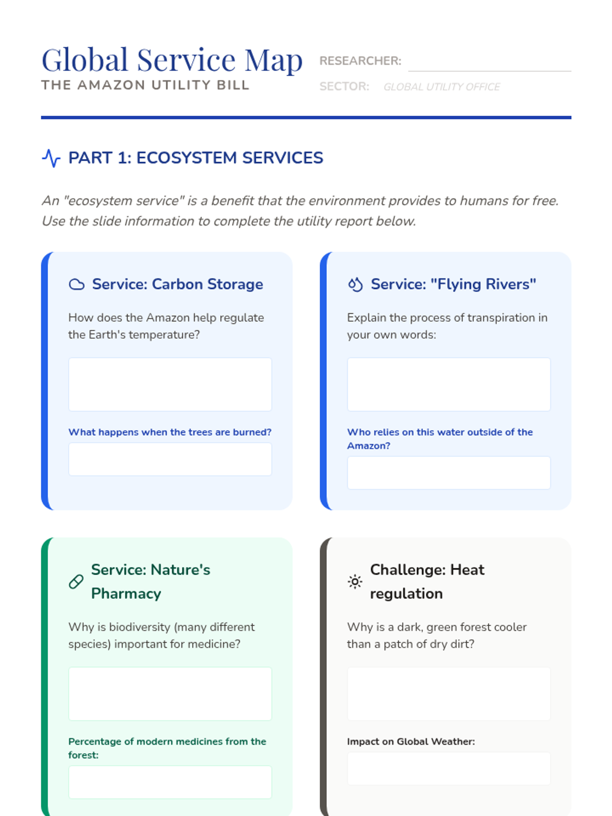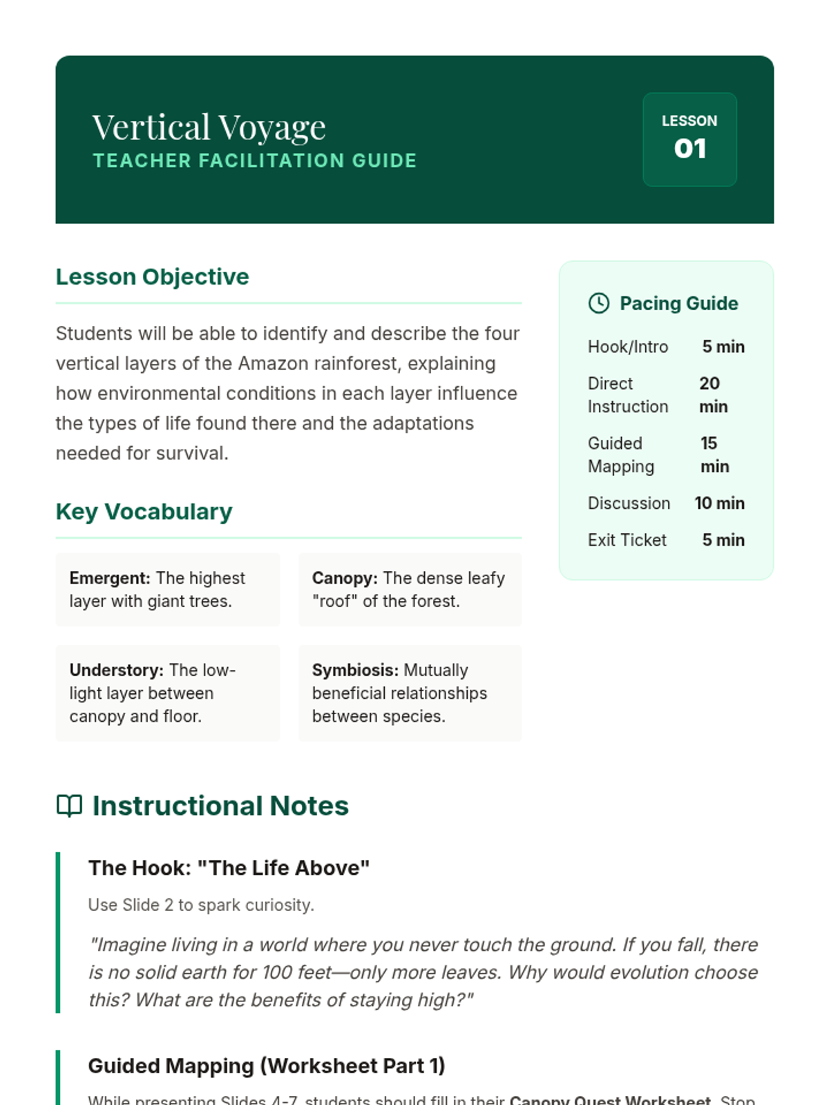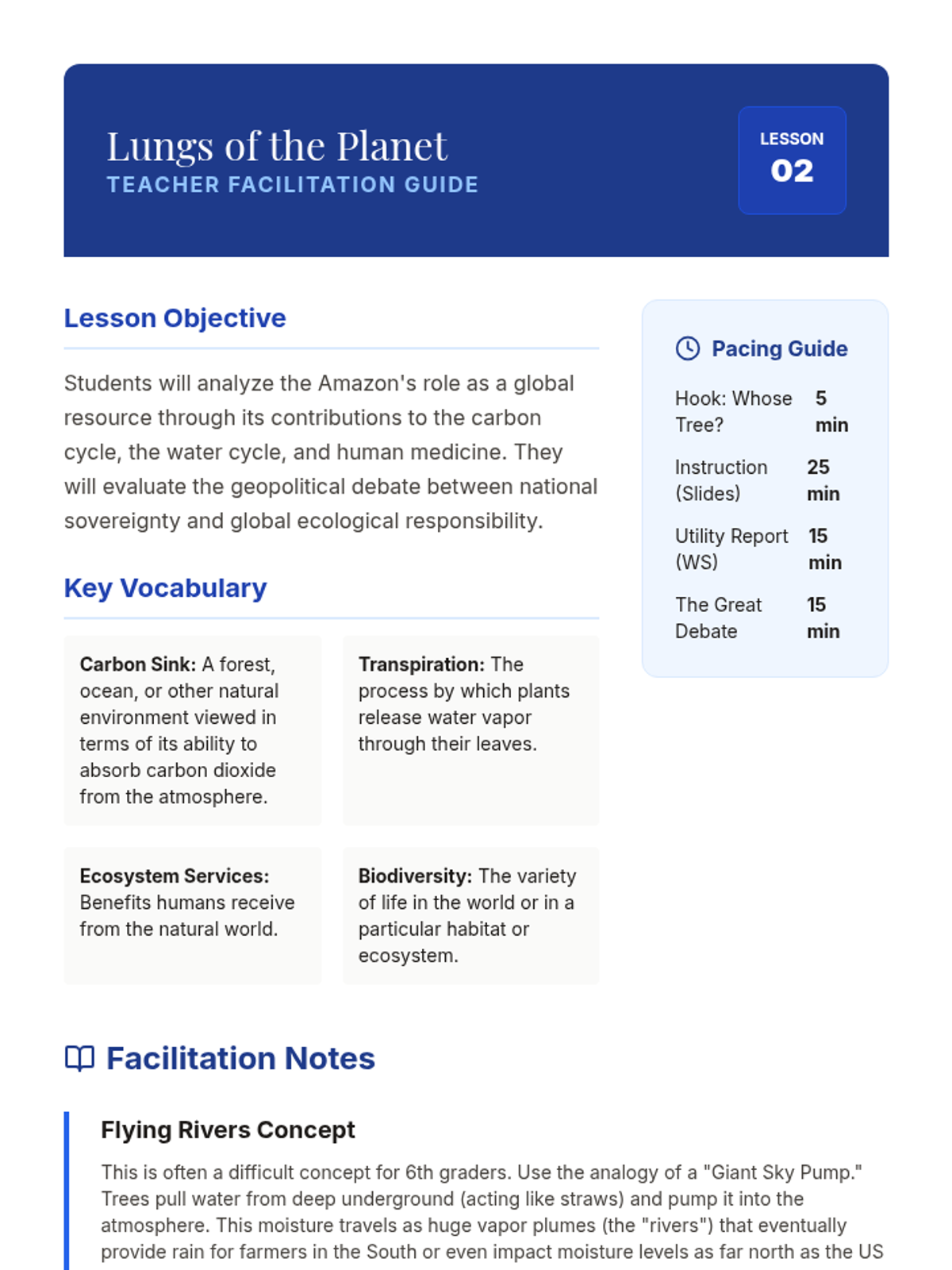A comprehensive 6th-grade geography sequence exploring the Amazon Rainforest through the lenses of ecology, global economics, and sustainability. Students analyze the rainforest's structure, its global importance, the drivers of deforestation, and participate in a stakeholder simulation to find balanced solutions for conservation and development.