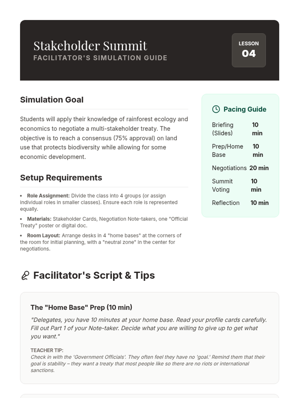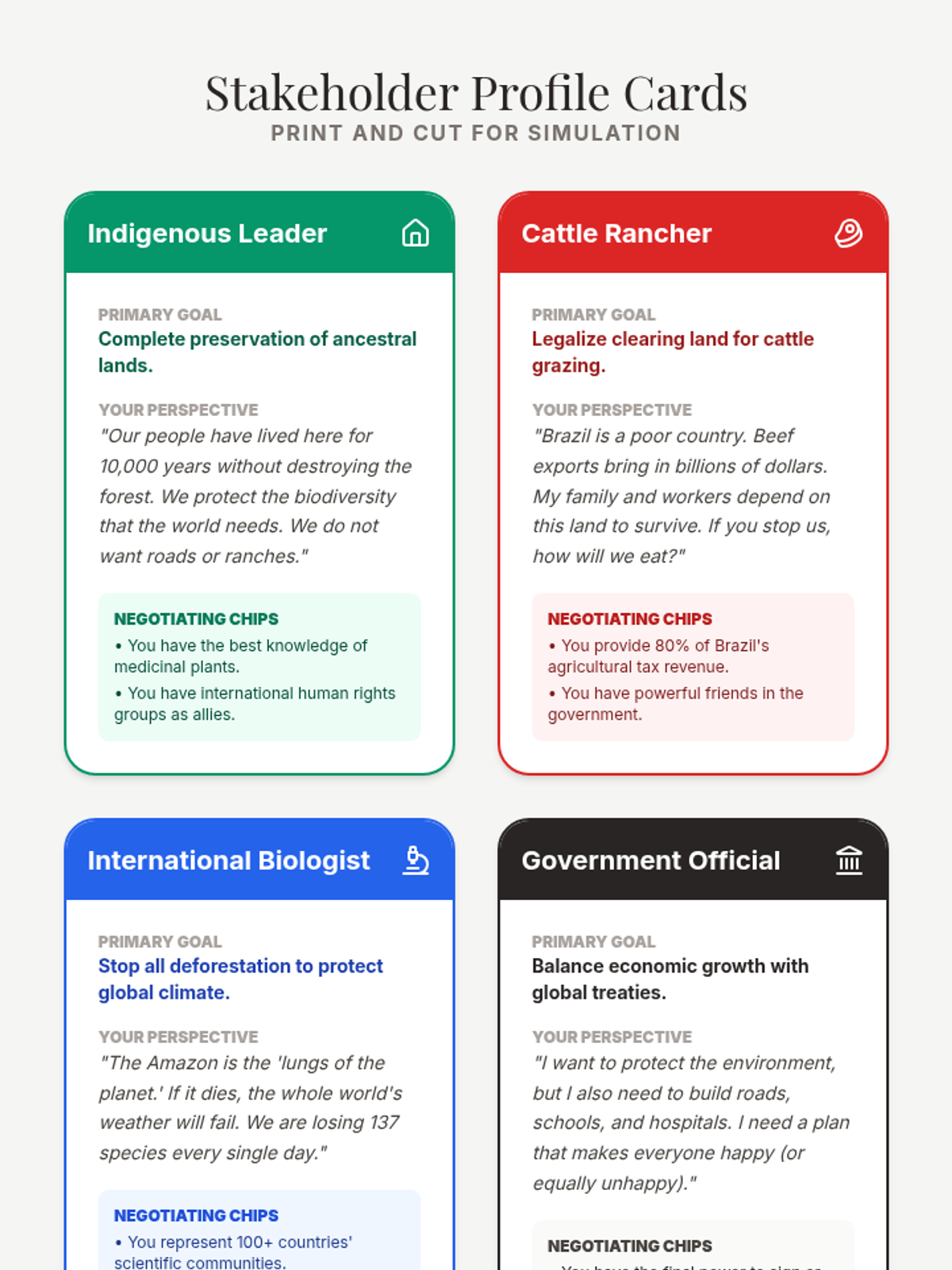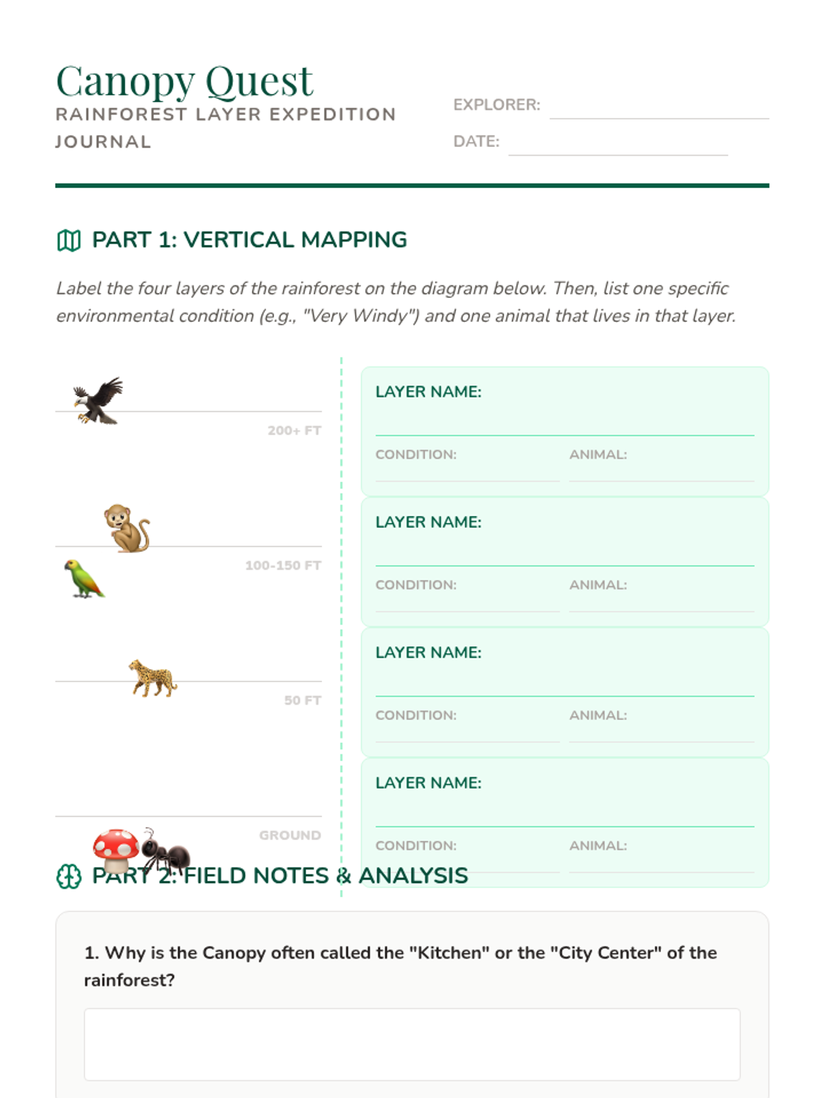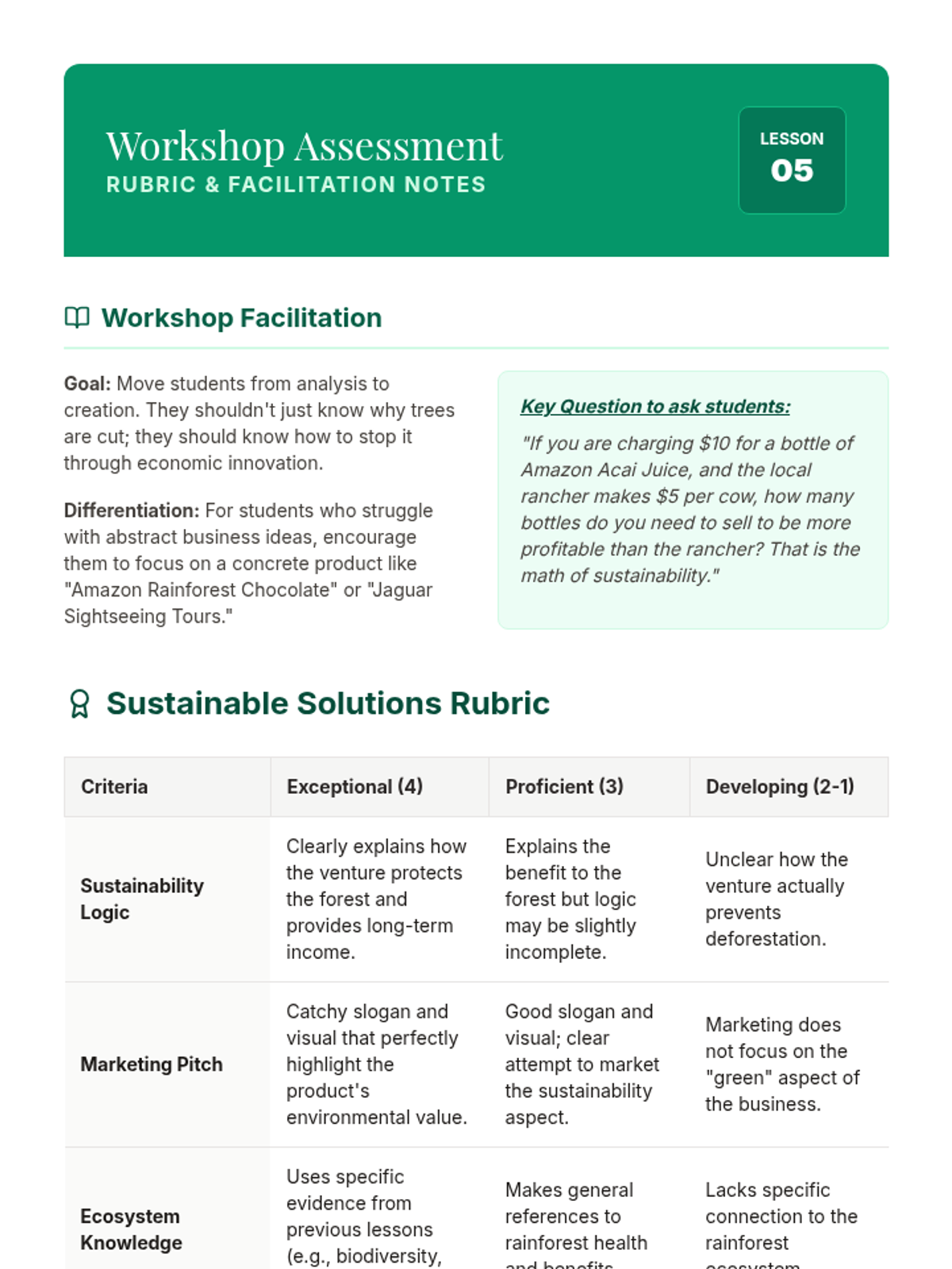 A comprehensive 6th-grade geography sequence exploring the Amazon Rainforest through the lenses of ecology, global economics, and sustainability. Students analyze the rainforest's structure, its global importance, the drivers of deforestation, and participate in a stakeholder simulation to find balanced solutions for conservation and development.