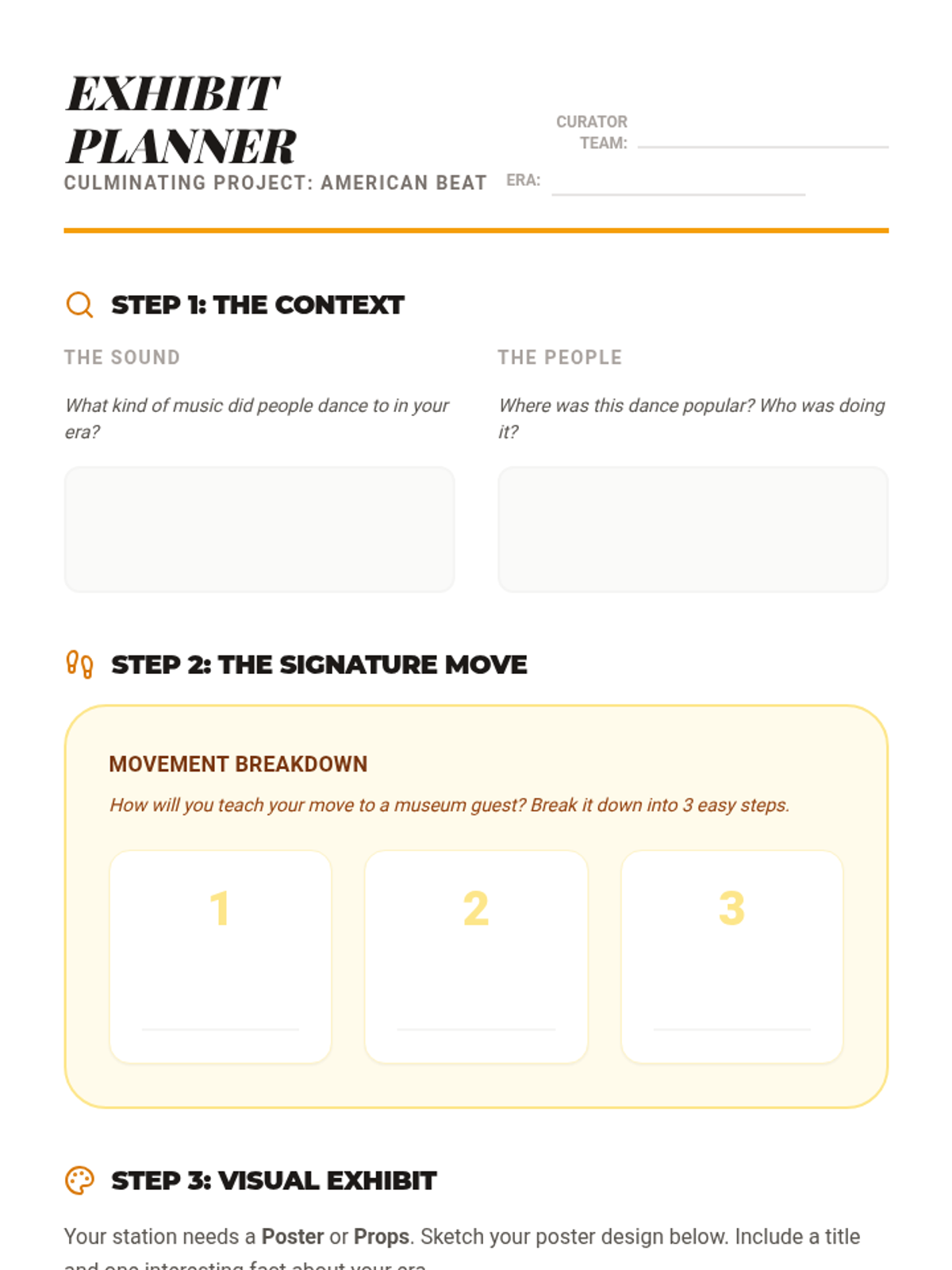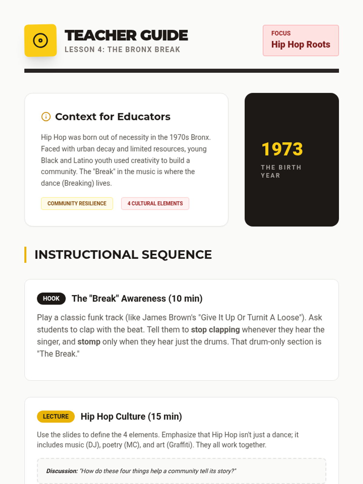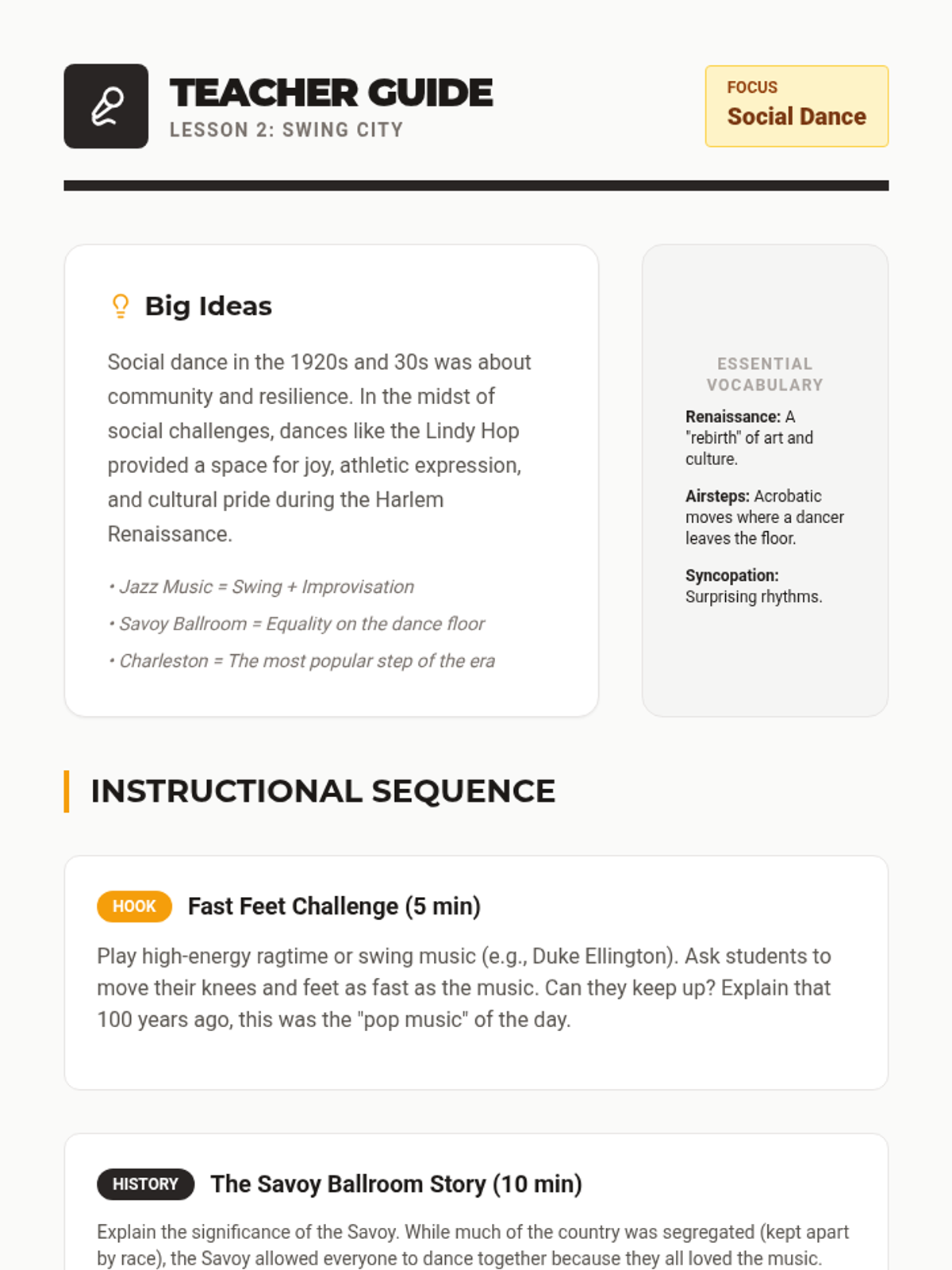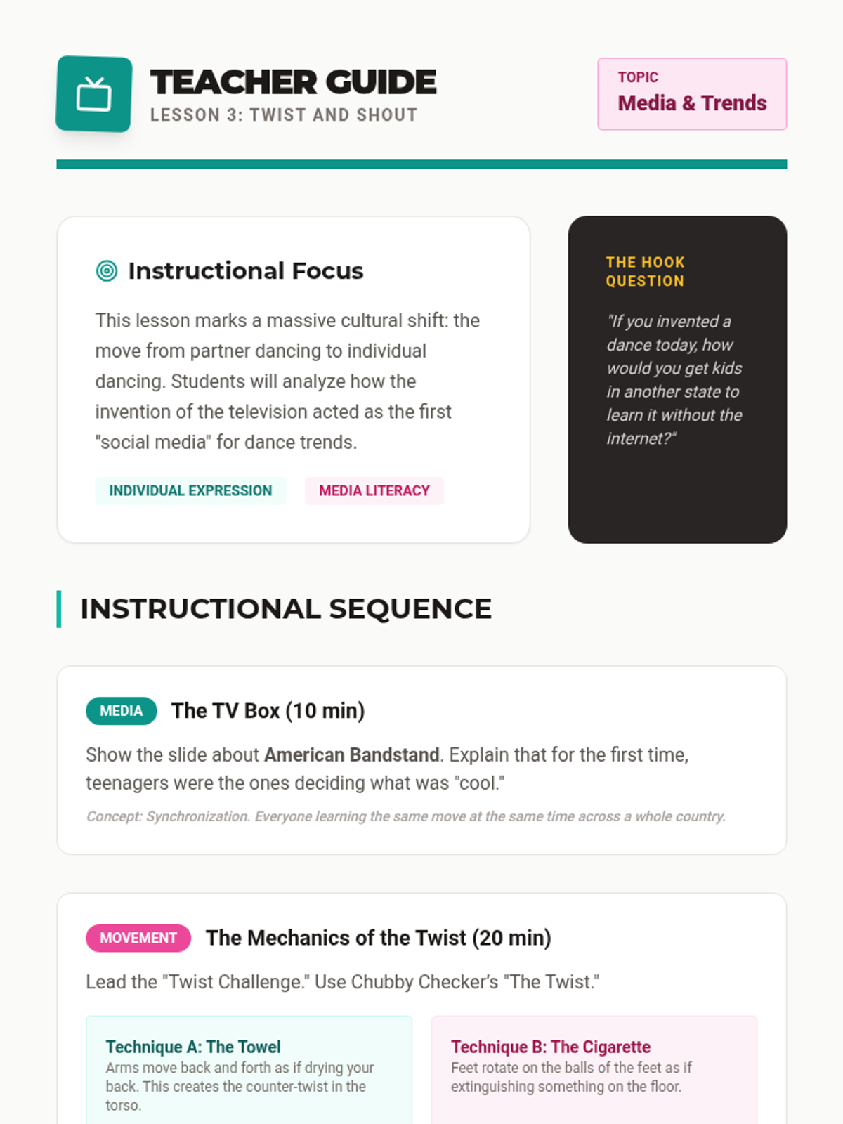 A 3rd-grade sequence tracing the evolution of American dance from the fusion of African and European traditions to the global impact of Hip Hop. Students explore how culture, music, and social changes shape the way we move.