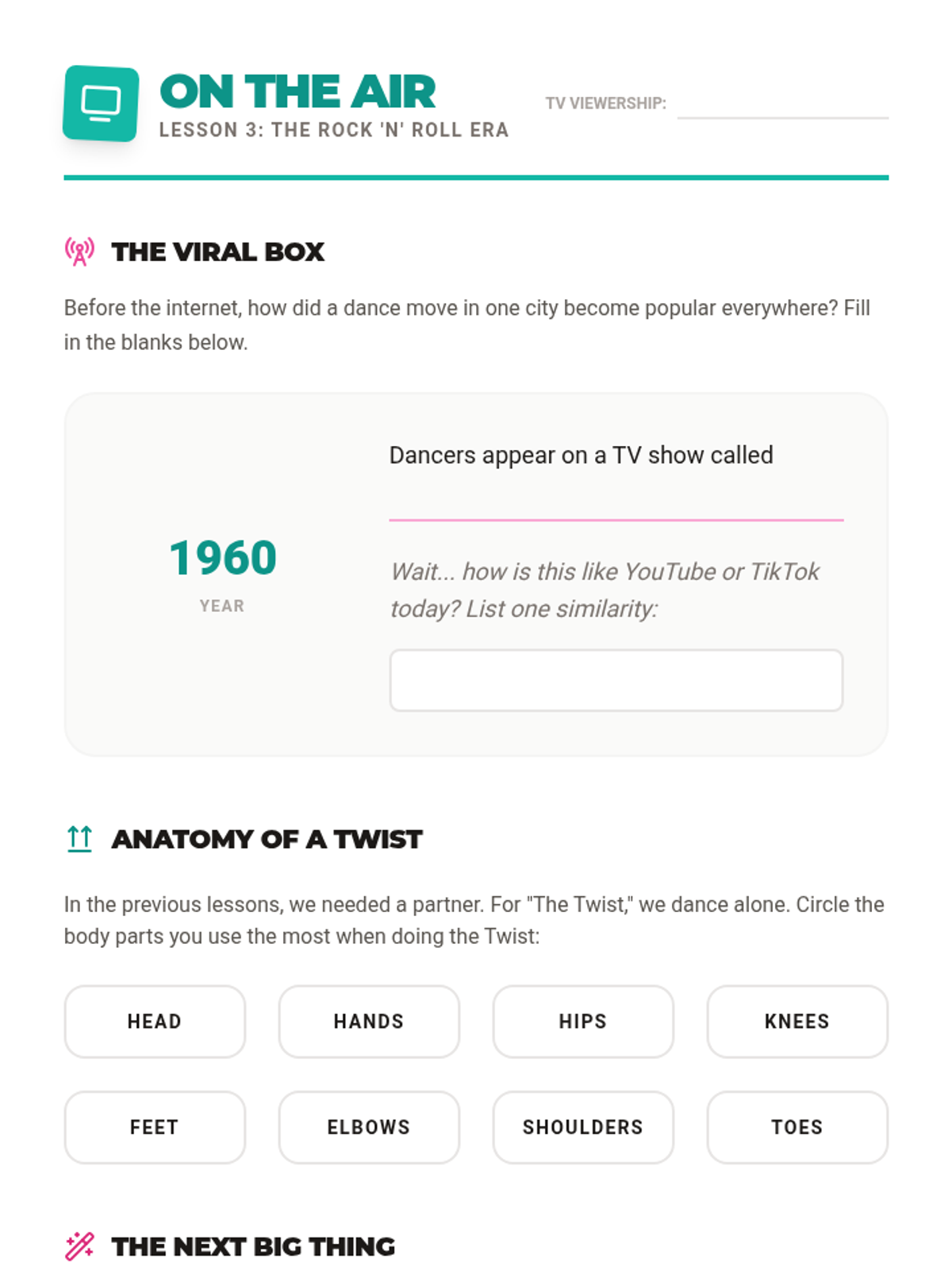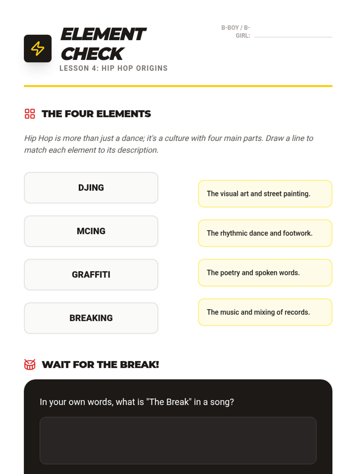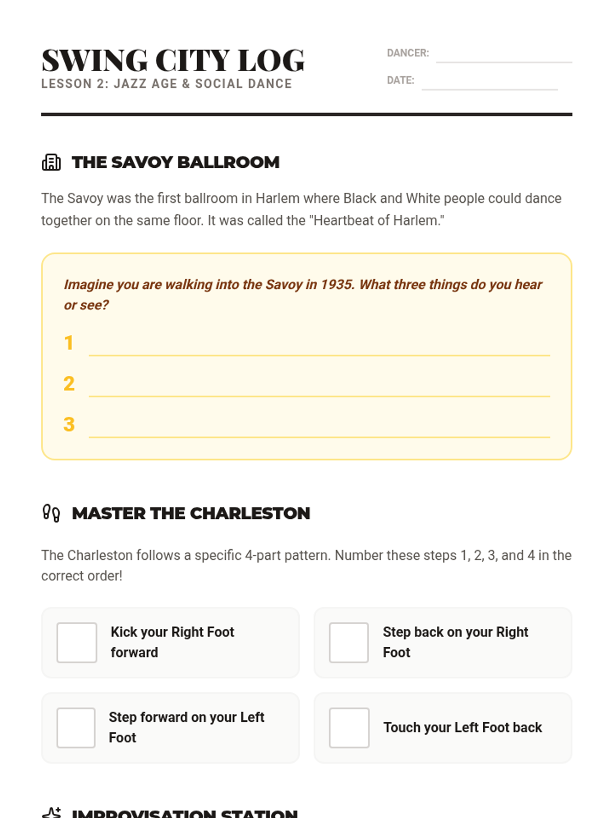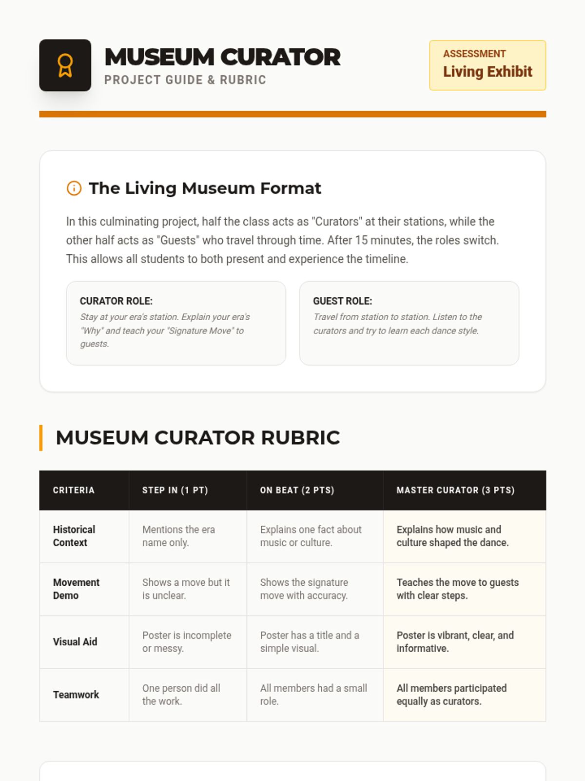 A 3rd-grade sequence tracing the evolution of American dance from the fusion of African and European traditions to the global impact of Hip Hop. Students explore how culture, music, and social changes shape the way we move.