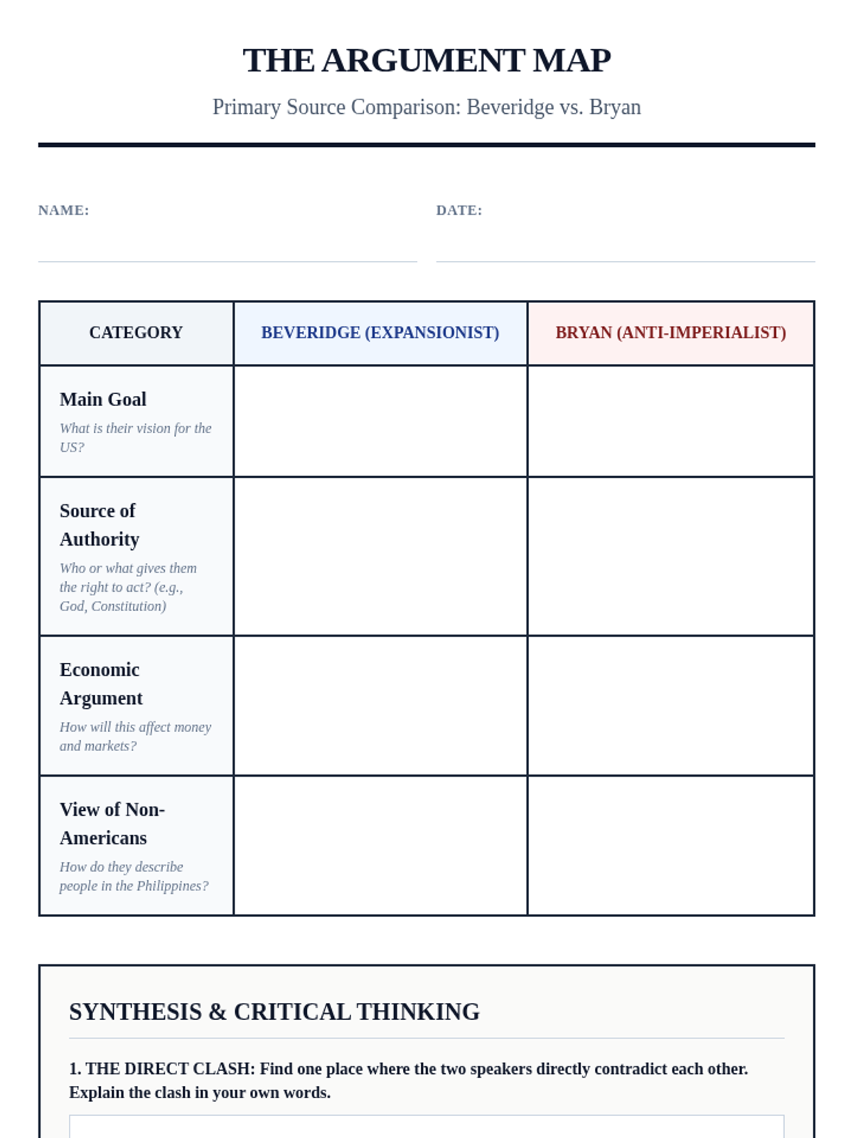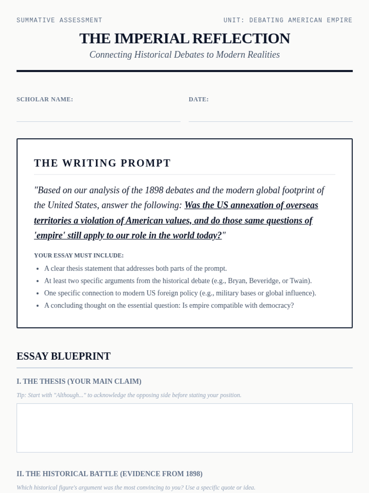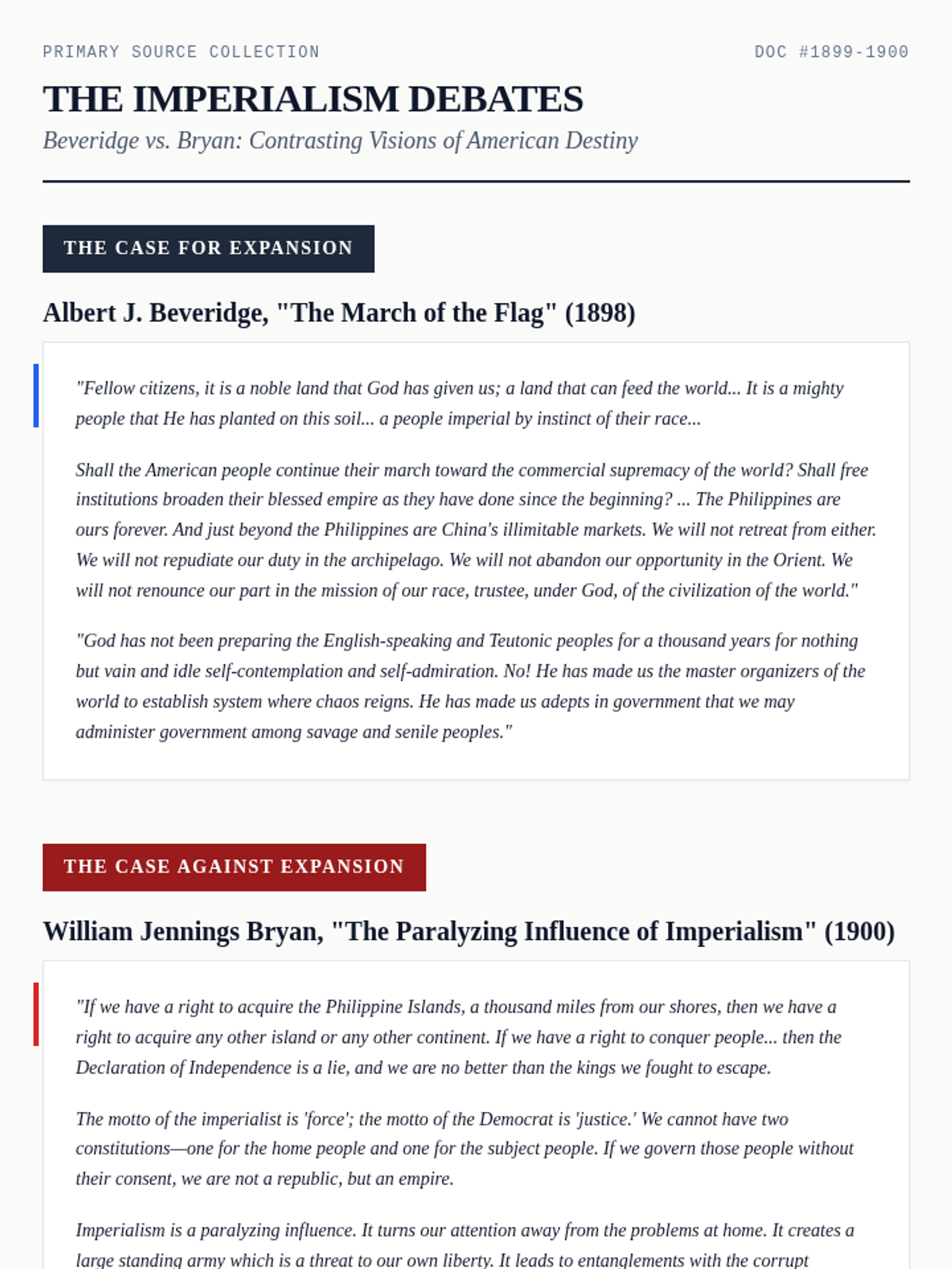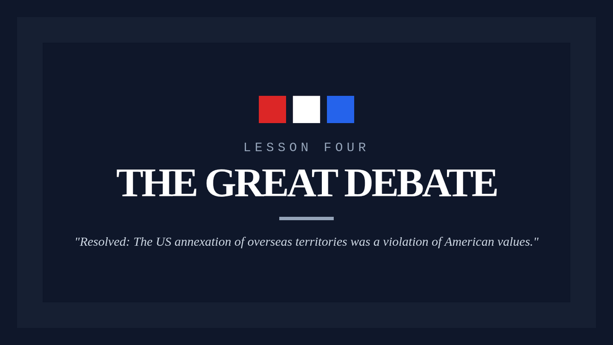 A rigorous 5-lesson unit for 9th graders exploring the domestic debate over US expansionism. Students analyze the Anti-Imperialist League, deconstruct primary source arguments, and engage in a formal debate on whether American imperialism is compatible with democratic ideals.