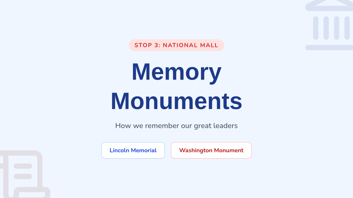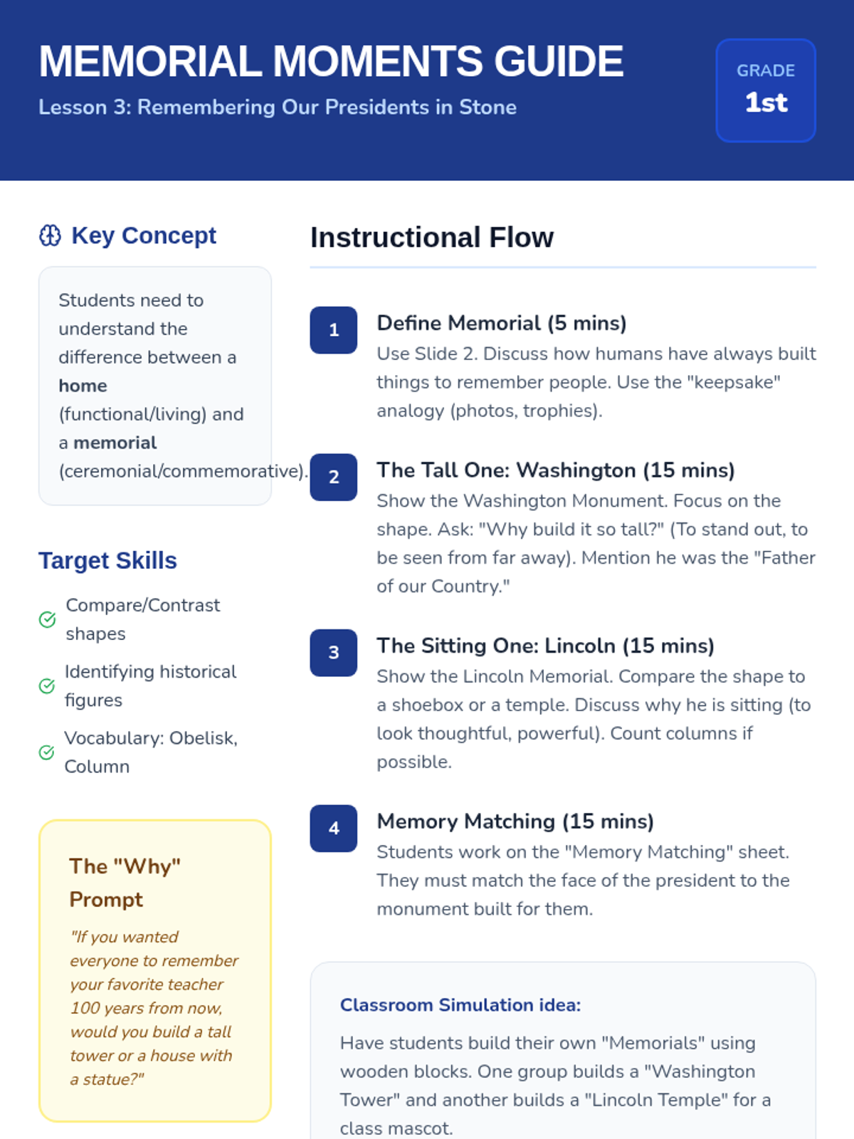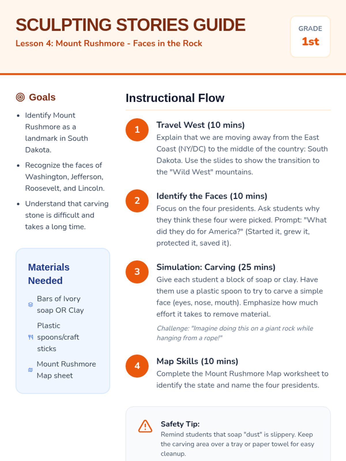 A 1st-grade geography and history sequence where students take a virtual field trip to iconic American landmarks. Through simulations and discussions, they explore the significance of the Statue of Liberty, the White House, D.C. memorials, and Mount Rushmore.
