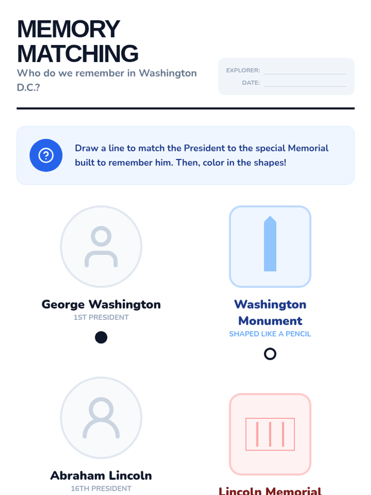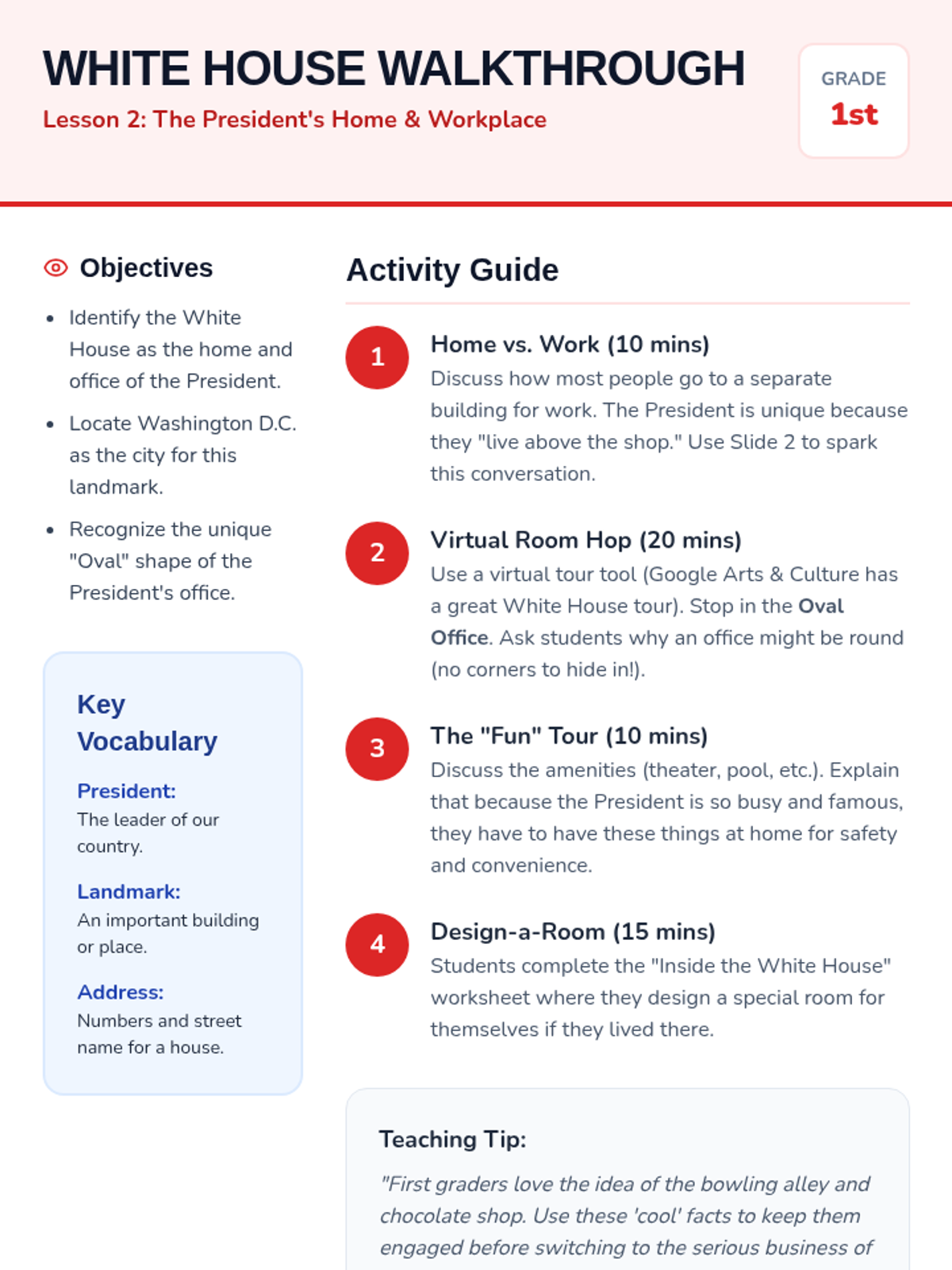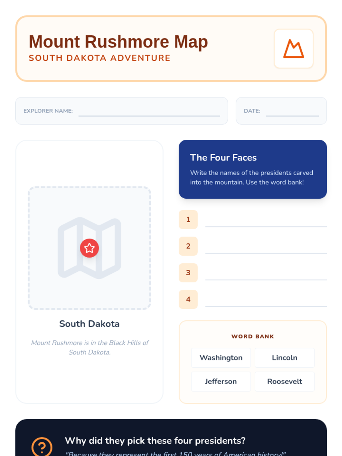A 1st-grade geography and history sequence where students take a virtual field trip to iconic American landmarks. Through simulations and discussions, they explore the significance of the Statue of Liberty, the White House, D.C. memorials, and Mount Rushmore.
